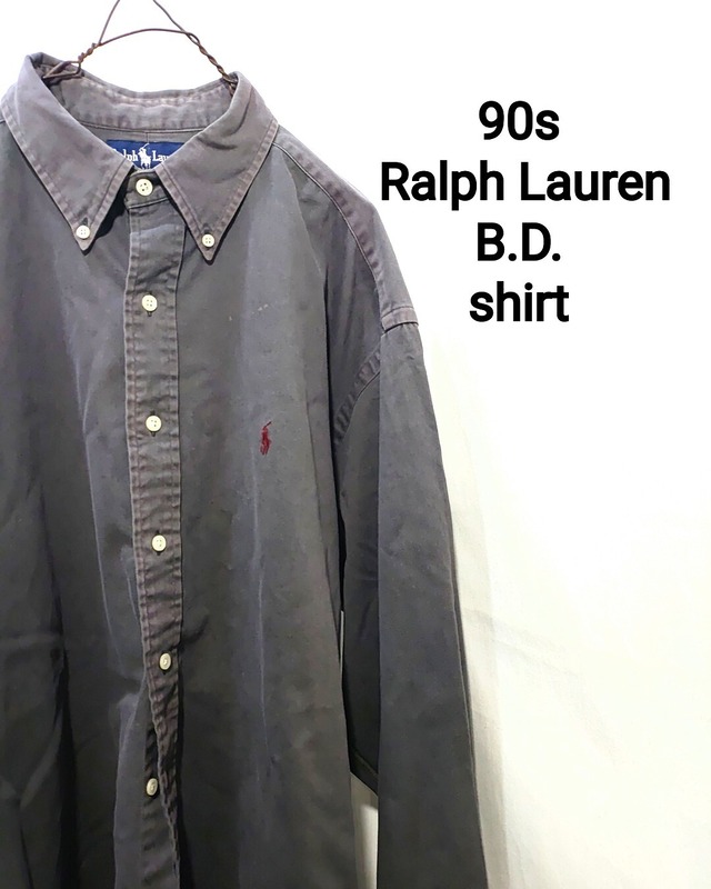 カラー チャコールブラック サイズ XL 平置き 着丈(襟元から裾)約87cm / 身幅(脇下から脇下)約72cm / 肩幅 約54cm / 袖丈 約63cm 90年代頃のオールド・ラルフローレンのボタンダウンシャツです。 元々のチャコールカラーがフェードにより絶妙に色落ちし、ビンテージライクな炭黒ボディへと変化した特殊で古着ならではのボディカラー。 ホルドーカラーのポニーロゴも良いアクセントになっています。 サイズはXLで、背中にボックスプリーツが入ったゆったりめの作りで"BLAKE"に近いモデルのビッグシルエットです。 数カ所薄汚れの様な部分はありますが、特に目立った汚れや大きなダメージもなく、フェードオンリーの良い個体です。