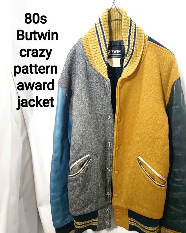 カラー クレイジーパターン(グレー、マスタード、ダークグリーン、サックスブルー) サイズ XS(実寸M-L程度) 平置き 着丈(襟元から裾)約65cm / 身幅(脇下から脇下)約53cm / 肩幅 約48cm / 袖丈 約64cm 70〜80年代頃のスタジャンの名門「BUTWIN(バトウィン)」の極めて珍しいクレイジーパターンのアワードジャケットです。 当時の既製品ではまず見かけない、前身頃の左右(グレー×マスタード)まで色が異なるクレイジーパターンのフル・アシンメトリー仕様。 フルスナップのショールカラー、キルティングライナー仕様で身頃はウール、袖レザー素材。 グレー、マスタード、ダークグリーン、サックスブルー、後身頃ネイビーの多色使いながらトーンが統一されており、ビンテージならではの重厚なオーラを放っています。 リブ周りの配色も異なり、ネイビー×マスタードのリブラインも特徴的です。 Butwinの80年代のタグに"The Jacket for Champions" という記載があるように当時のビジネスにおいて「既製品を売る」事よりも、「顧客の要望(色や形)に合わせて仕立てる」事に重きを置いていたと思われ、当時のButwinは、全米のスポーツショップを通じて学校などをメインに各団体向けにカスタムオーダーを受けていたので、この個体は当時のショップが客寄せ用のプロモーション・カラーサンプルとして作った非売品か、あるいは個人の富裕層がフルカスタムで発注した、カタログ外のイレギュラー品ではないかと推測します。 表記は「XS」ですが、当時のUSA製特有の作りで、実寸は「M-Lサイズ相当」の完璧なボックスシルエットです。 レザー部分にスレなどの小傷やウール部分にやや毛玉が出ていますが、着用に支障のある致命的なダメージはなくビンテージライクな雰囲気に仕上がっています。 スペシャルビンテージと言うほど古い個体ではありませんが、メジャーブランドのスタジャンの中でもかなり珍しく、探して見つかる物ではないと思いますのでこの機会に是非ご検討ください。