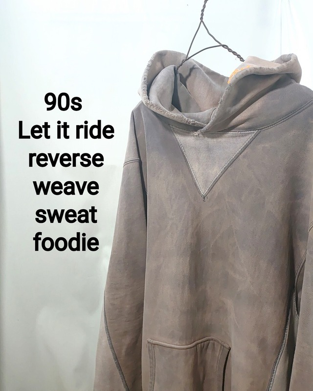 カラー ダスティー・ネイビー サイズ MEDIUM 平置き 着丈(襟元から裾)約70cm / 身幅(脇下から脇下)約55cm / 肩幅 約50cm / 袖丈 約52cm 90年代後期頃のレット・イット・ライドのリバースウィーブスウェットパーカーです。 レットイットライド(LET IT RIDE)は1993年に誕生した東京発のストリート系やアメカジ系のアイテムを展開していたブランド。 2003年にブランドは活動休止した為、同名義のアイテムを取得するには二次流通のみとなっています。 元々ビンテージライクなアイテムでしたが、長年の着用と環境によって生まれた、サンフェード(日焼け)とブリーチによる絶妙な退色で、「ナス紺」や「チャコール」が抜けたようなグラデーションは、計算では作れない唯一無二の表情。 ヘビーオンスの肉厚ボディでビンテージスウェットを彷彿とさせる首元のV字ガゼットとリバースウィーブ構造は70年代〜80年代頃のChampionリバースウィーブのオマージュかと思われ、フード縁には鮮やかなチェーンステッチのロゴ刺繍がちょっとしたアクセントに。 袖口のラフなカットオフ(切りっぱなし)仕様はレイヤードにも最適です。 やや特殊なのはサイドのアクションリブが脇下を通り袖先まで一続きで配された特殊なパターンになっているので染料の抜け方の違いから生まれるコントラストも絶妙です。 フェードしたカラーボディと首周りや裾、袖口などの細かな解れがいわゆる「ボロ(Boro)」としての完成度が極めて高い古着ならではの個体です。 リアルビンテージにも負けず劣らずなディテールでお好きな方も多いかと思われます。 一点物のジャパンビンテージを是非この機会にご検討ください。