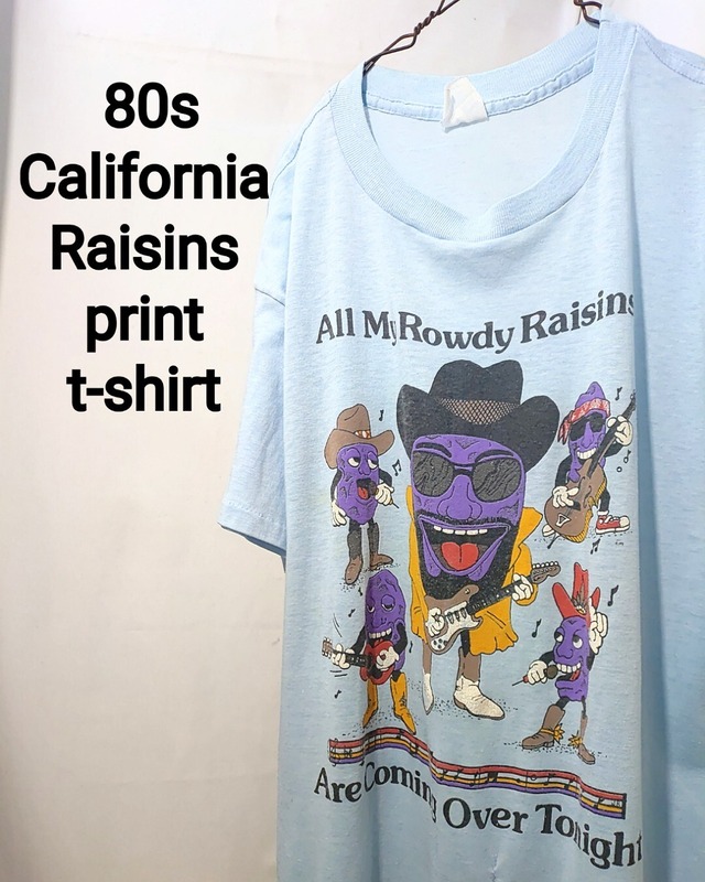 カラー ライトブルー サイズ 不明 (メンズM程度) 平置き 着丈(襟元から裾)約68cm / 身幅(脇下から脇下)約52cm / 肩幅 約50cm / 袖丈 約18cm 80〜90年代頃の「カリフォルニアレーズン」プリントTシャツです。 1986年から1994年にかけて、アメリカのテレビCMやアニメの特番などで人気の高いキャラクターでレーズン会社の販促キャラクターとしてR&Bグループとして音楽活動していた80年代を代表するアイコンです。 ボディは不明で袖裾共にシングルステッチの丸胴タイプ。 腹部にやや大き目のリペア痕がありますが、それ以外は特に目立った汚れや着用に支障のあるダメージはございません。