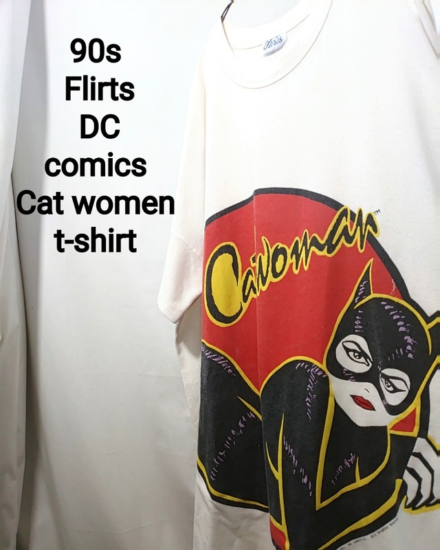 カラー ホワイト サイズ 不明(XXL程度) 平置き 着丈(襟元から裾)約85cm / 身幅(脇下から脇下)約74cm / 肩幅 約74cm / 袖丈 約11cm 80〜90年代頃のキャットウーマンのTシャツです。 キャットウーマンはDCコミックスの『バットマン』に登場するスーパーヴィラン及びスーパーヒロイン。 作品によってはバットマンと敵対したり情熱的に愛し合ったりとなかなか忙しないキャラクターです。 ボディは80〜90年代頃のガーフィールドやルーニーテューンズ系のキャラクターTシャツでよく見かける「Flirts」。 おそらくアメリカ製の袖裾共にシングルステッチの丸胴ボディ。 DCコミックス系では珍しいボディのかなと思います。 スーパービッグサイズでので、男性でもオーバーサイズのシルエット、女性ならワンピース感覚で着用いただけます。 全体的に使用感があり、やや薄汚れなどございますが、特に目立つ感じの汚れや大きなダメージはございません。