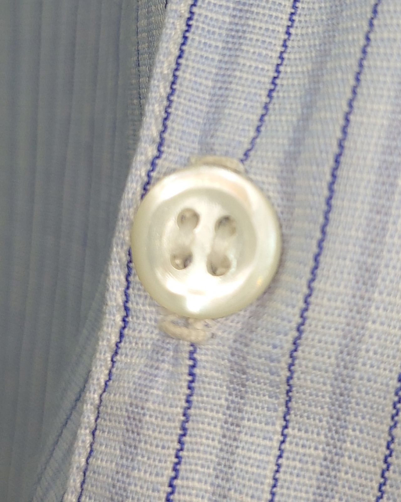 ボタンはシェルボタン、スリットにはマチが付き、耳付きの生地を使用。