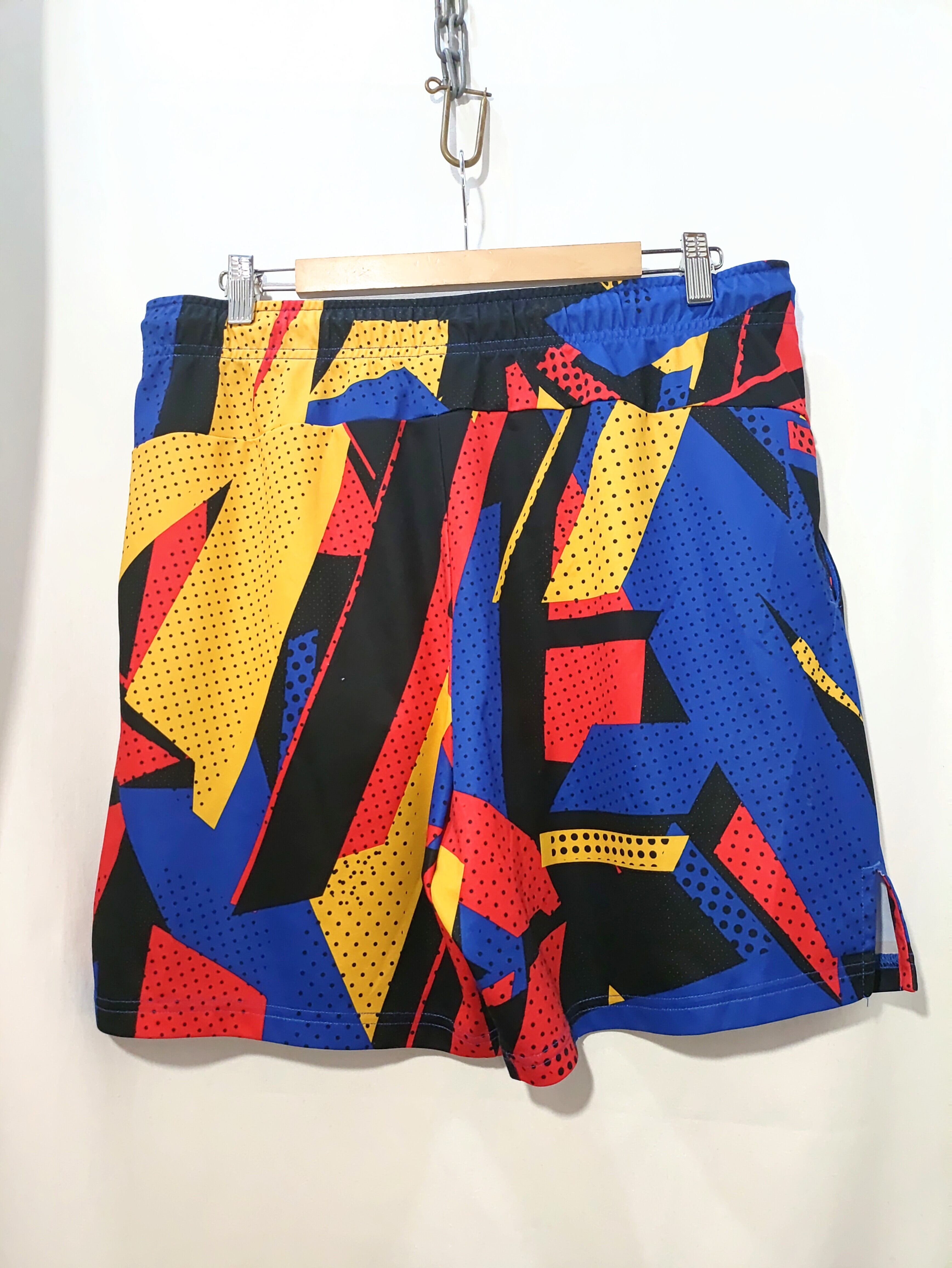 ドットと幾何学模様で赤・青・黄・黒のマルチカラーのド派手な配色。