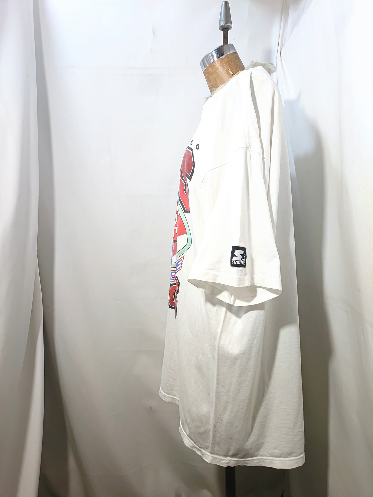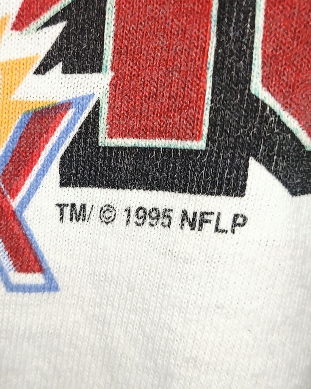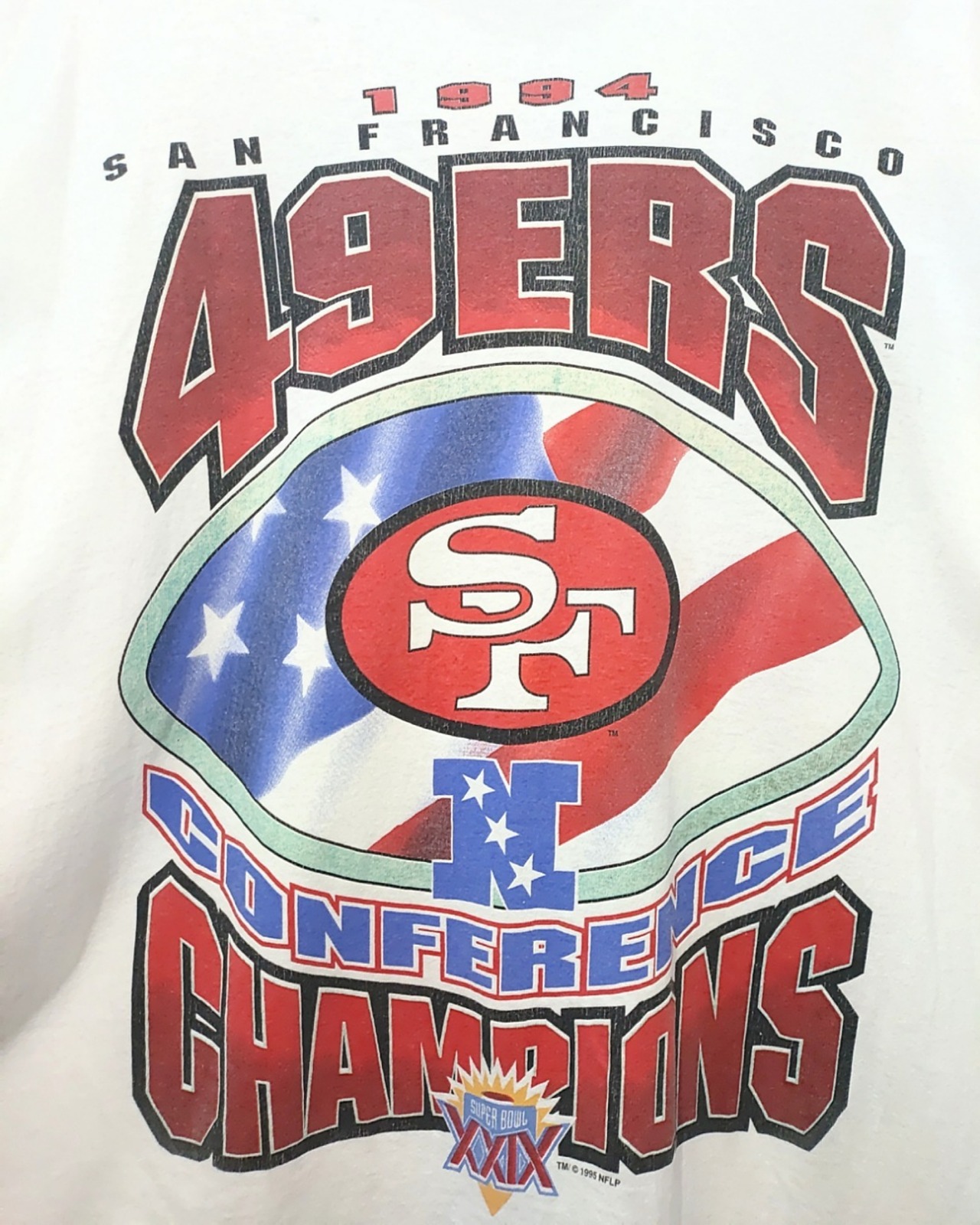1995年1月29日にアメリカ合衆国フロリダ州のジョー・ロビー・スタジアムで行われたアメリカンフットボール(NFL)の第29回スーパーボウルで、AFC王者サンディエゴ・チャージャーズとNFC王者サンフランシスコ・フォーティナイナーズが、 1994年シーズンのNFL王者を決める戦いで、フォーティナイナーズがチャージャーズを49対26で破り、スーパーボウル史上最多得点を記録し、フォーティナイナーズは5度のスーパーボウル優勝を果たす初のチームとなったメモリアルなTシャツです。
