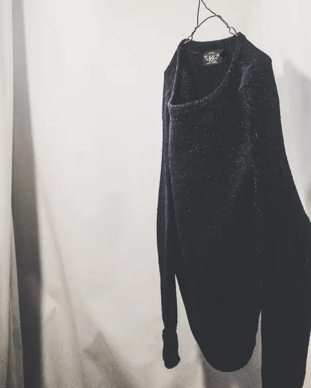 柔らかくて程よく重量感のあるニット地も心地よくビンテージの米軍ニットを彷彿させる針抜きのネックリブや長めの裾、袖リブ等クラシックな雰囲気が素敵な大人なアイテムです。