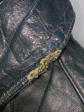 全体的に使用感があり、スレや小傷、長期保存によるシワはがあり、レザー自体もやや硬めですが、着用に支障はなくオイルアップしたり着込む事で柔らかく体に馴染んで来るかと思われます。