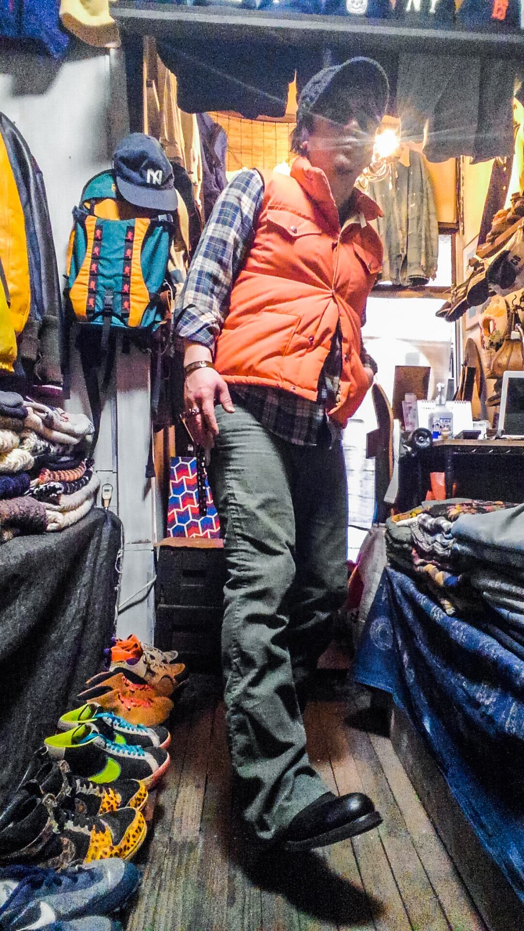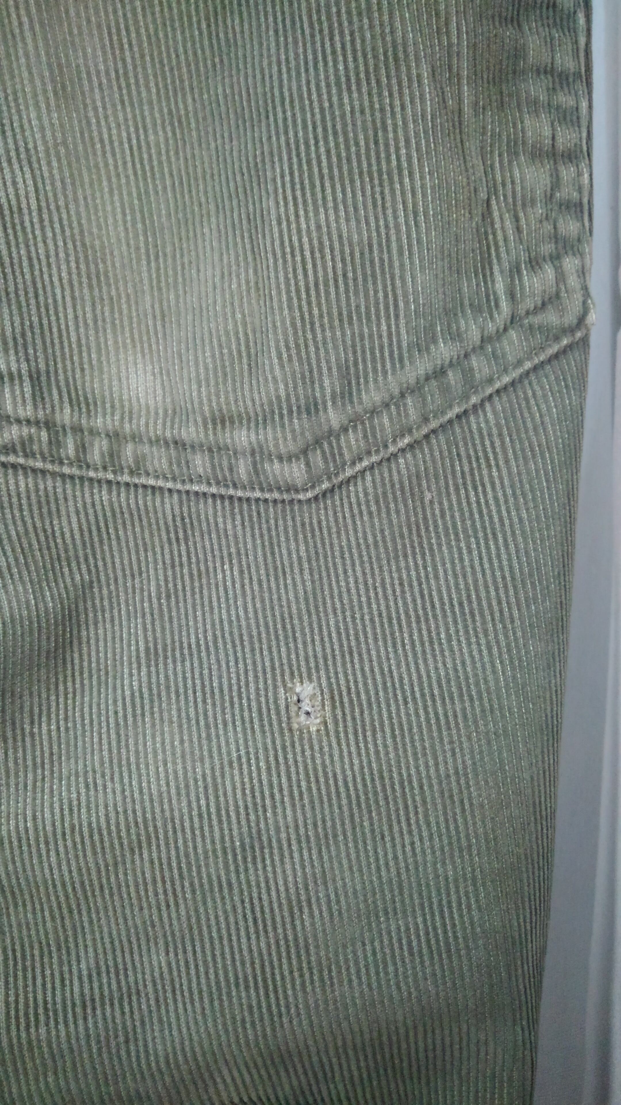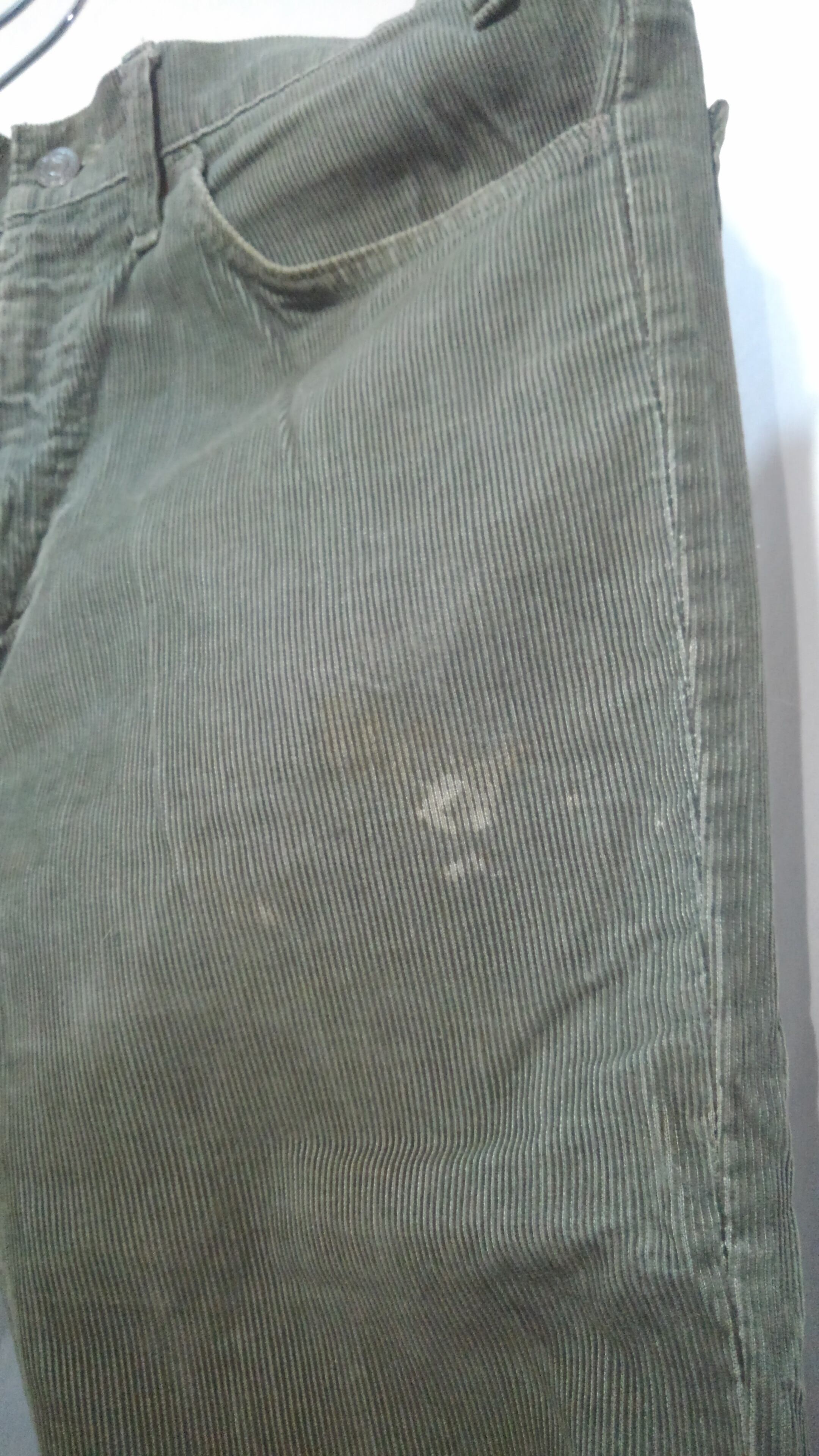状態は五円玉の穴程度の小さな穴がバックポケットした辺りに一ヶ所と左モモ辺りに薄汚れがありますが、全体的に色褪せており、雰囲気は抜群です。