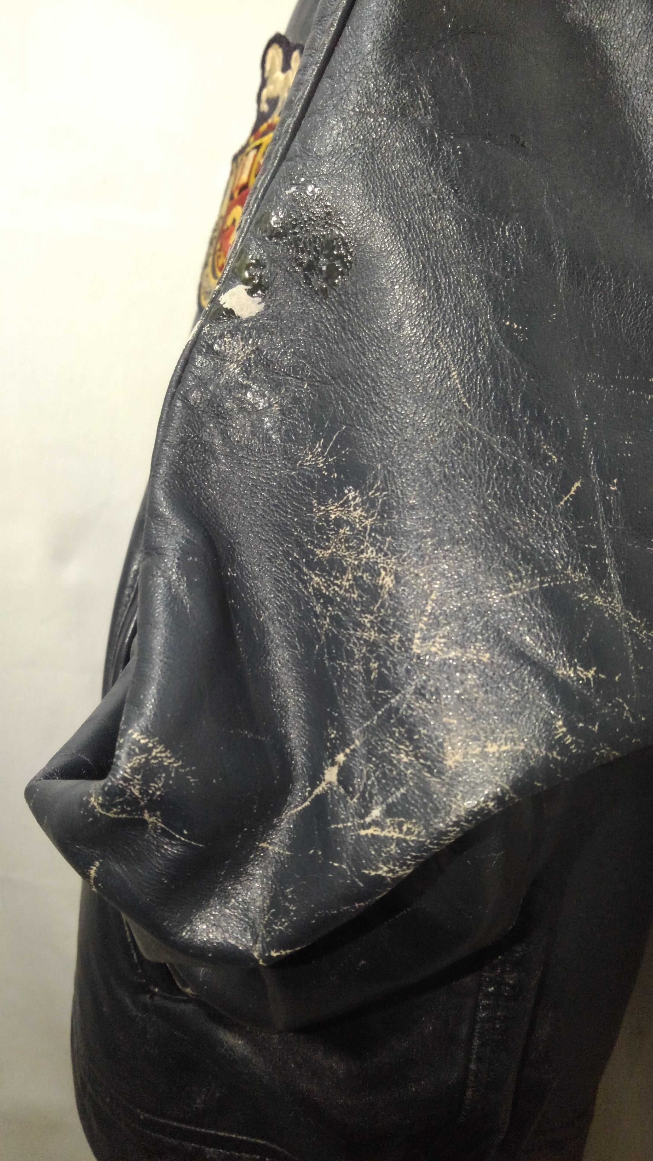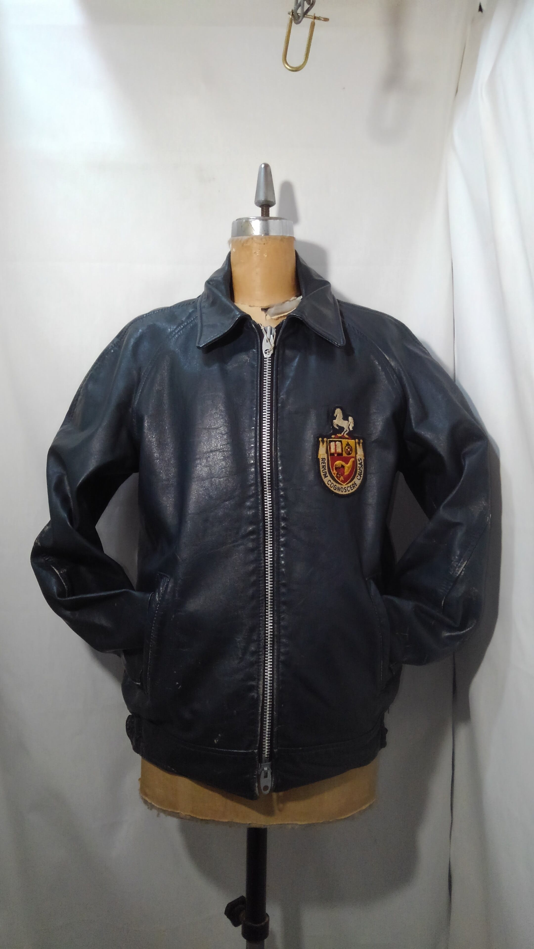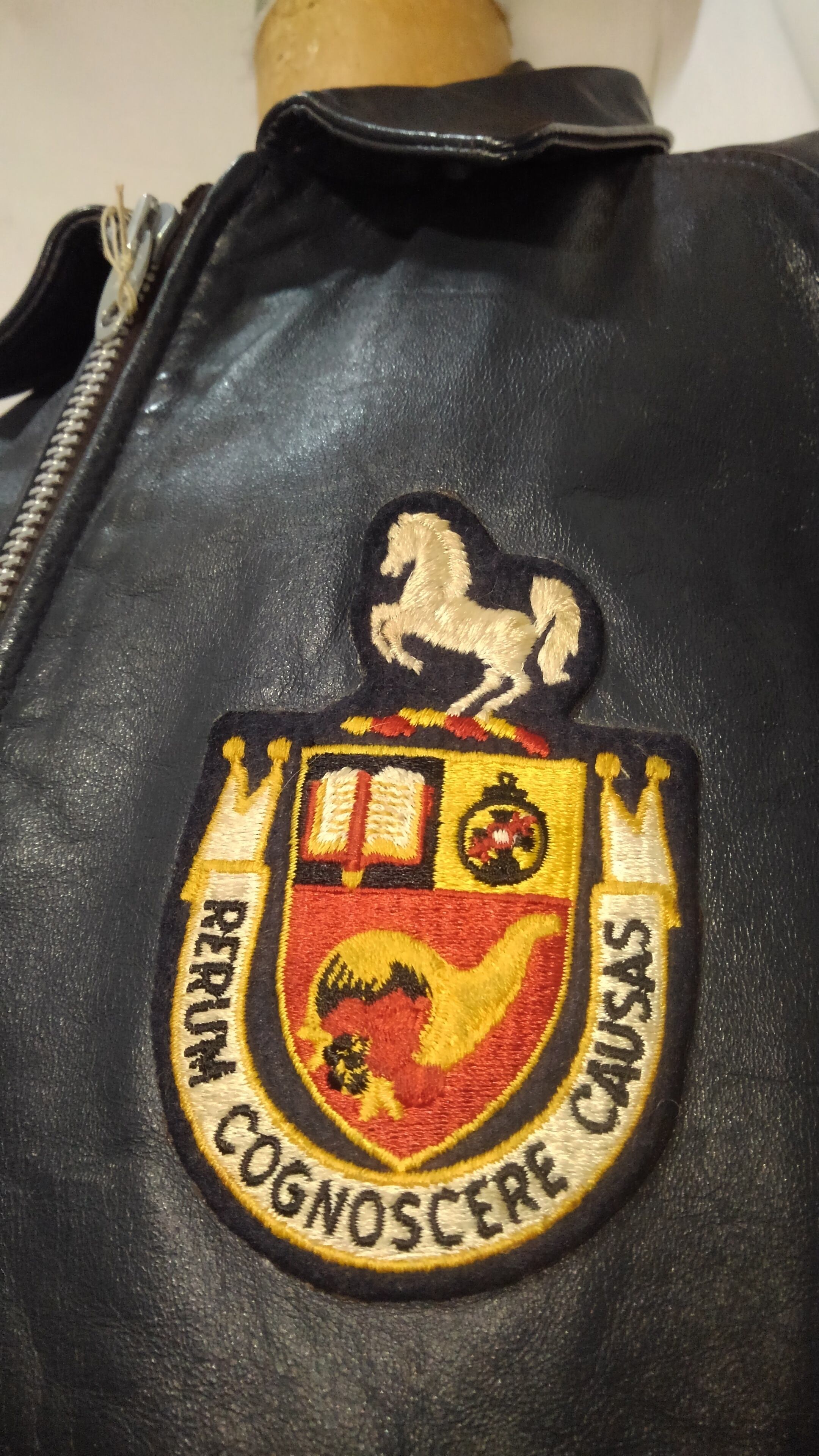 コチラはオールレザーのスタジャンぽい形してますね。後ろの大学名のワッペンがインパクト大です。