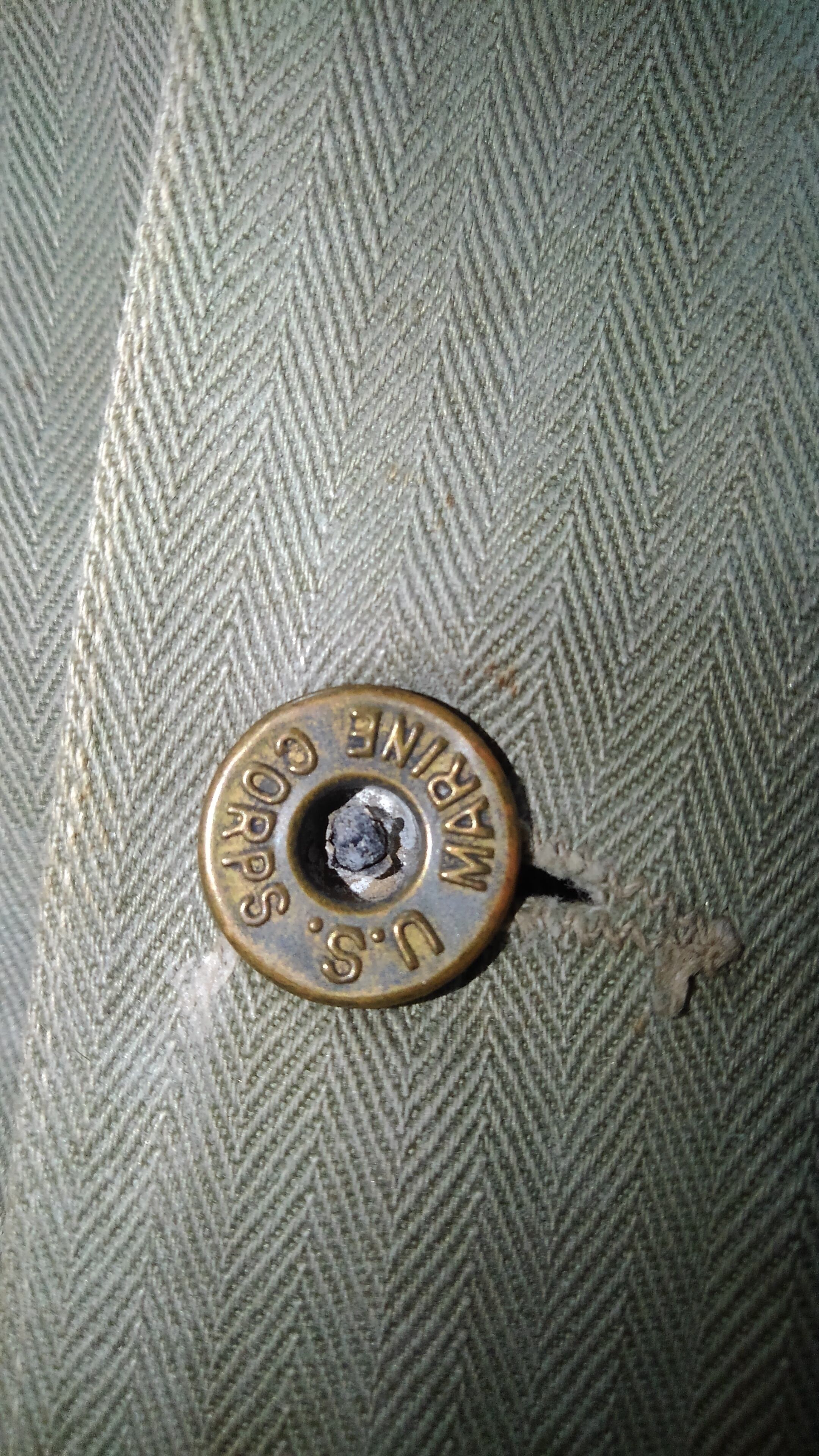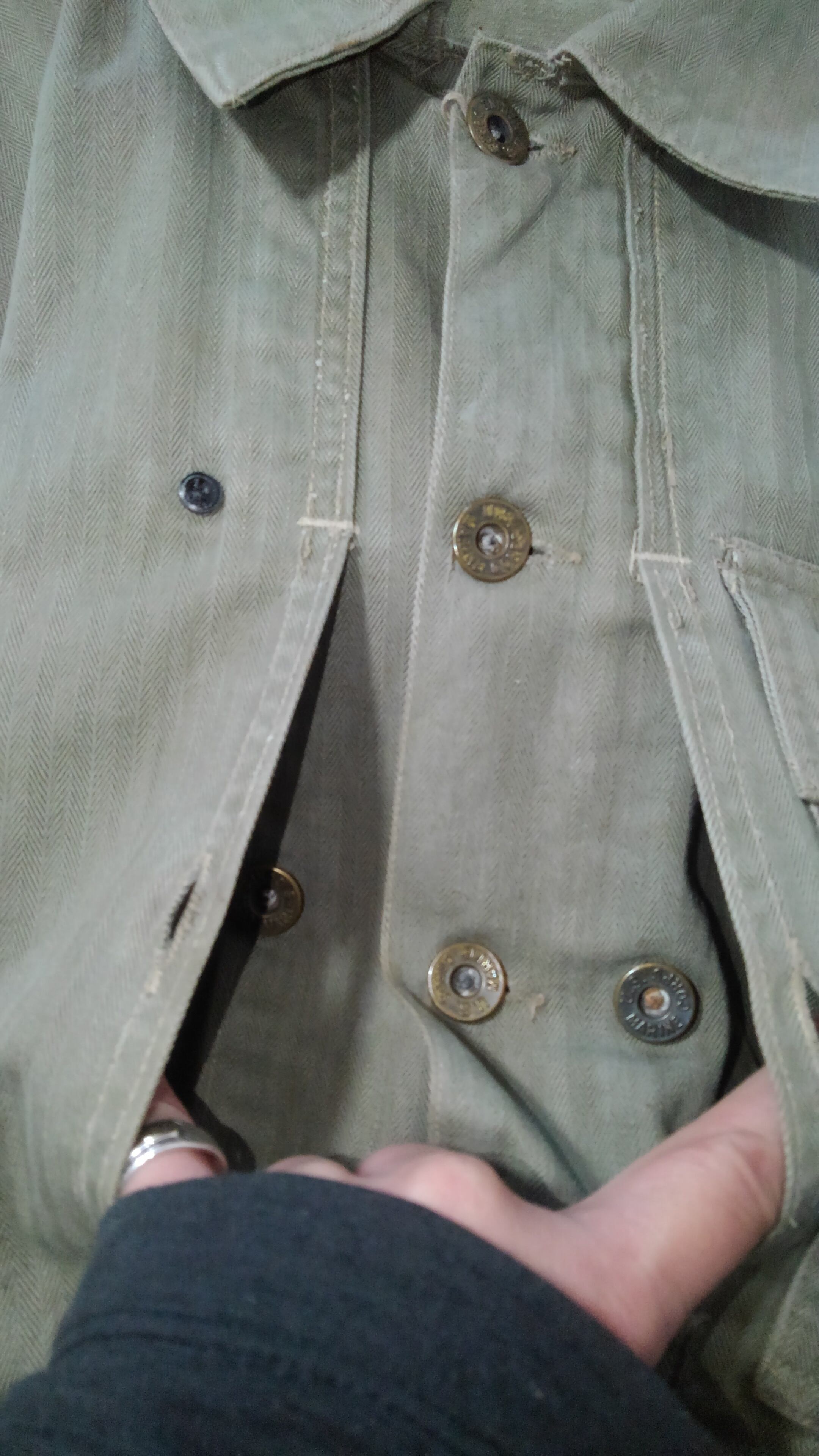 1940年代にUSMCが使用したジャケットで ヘリンボーンツイル素材や刻印入りの真鍮製ドーナツボタン、特徴的なポケット、インナーフラップなど服好きをくすぐるディテールが詰まった魅力的な1着です。
