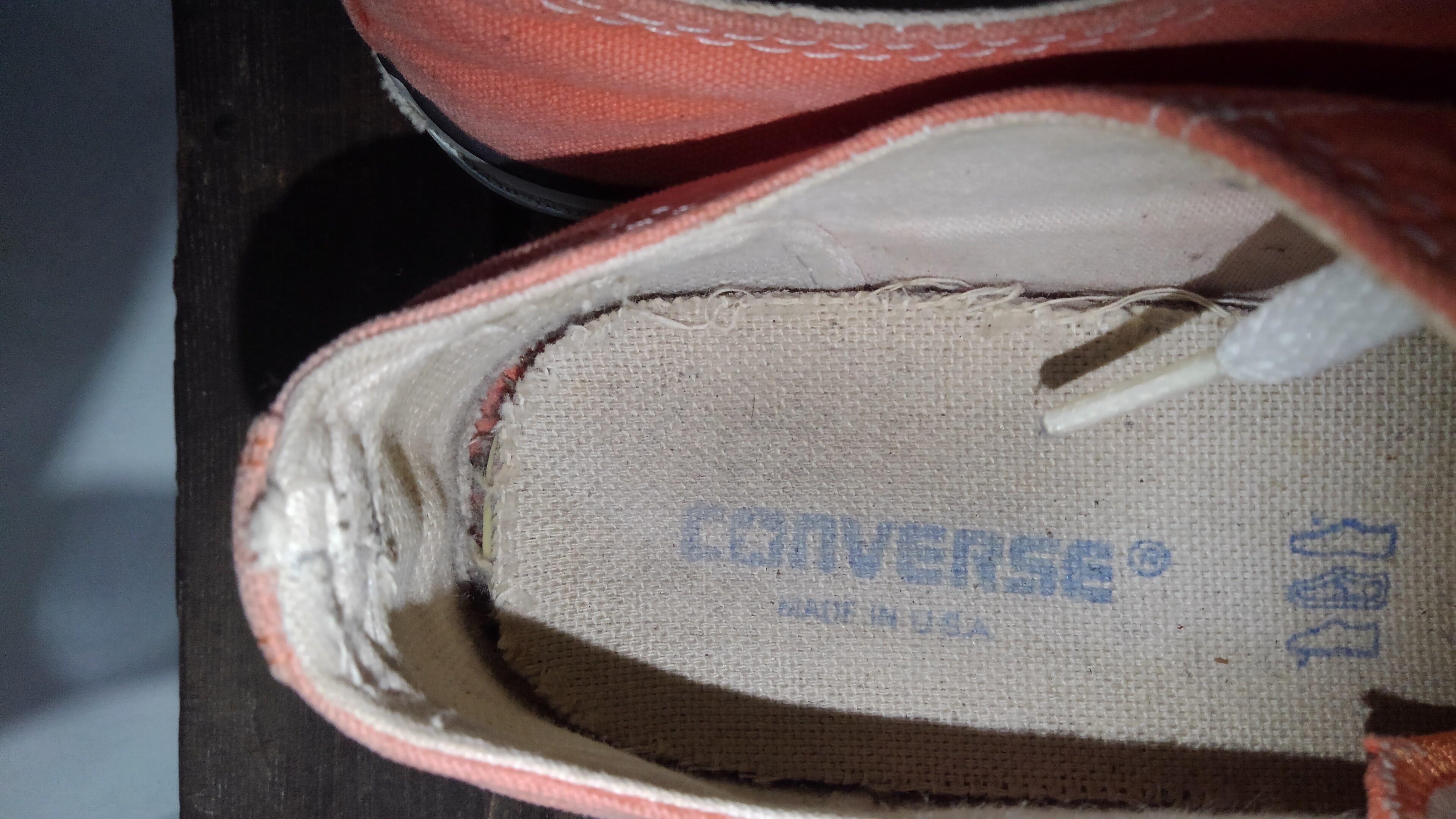 元々はオレンジカラーだと思いますが、経年の変化によりサーモンピンクの様な色合いになっていますが、これがまた良いですね。左ヒールパッチ部分が割れてしまっていまが普段履きする分には問題なさそうです。
