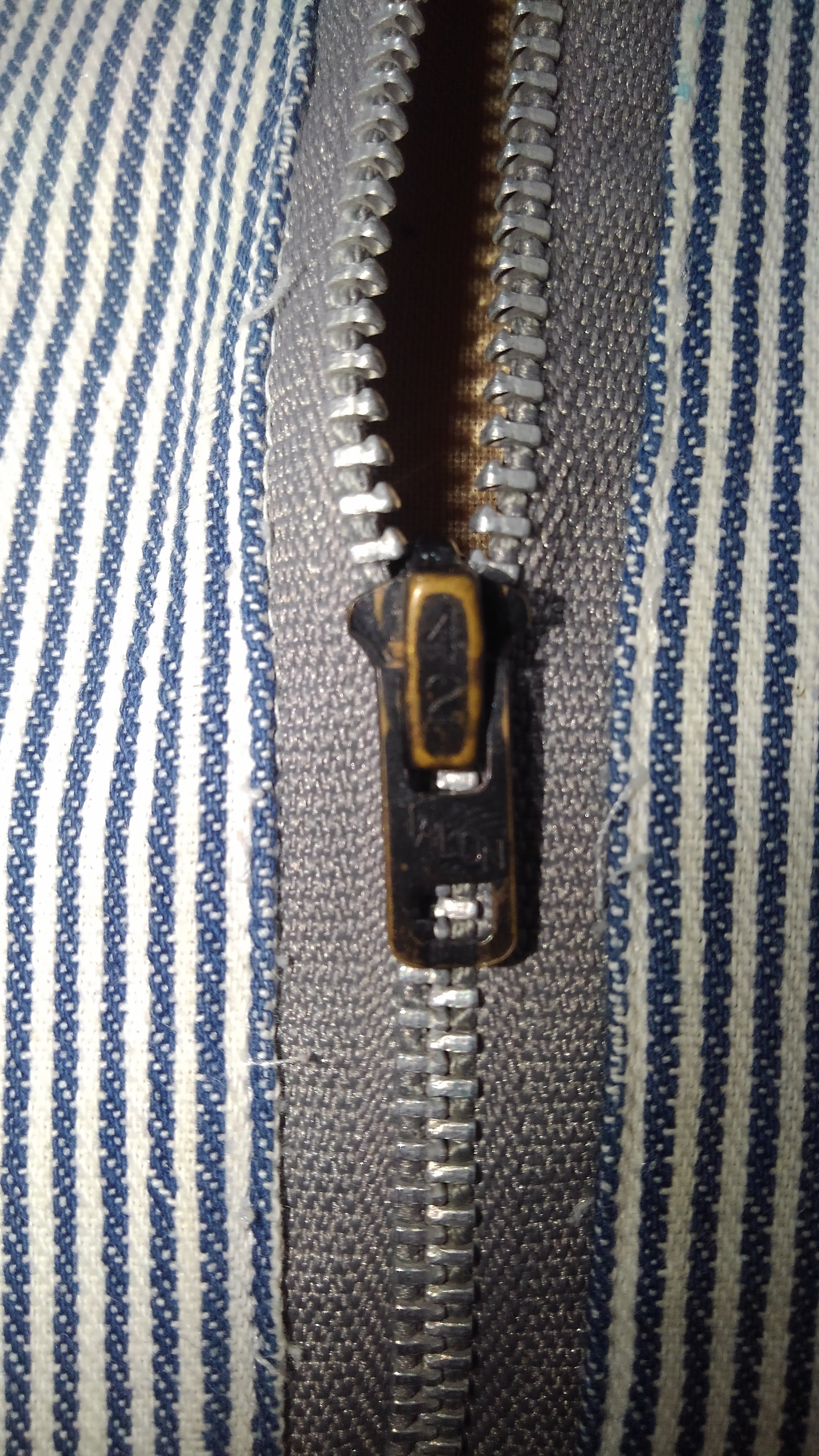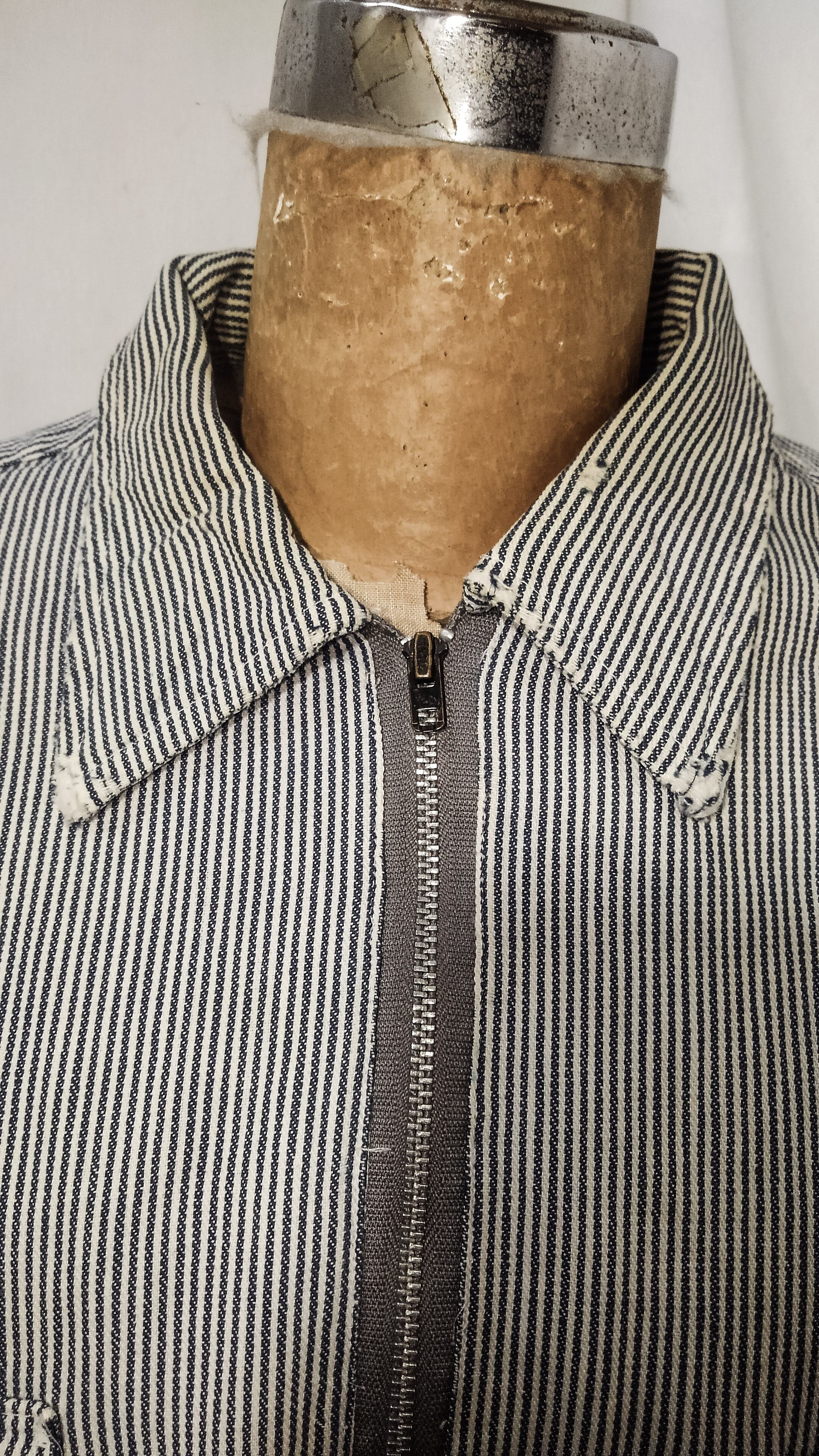 襟は袋縫いで両胸にはフラップポケットが施されております。ジッパーは42TALON(タロン)で、タグにはR・MR表示が入っております。素材は100%コットンです。