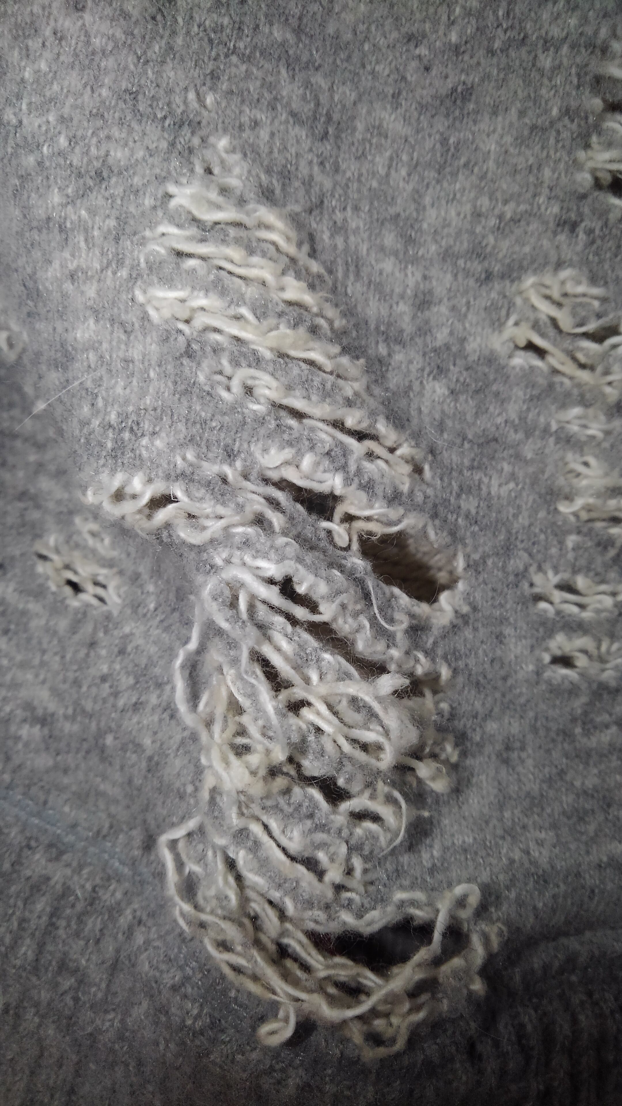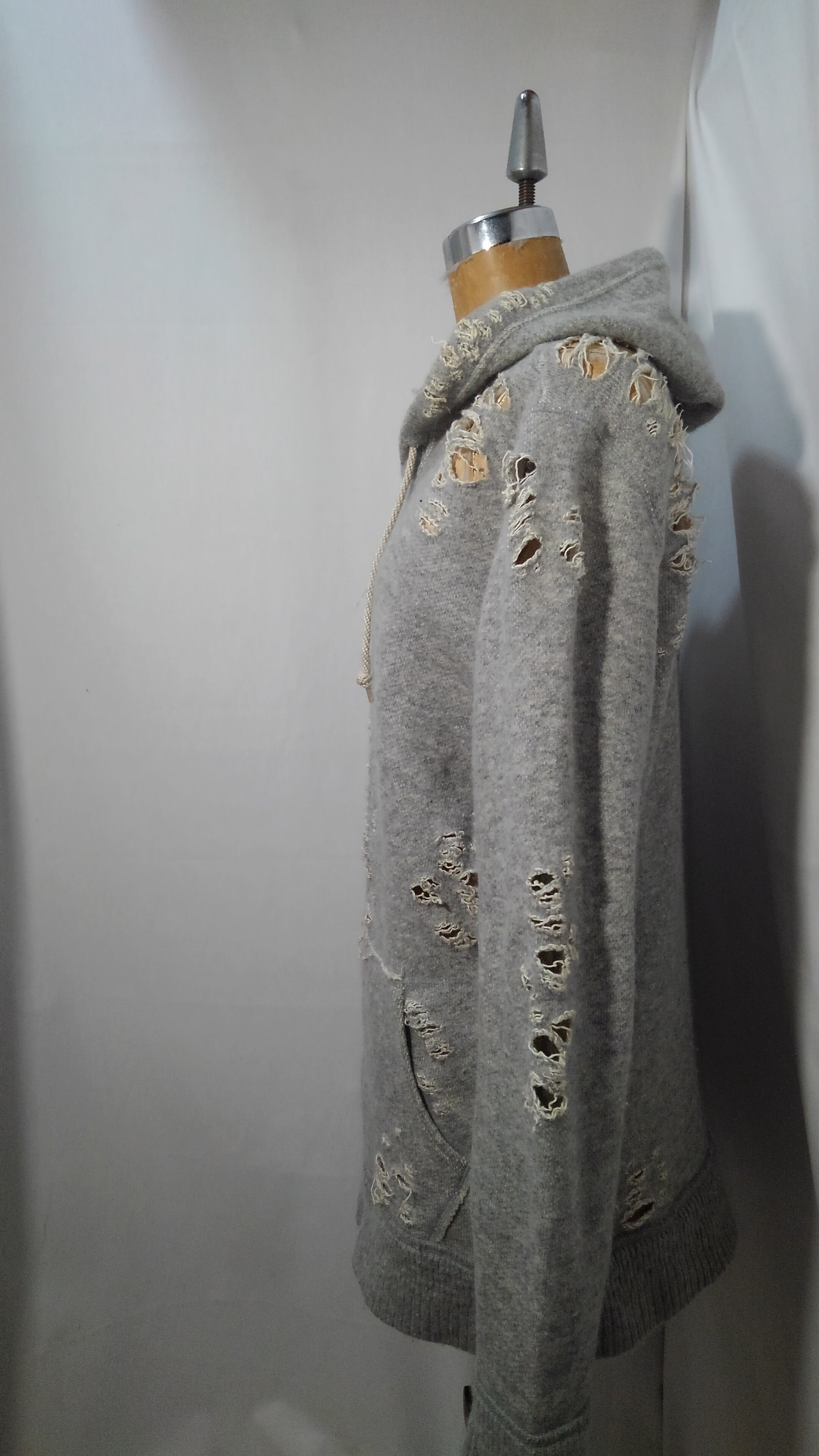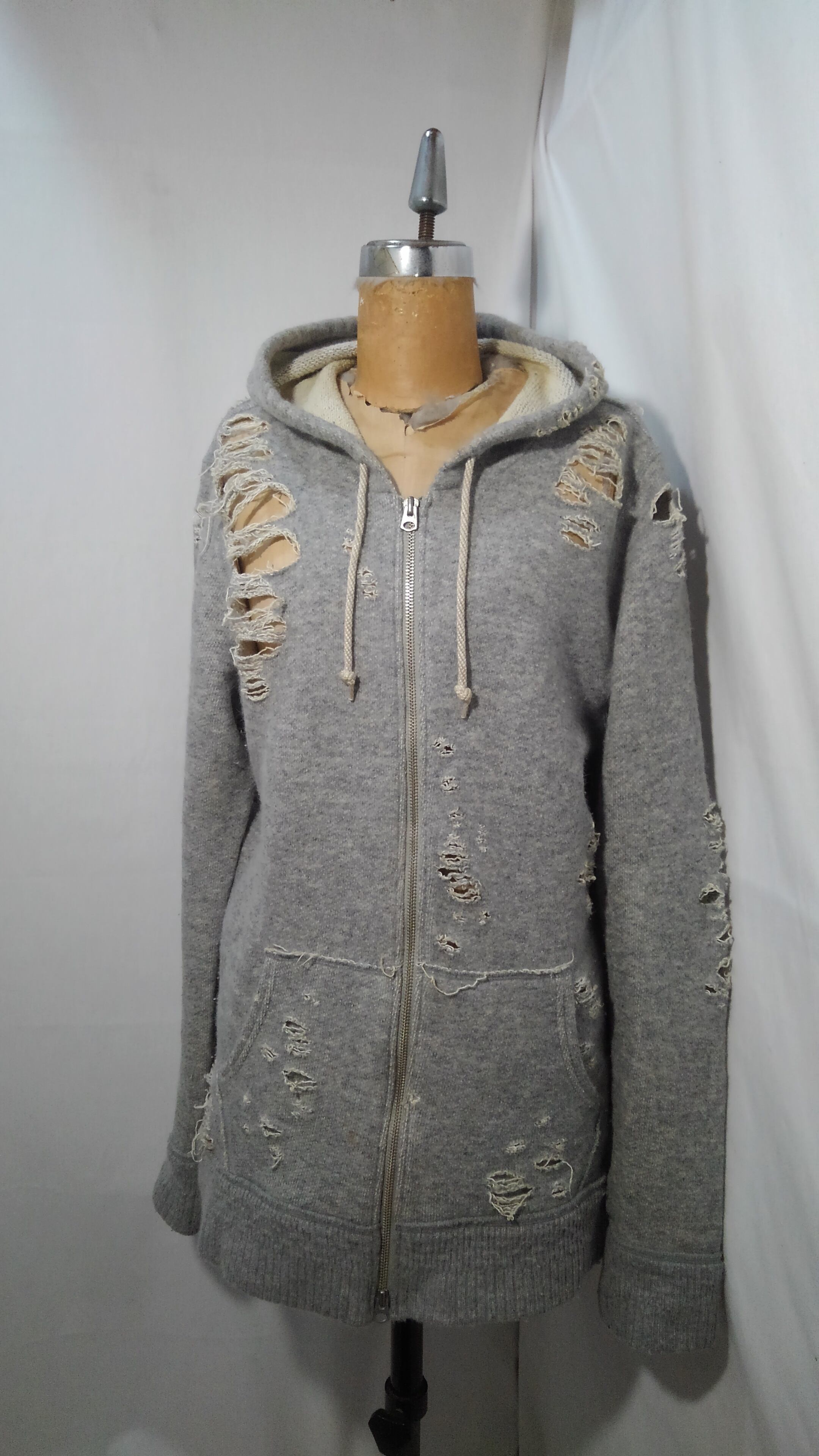 ミハラヤスヒロ氏らしい大胆にも激しいダメージ加工が施され一見ハードコアなインパクト大なアイテムですが、素材はコットン、ウールに加えアンゴラを使用し、吊り編み機で織られた両脇に縫い目を無くした優しい肌触りと着心地で、ただのダメージ加工ではない事がうかがえます。