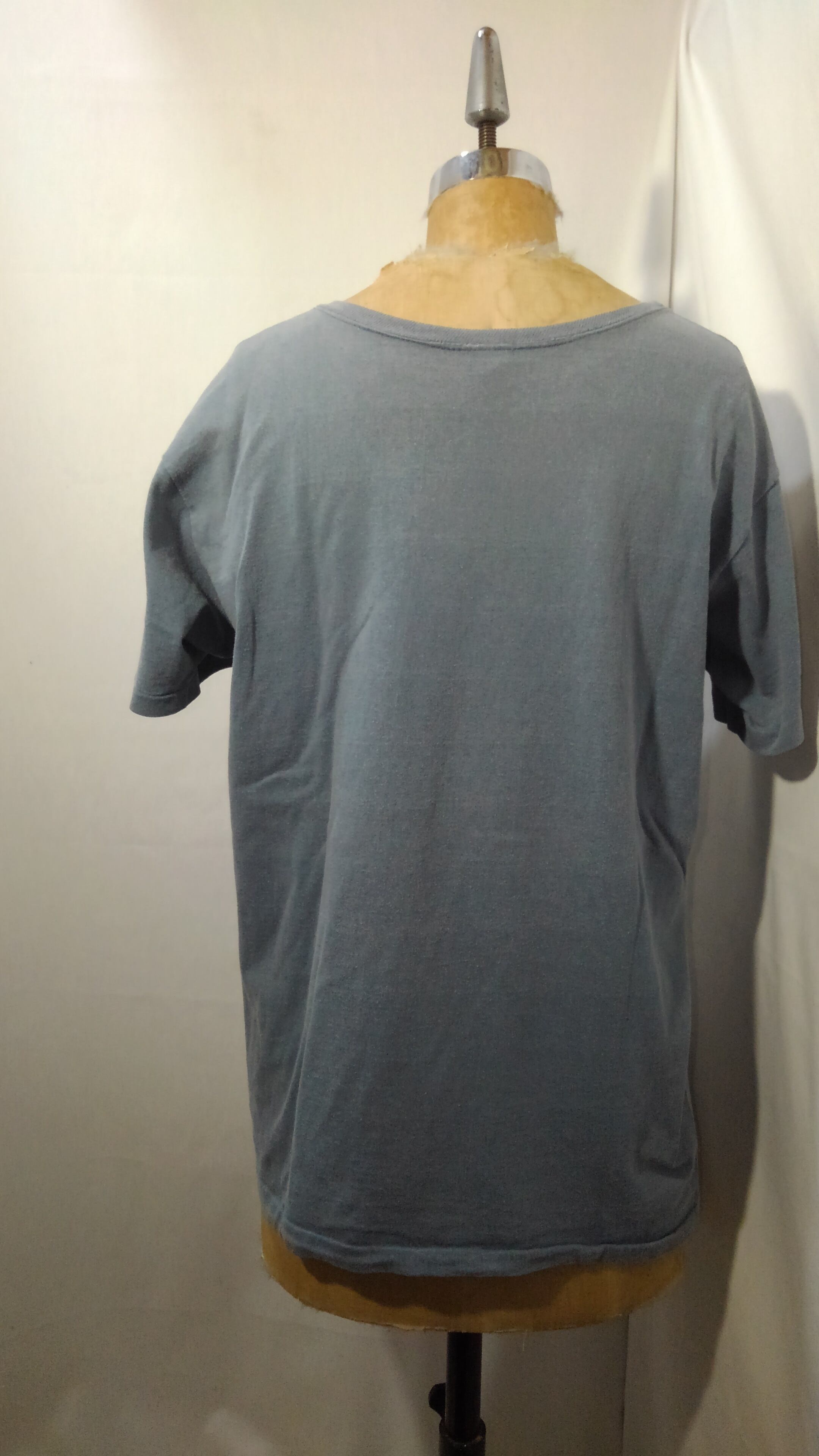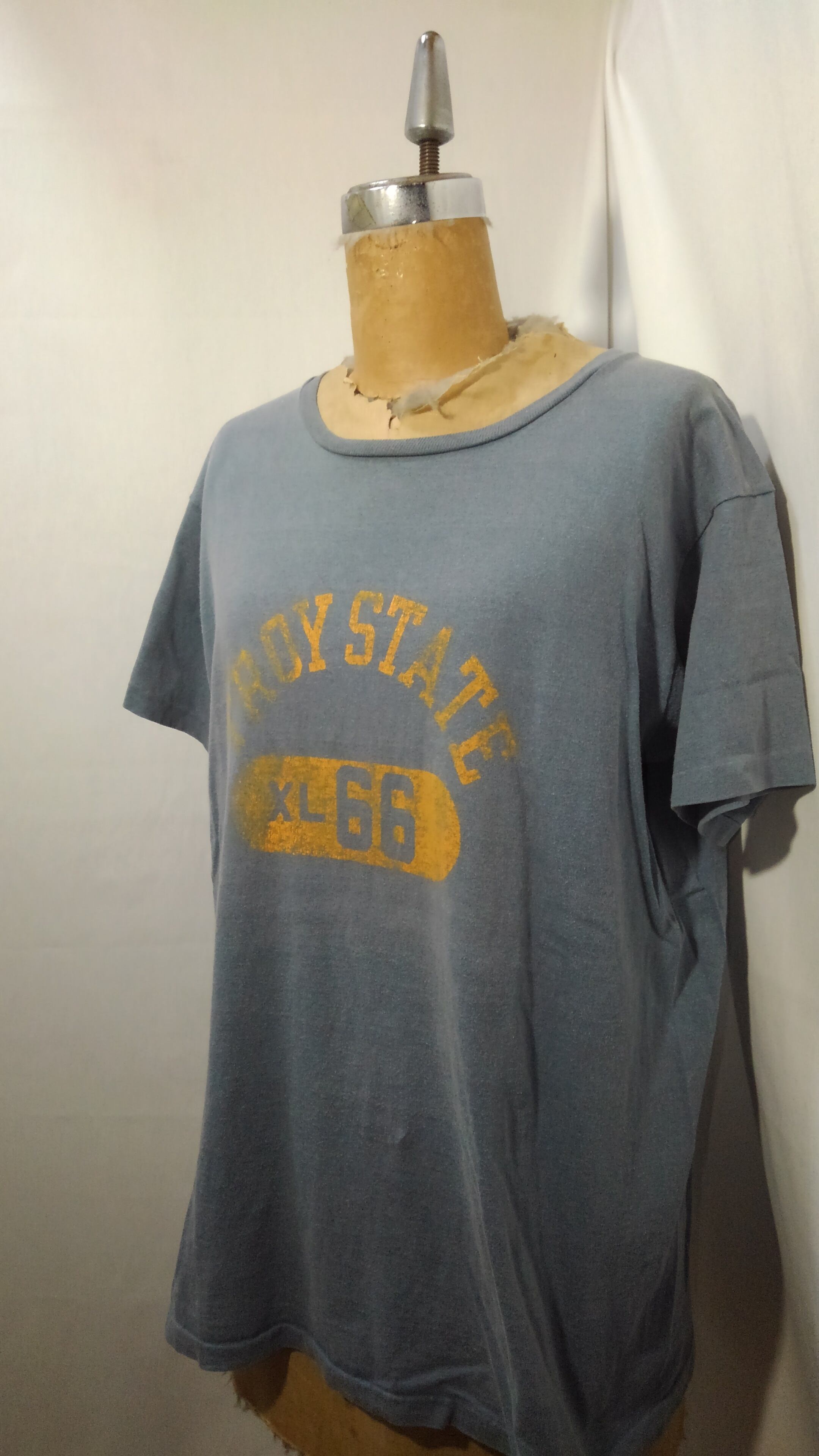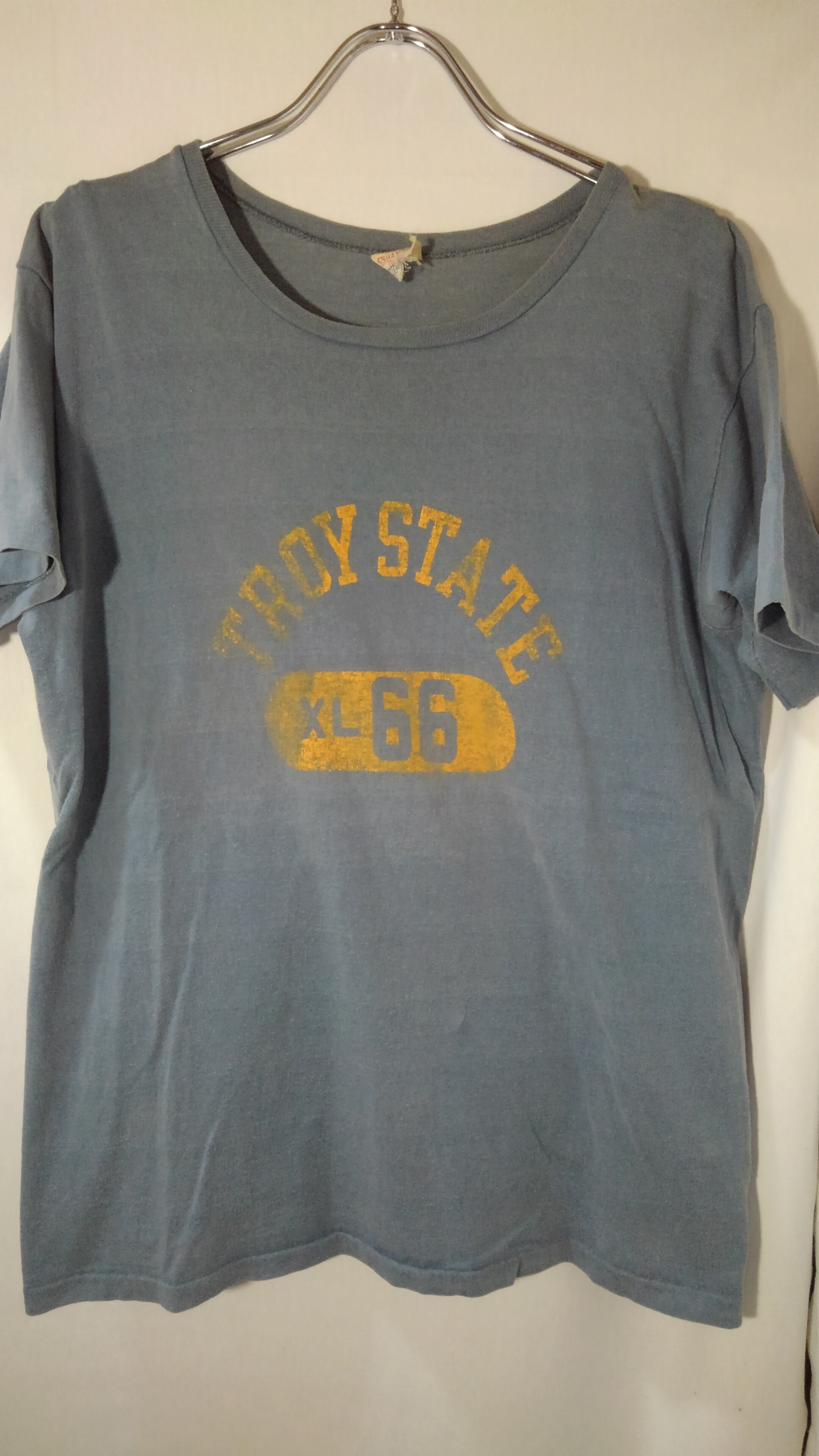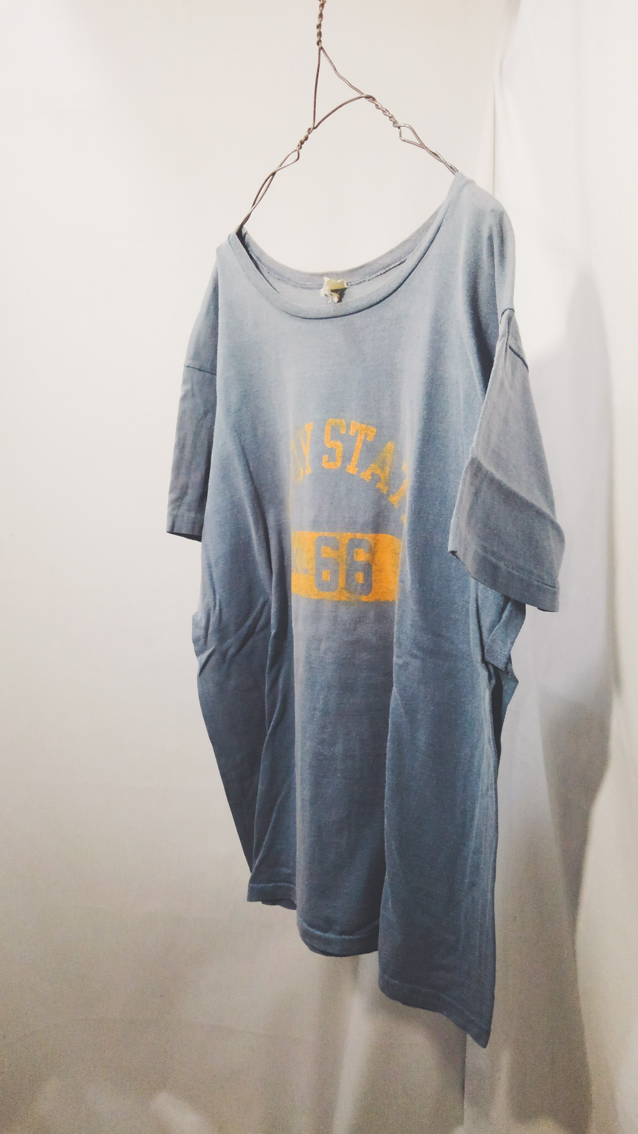 日焼けし色褪せたサックスブルーのボディにかすれた2段のイエロープリントで現代にはないビンテージでしか味わえないこの雰囲気が最高です。