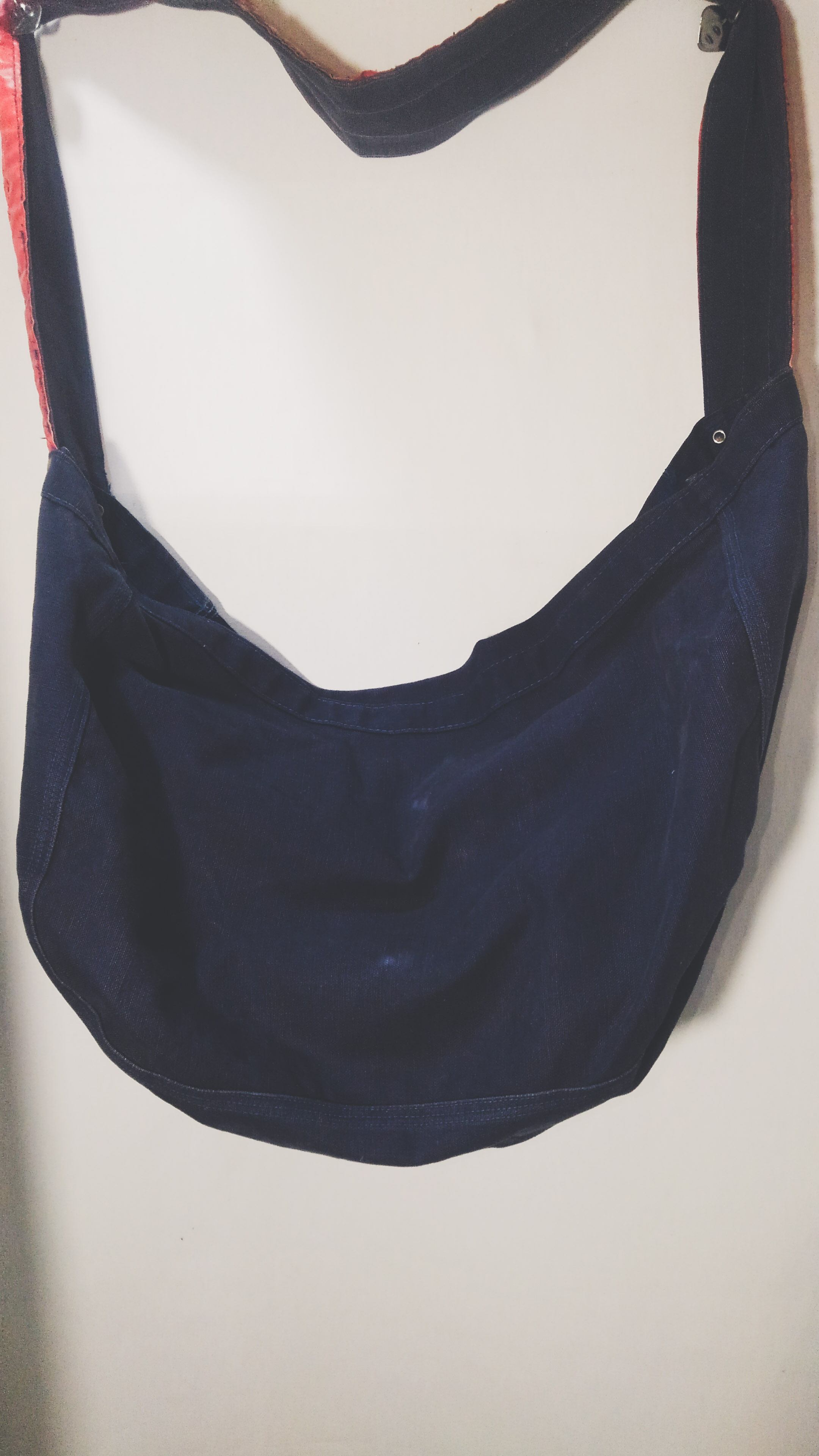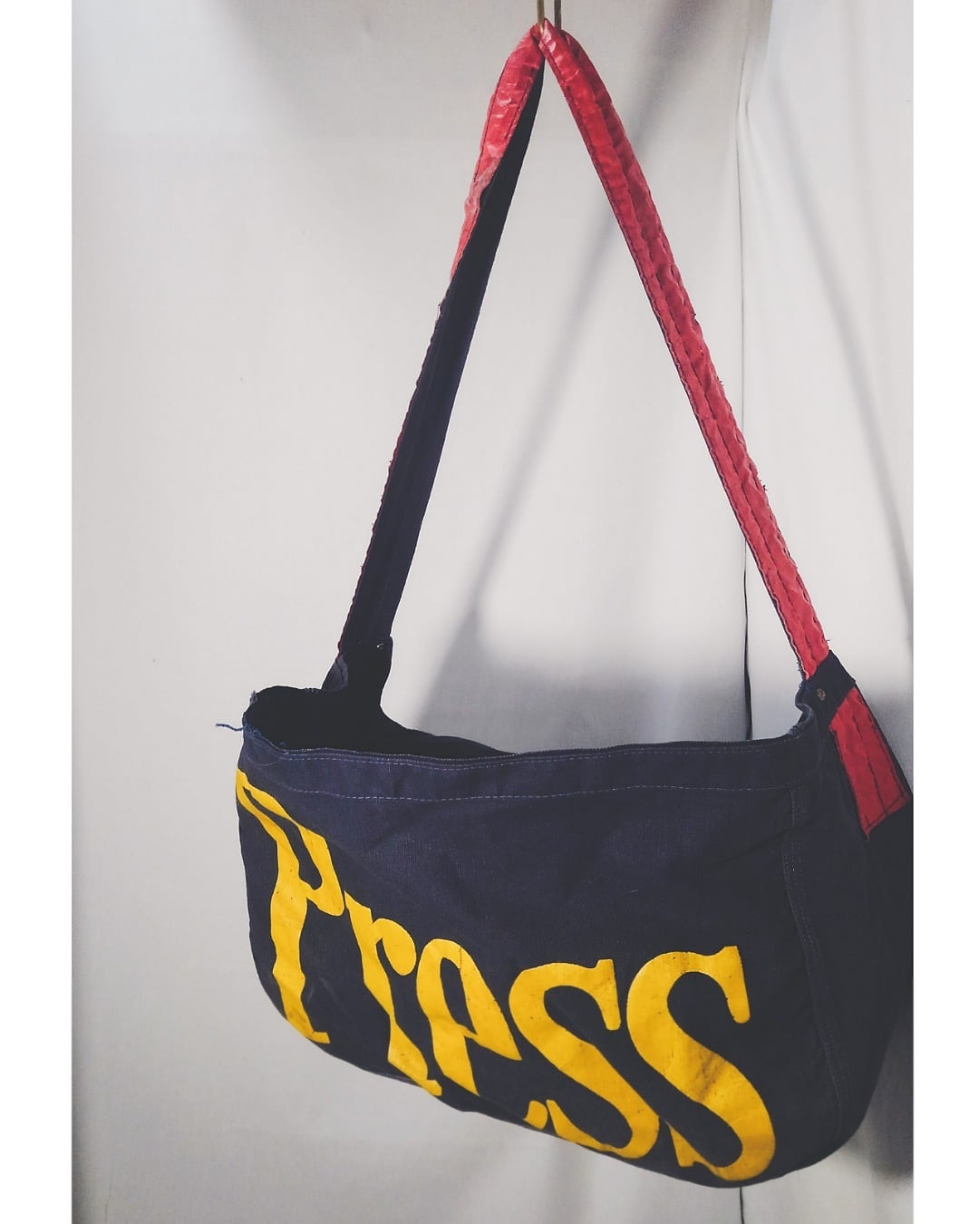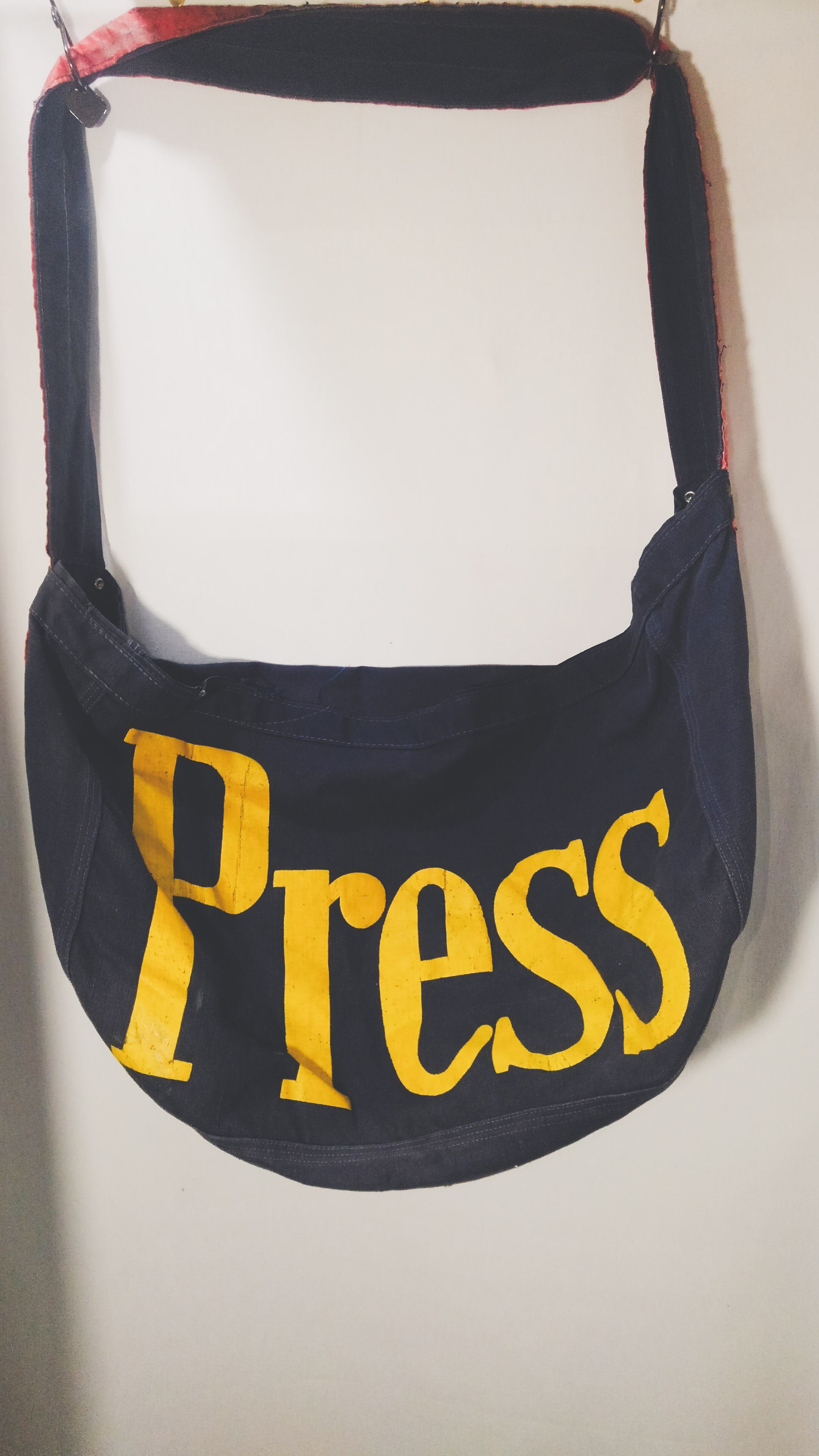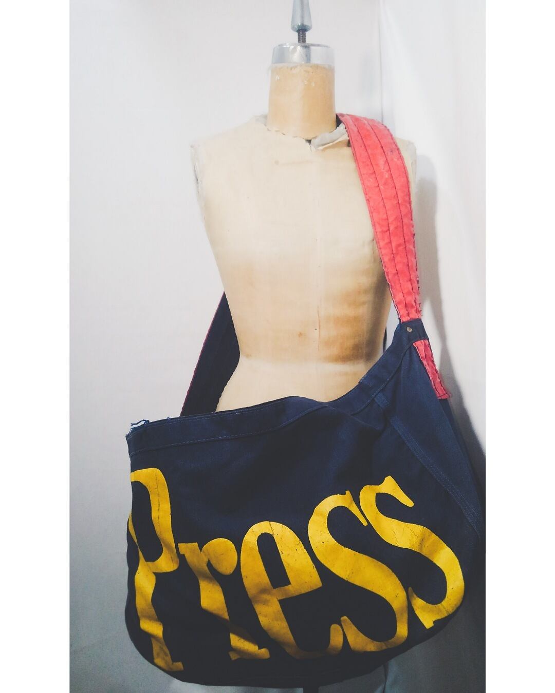60年代頃のアメリカのニュースペーパーバッグです。当時の新聞配達員が使用していた物と思われます。ネイビーベースのキャンバス地にイエロー配色の「Press」の文字がインパクト大ですね。