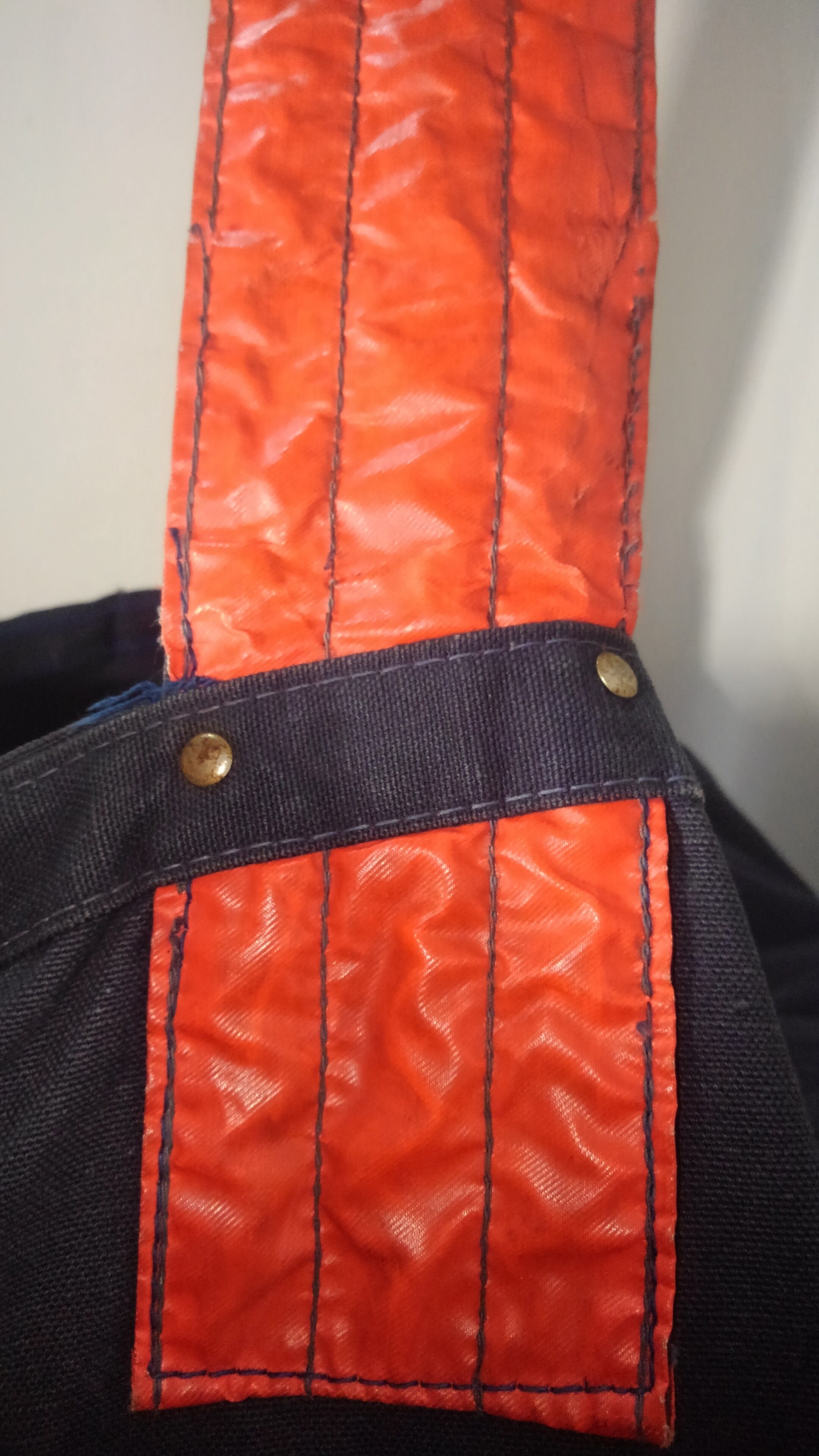 ストラップはリフレクターの様な生地感で実際に光を反射するか不明ですが、オレンジカラーでこれまたネイビーボディとマッチしています。