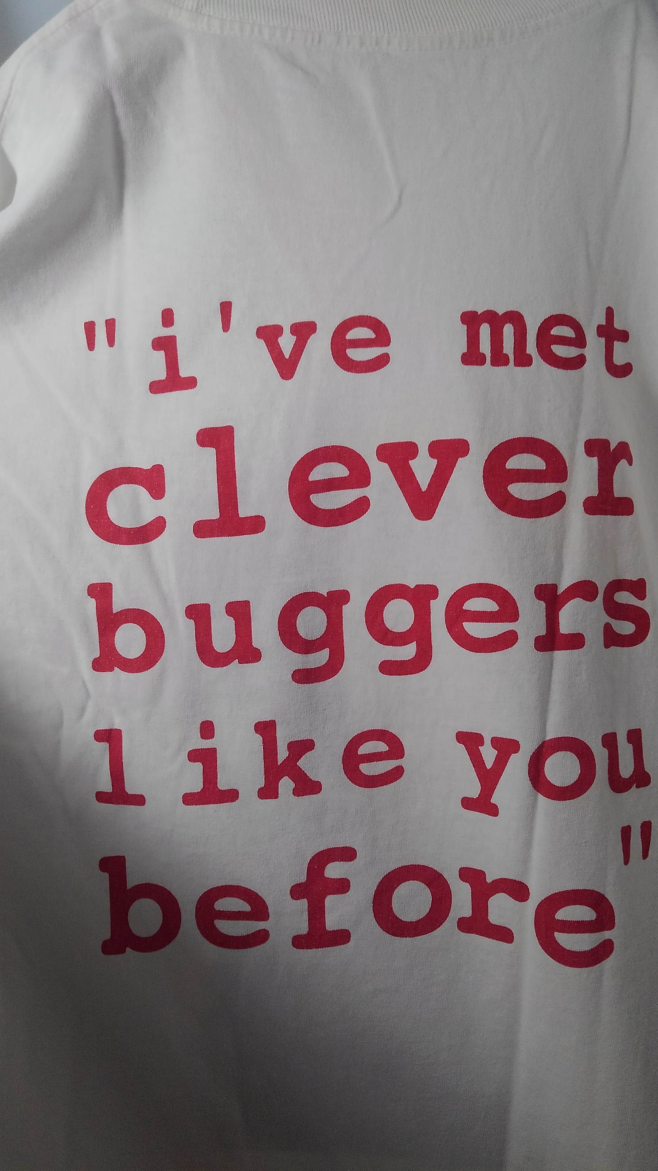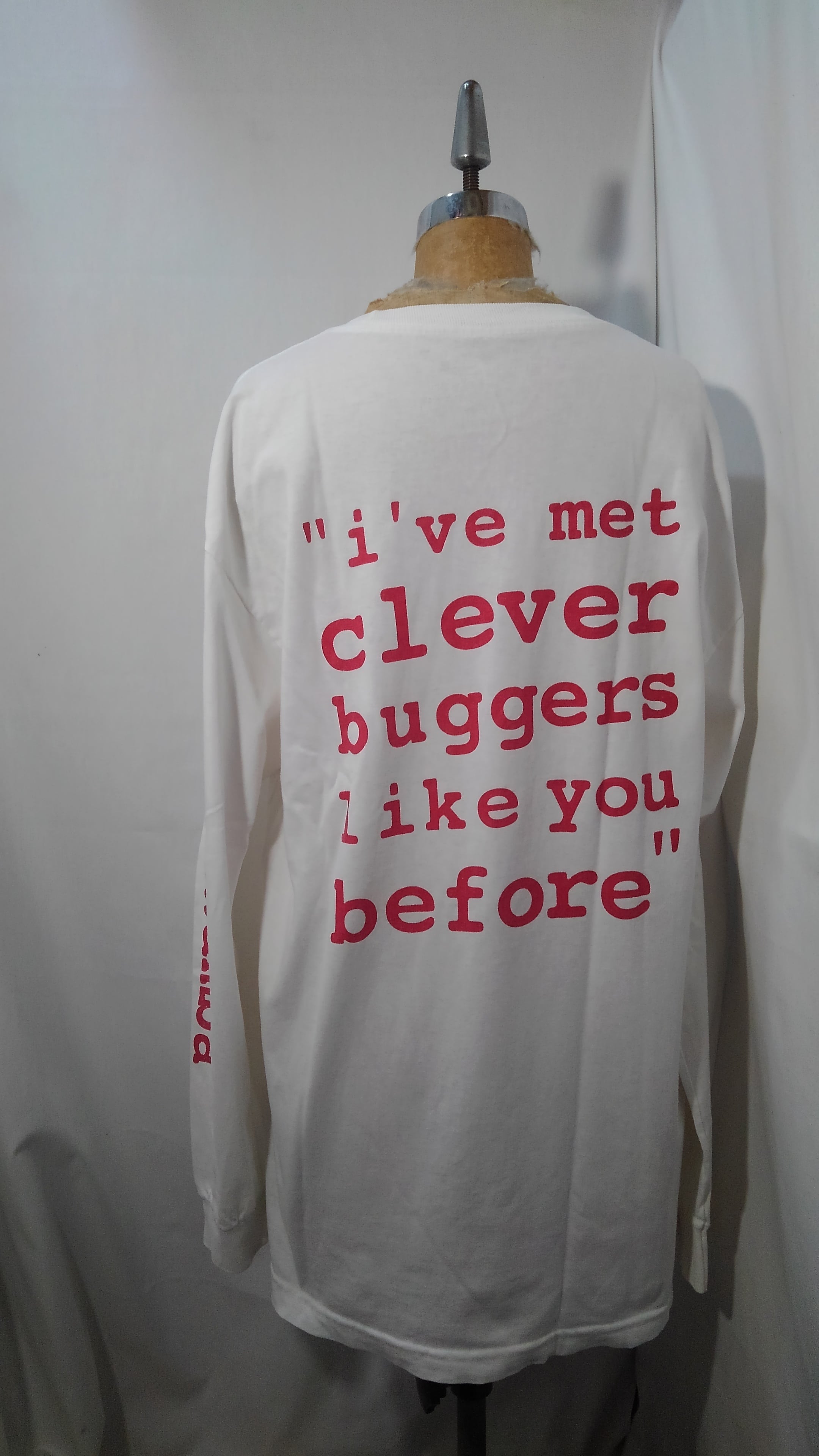 フロントに裏ピースをした少年のプリント、バックは「i've met clever buggers like you before」のメッセージプリント、左腕にはバンド名の袖プリとバンドTとしてのディテールは最高にカッコいいです。