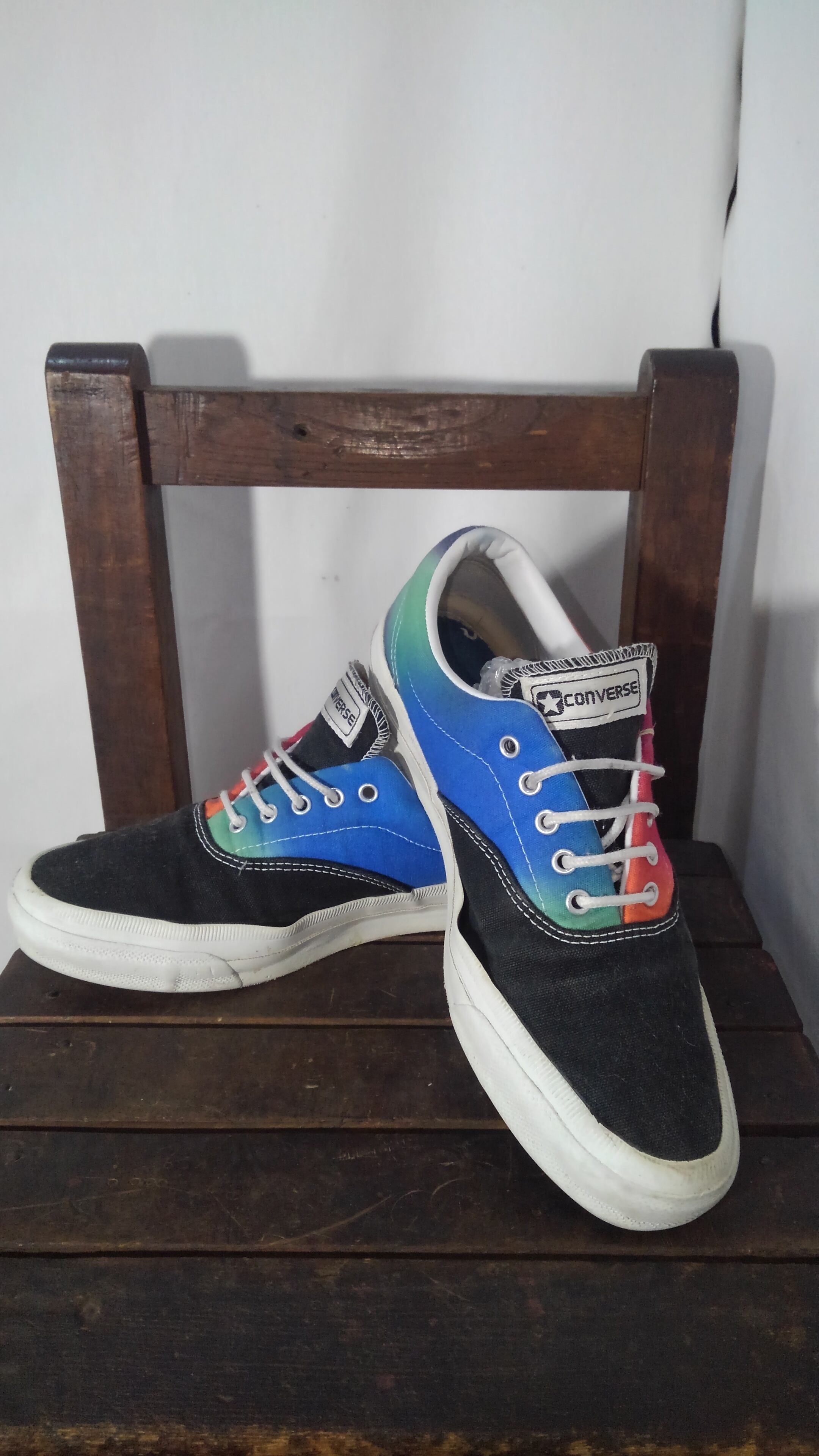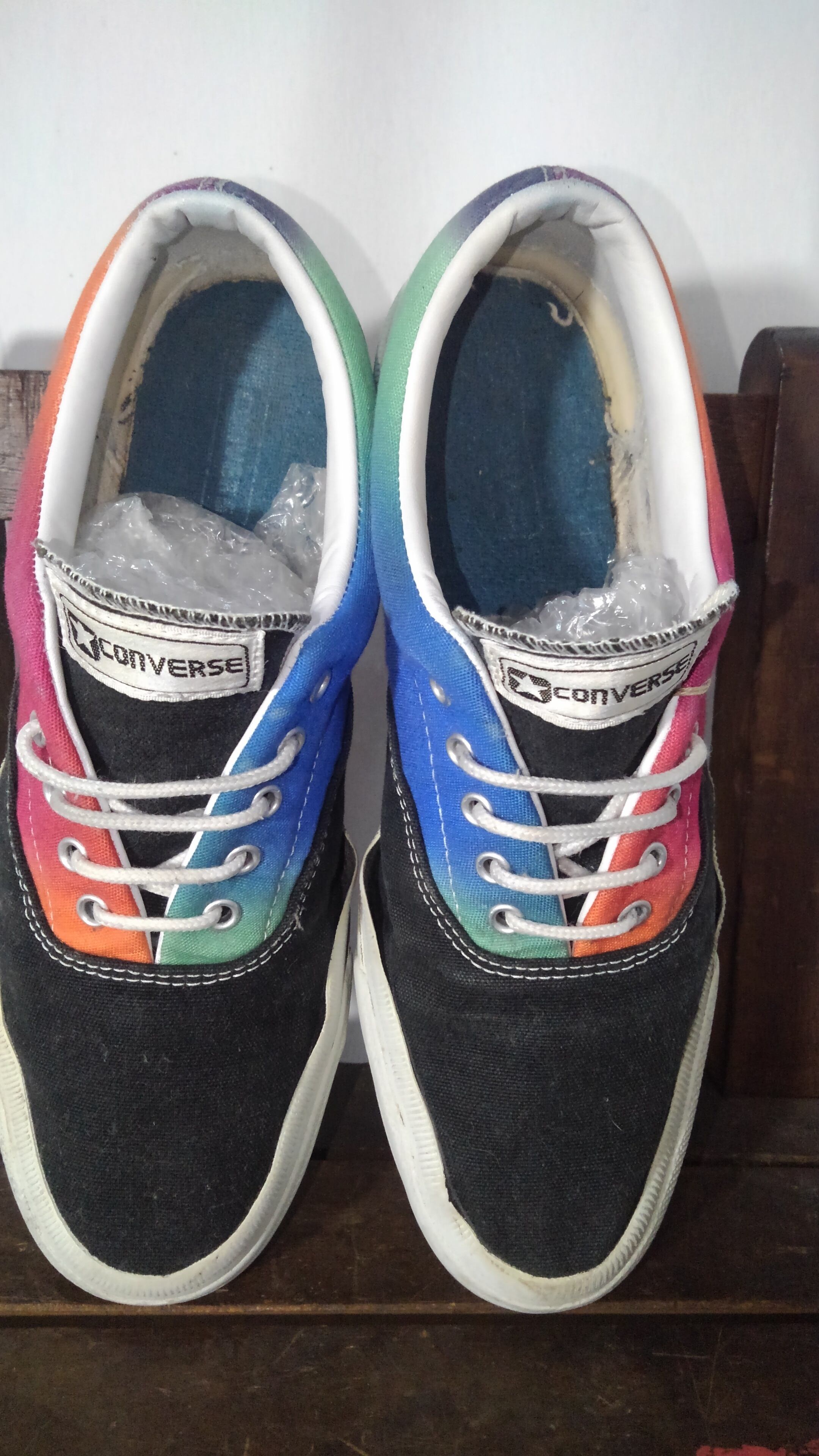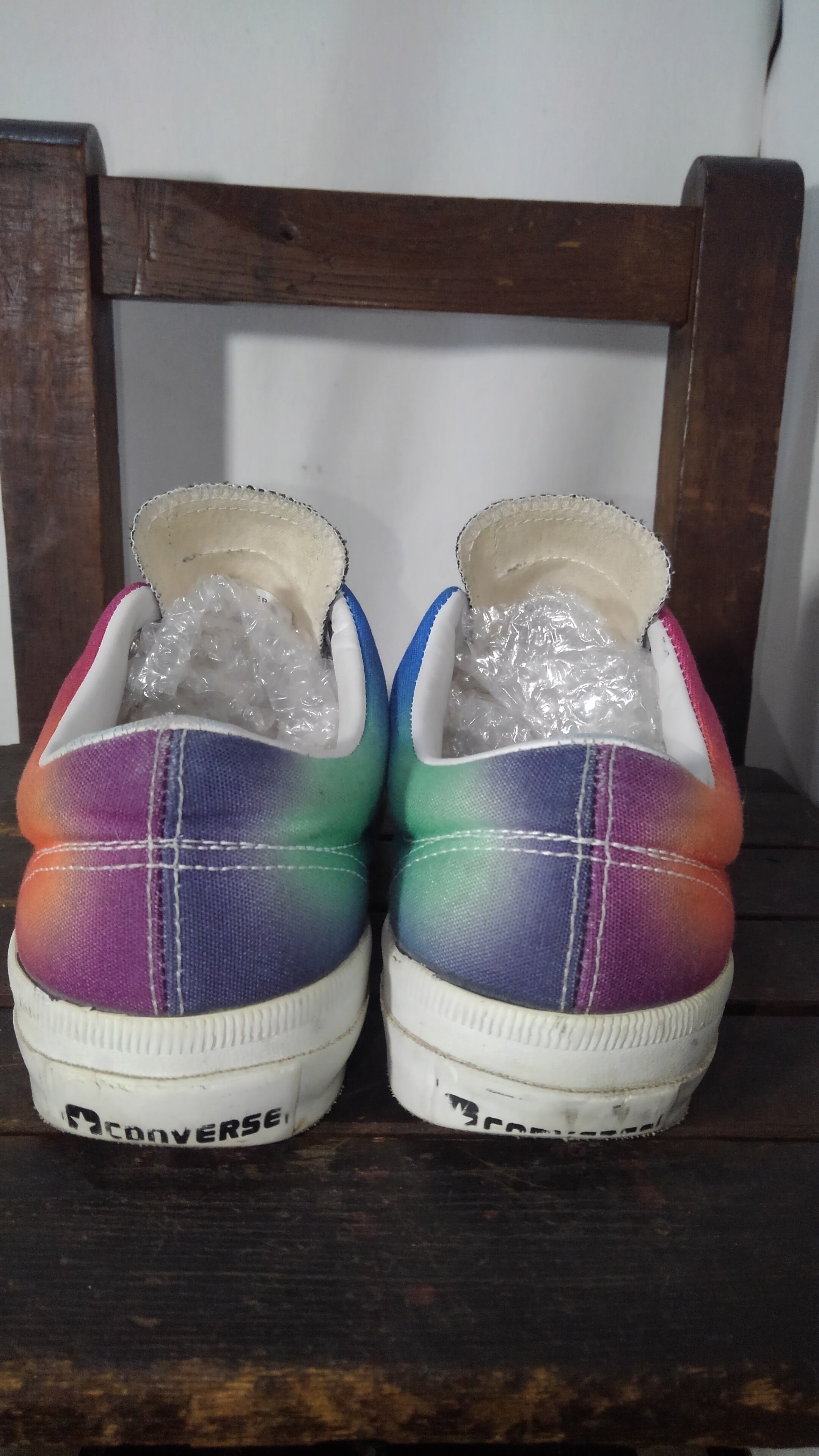 スキッドクリップはコンバースの中でもデッキシューズとして人気なアイテムですがこの100周年モデルは現在中古市場でも中々入手困難でもあり、マルチカラーと言う一癖あるアイテムですので他の方と被る事は殆どないと思います。サイドテープ部分にボンドの剥がれが見られますが、気になる様であれば市販のシューグー等で簡単に処置出来ると思います。