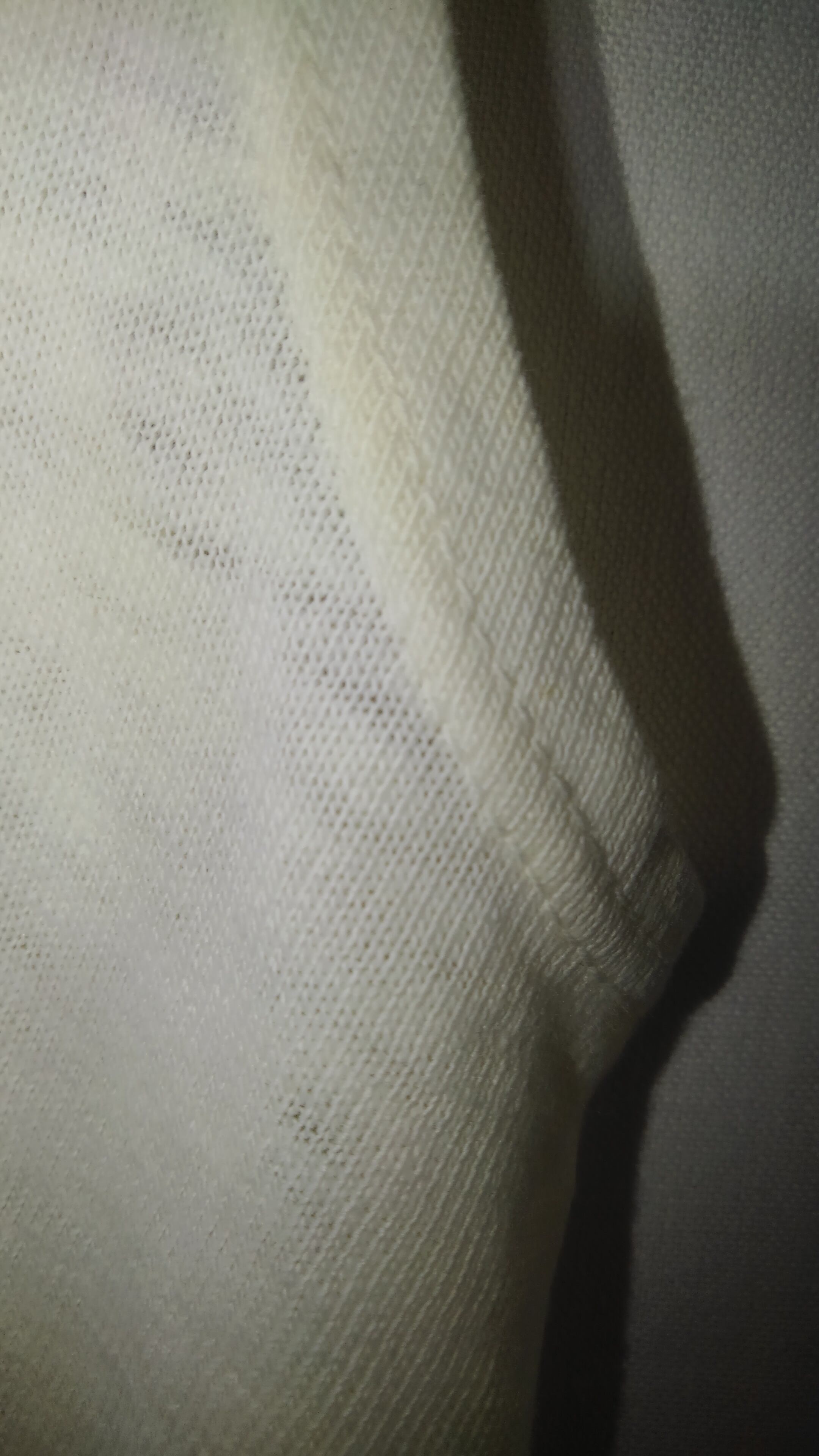 ボディは2本針ミシンによるソーイングでおそらくコットン100の柔らかくしっかりとした生地を使用しています。吊織機を使用しており、両脇はシームレスで生地の表面には凸凹感のある風合いです。