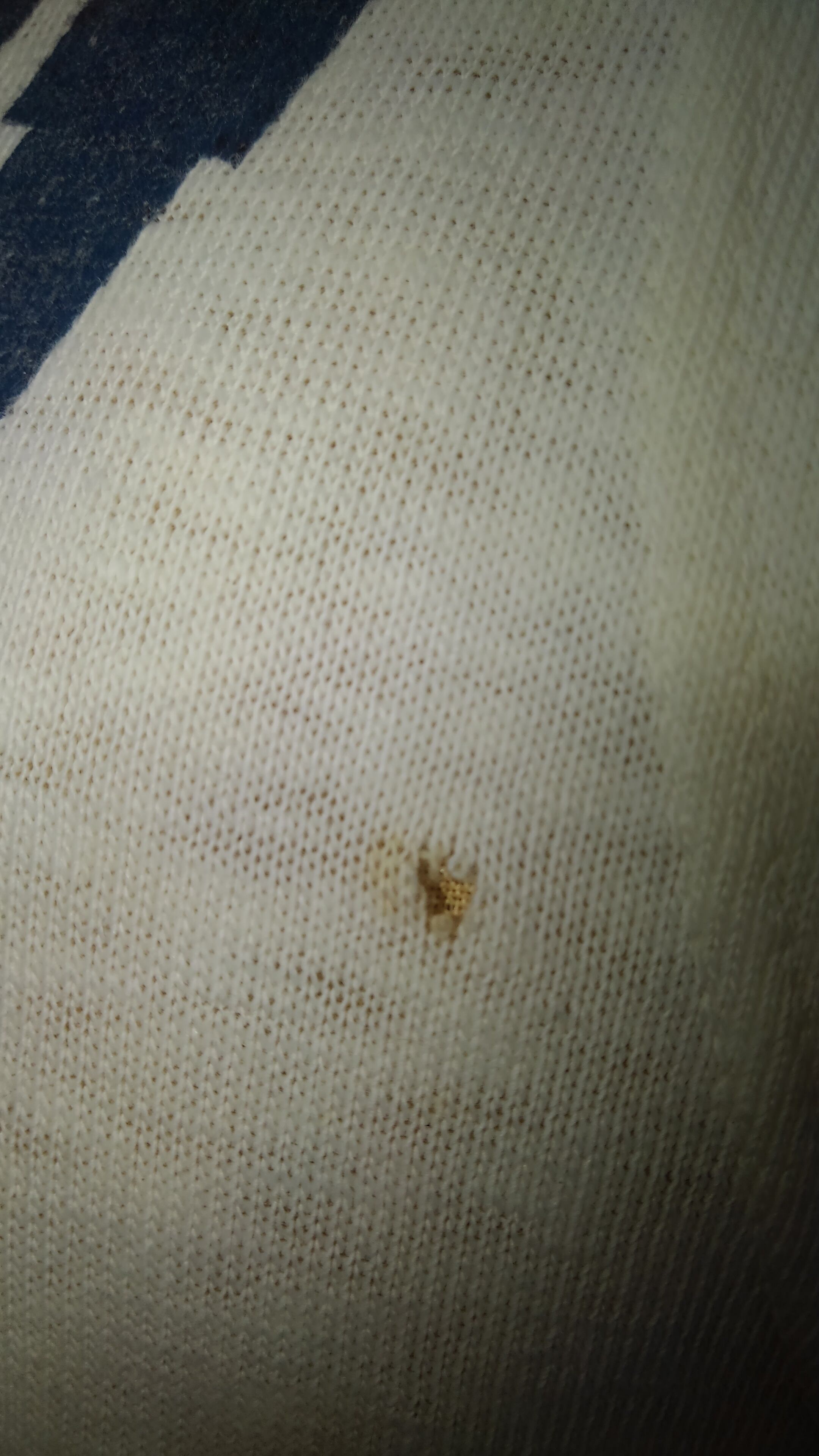 ピンホールが一つと全体的に黄ばみがかった感じがあります。漂白をすれば多少落ちると思いますが、生地への負担を考慮して現状維持しています。サイズ小さめなのでコレクションや資料としていかがでしょうか。