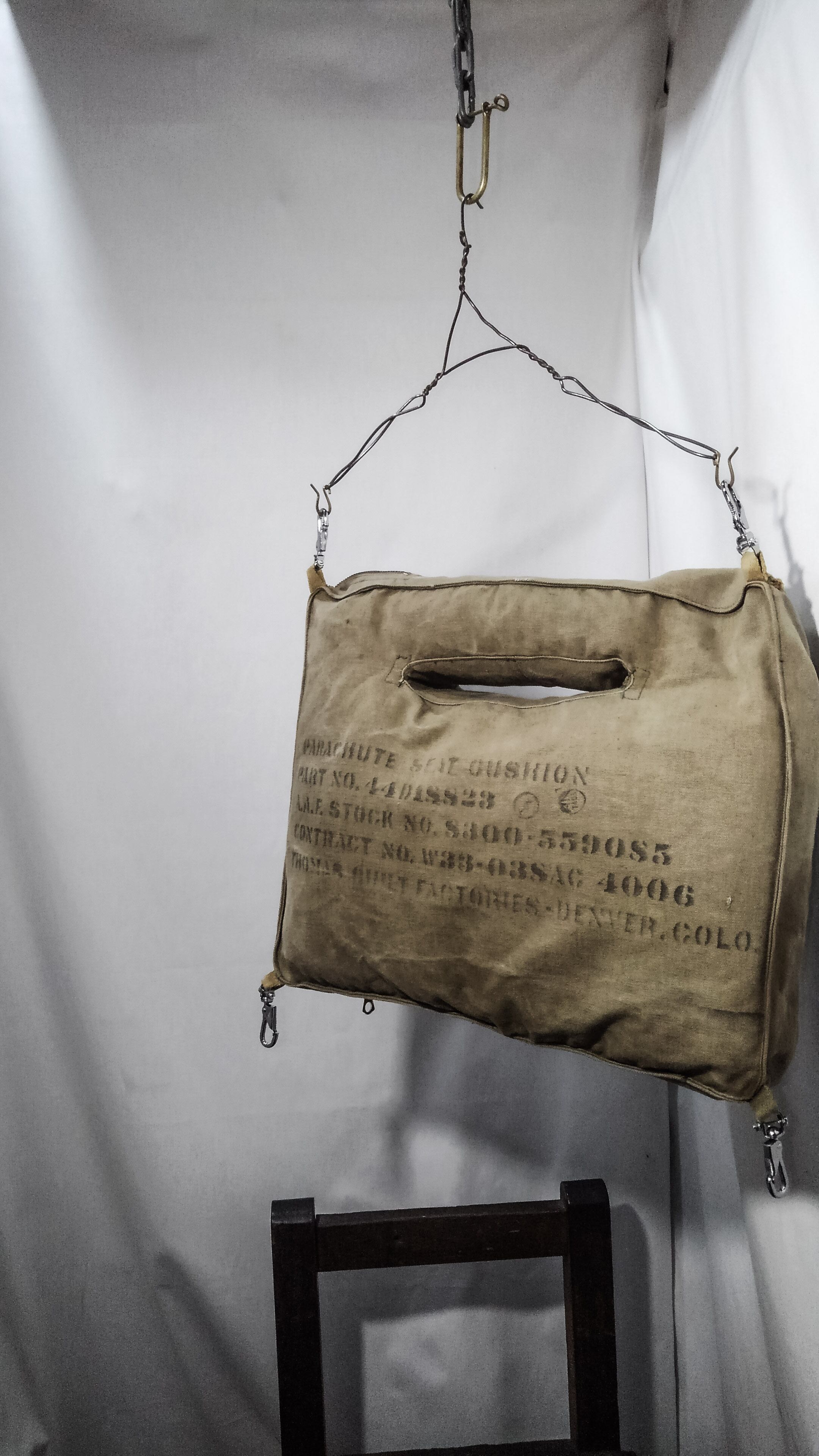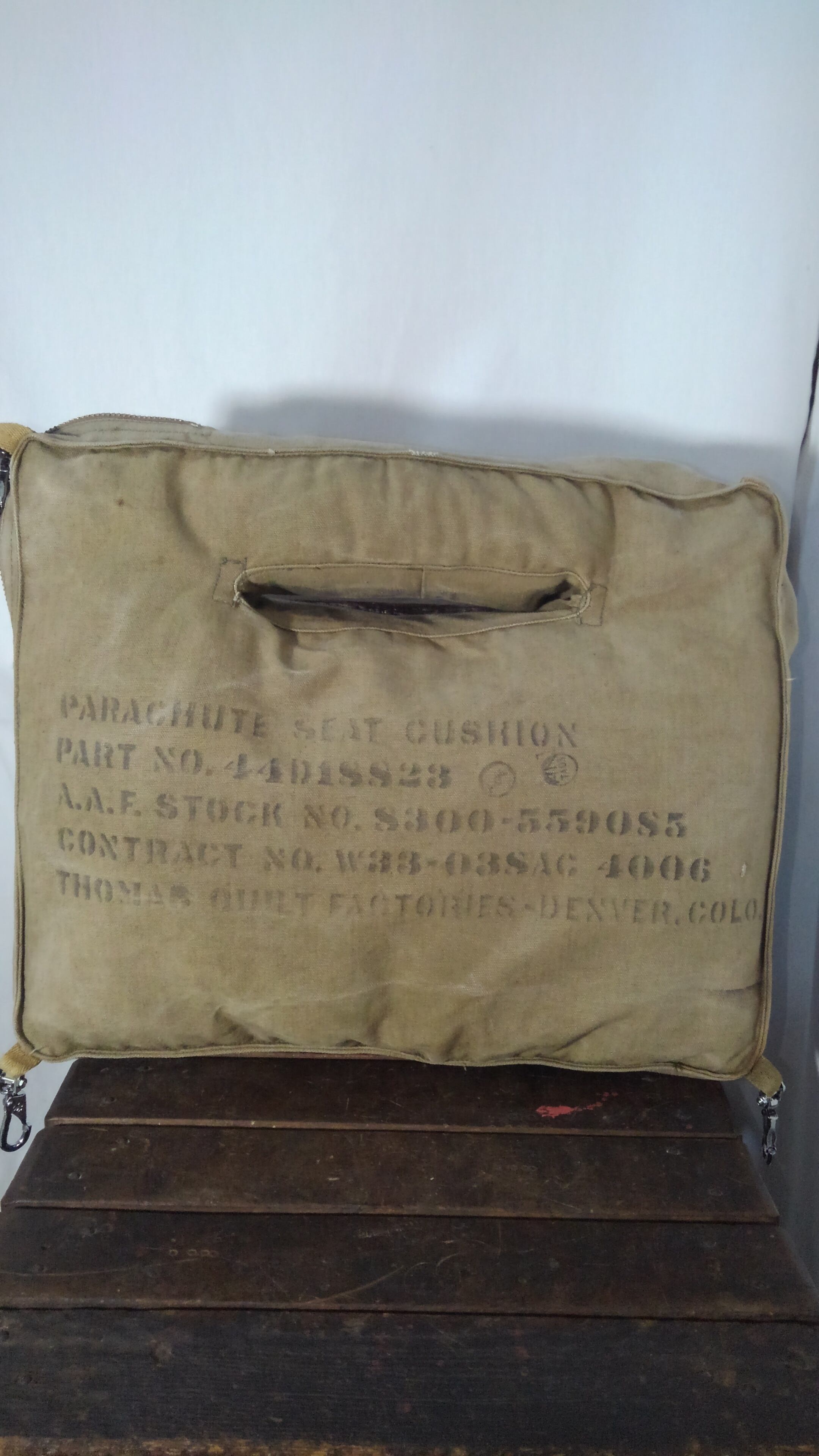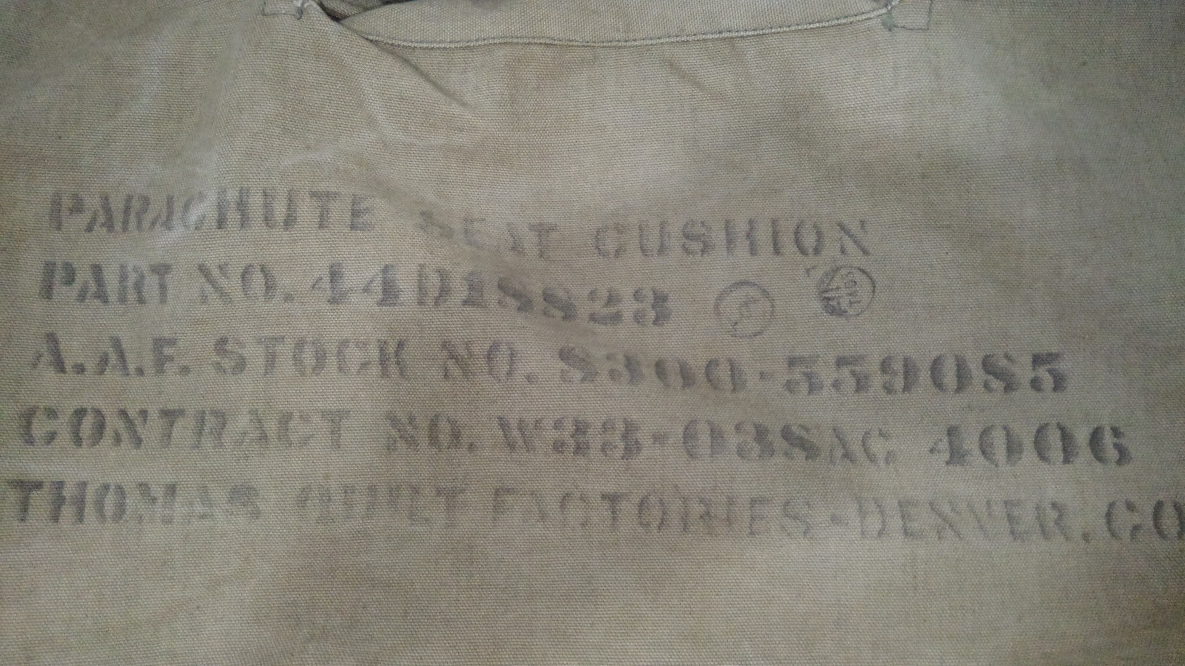 40年代頃の第二次世界大戦時にArmy Air Forces(アメリカ陸軍航空軍)のパイロットに配給され装備していたパラシュートシートクッションのカバーです。側面のステンシルには、部品番号44D18823、AAF在庫番号S300-559085、契約番号W33-038AC 4006、トーマスキルトファクトリーデンバーコロラド、「AN」の刻印があります。