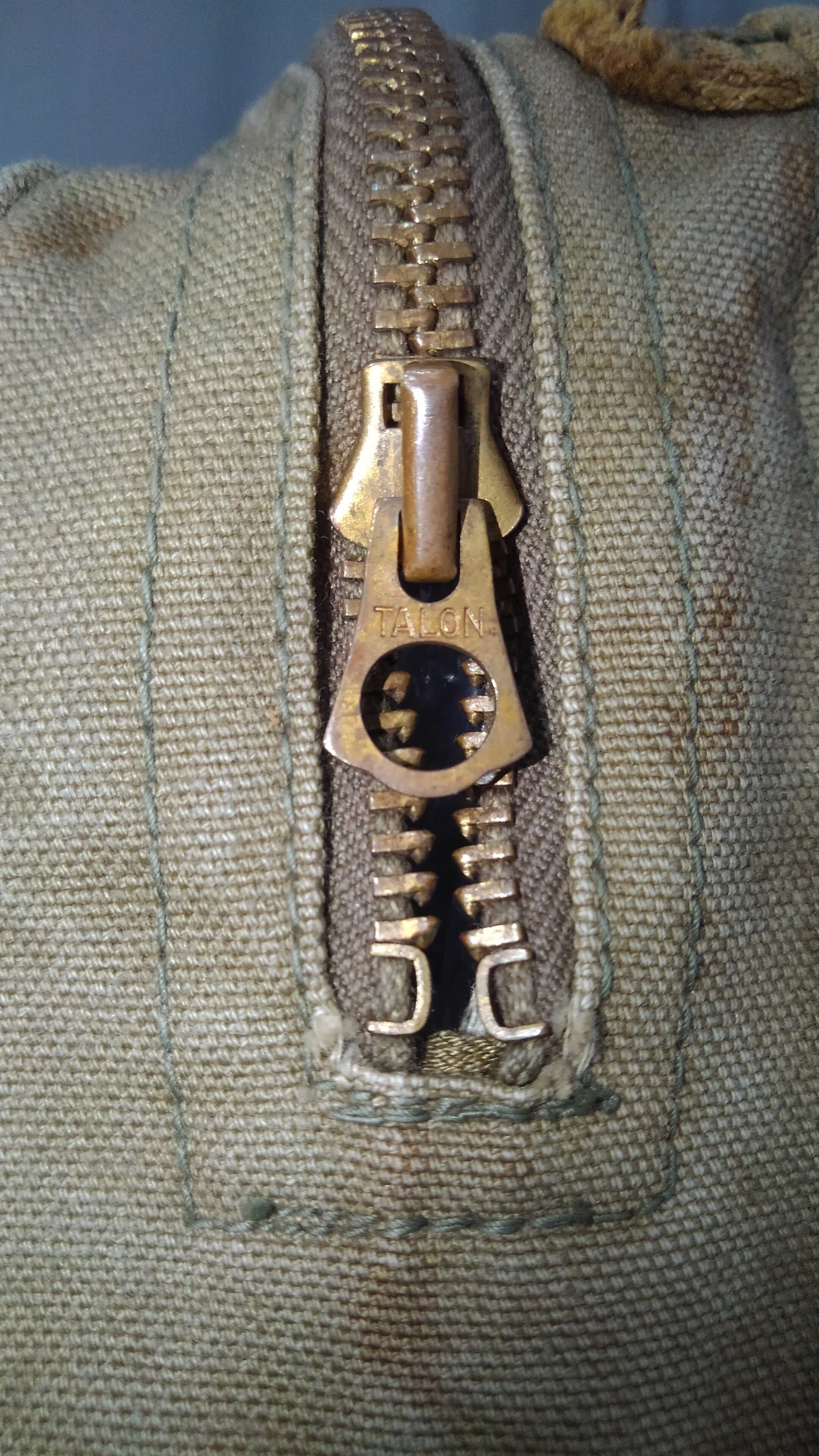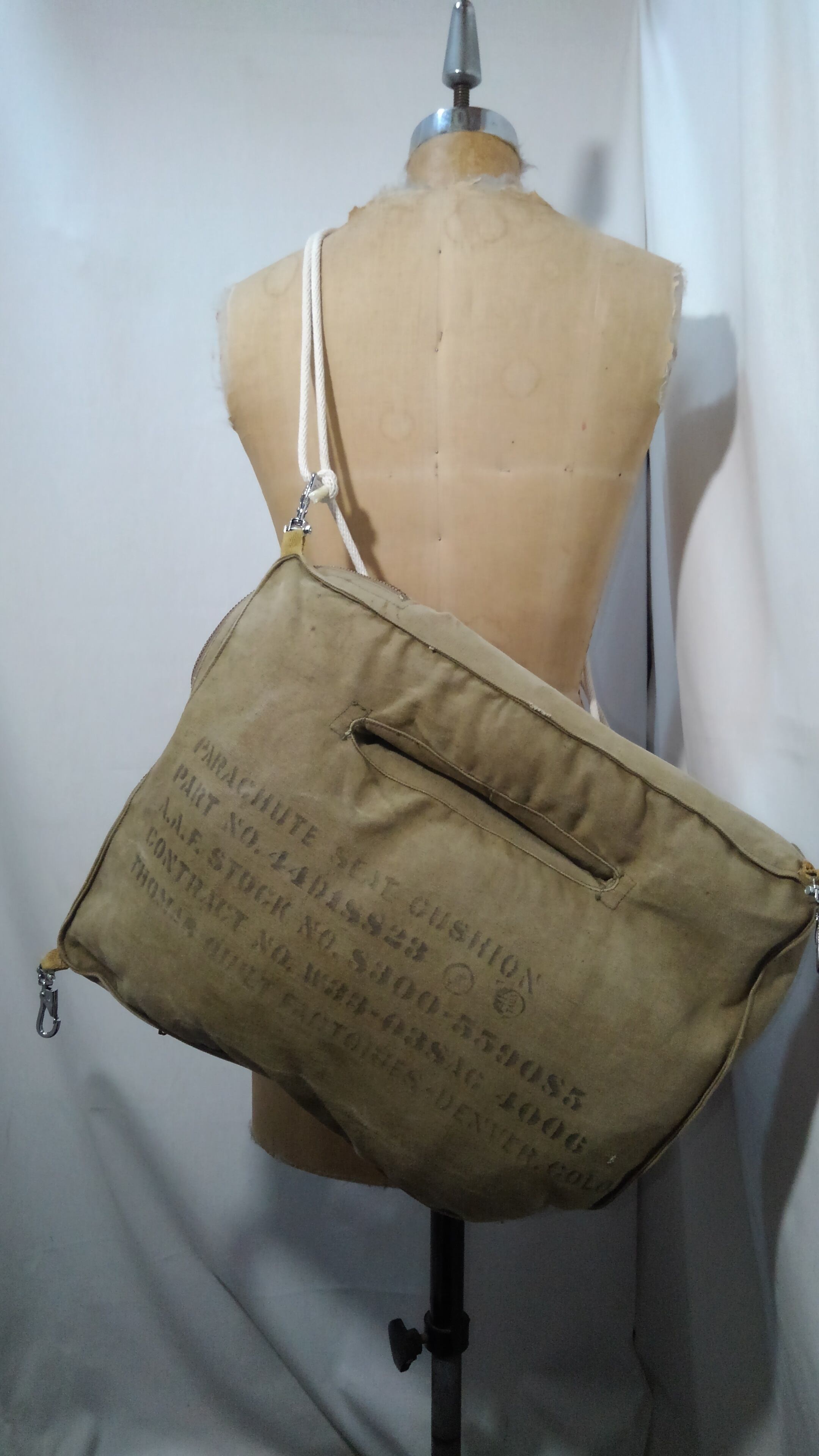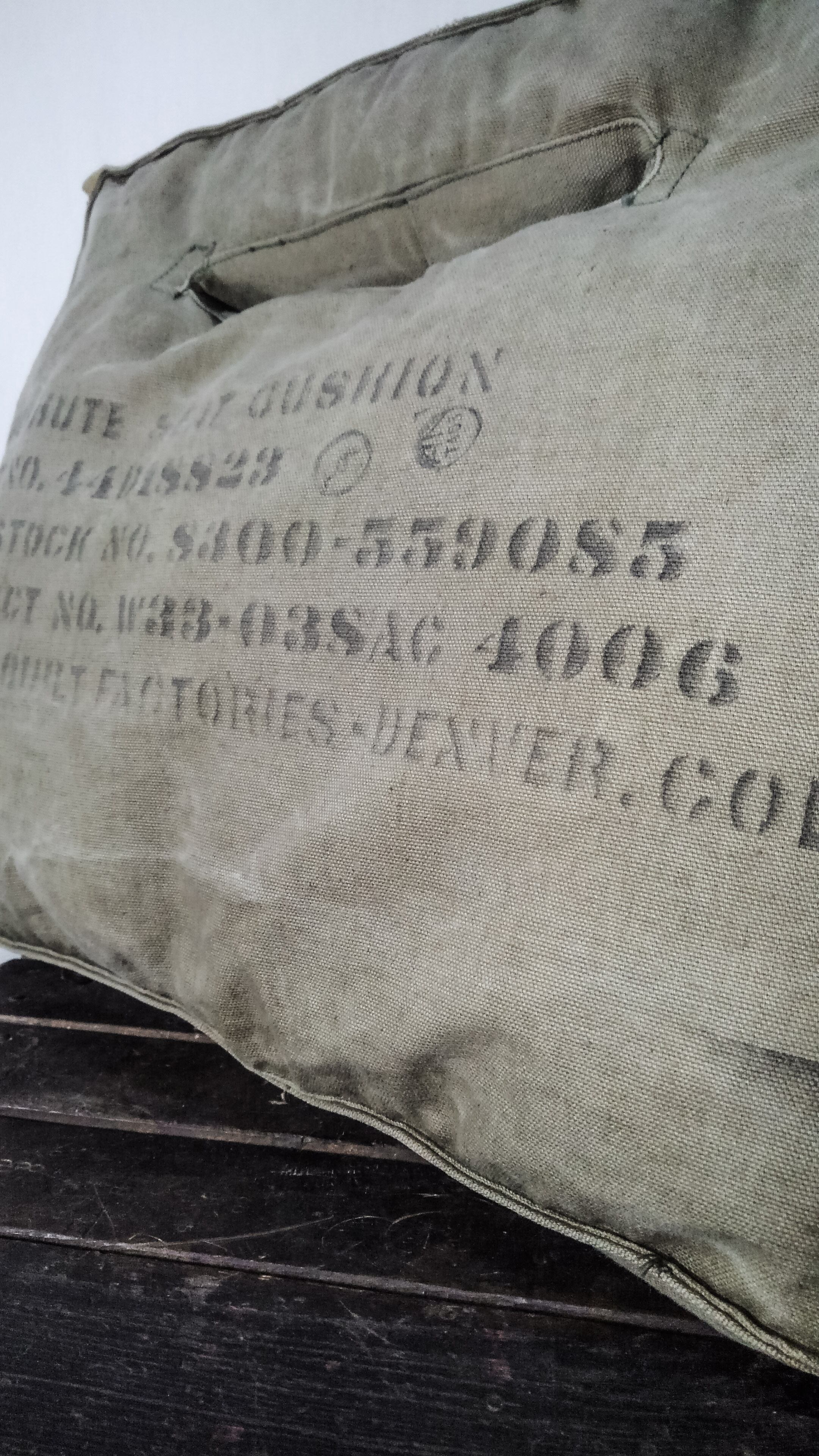 40年代頃の第二次世界大戦時にArmy Air Forces(アメリカ陸軍航空軍)のパイロットに配給され装備していたパラシュートシートクッションのカバーです。側面のステンシルには、部品番号44D18823、AAF在庫番号S300-559085、契約番号W33-038AC 4006、トーマスキルトファクトリーデンバーコロラド、「AN」の刻印があります。