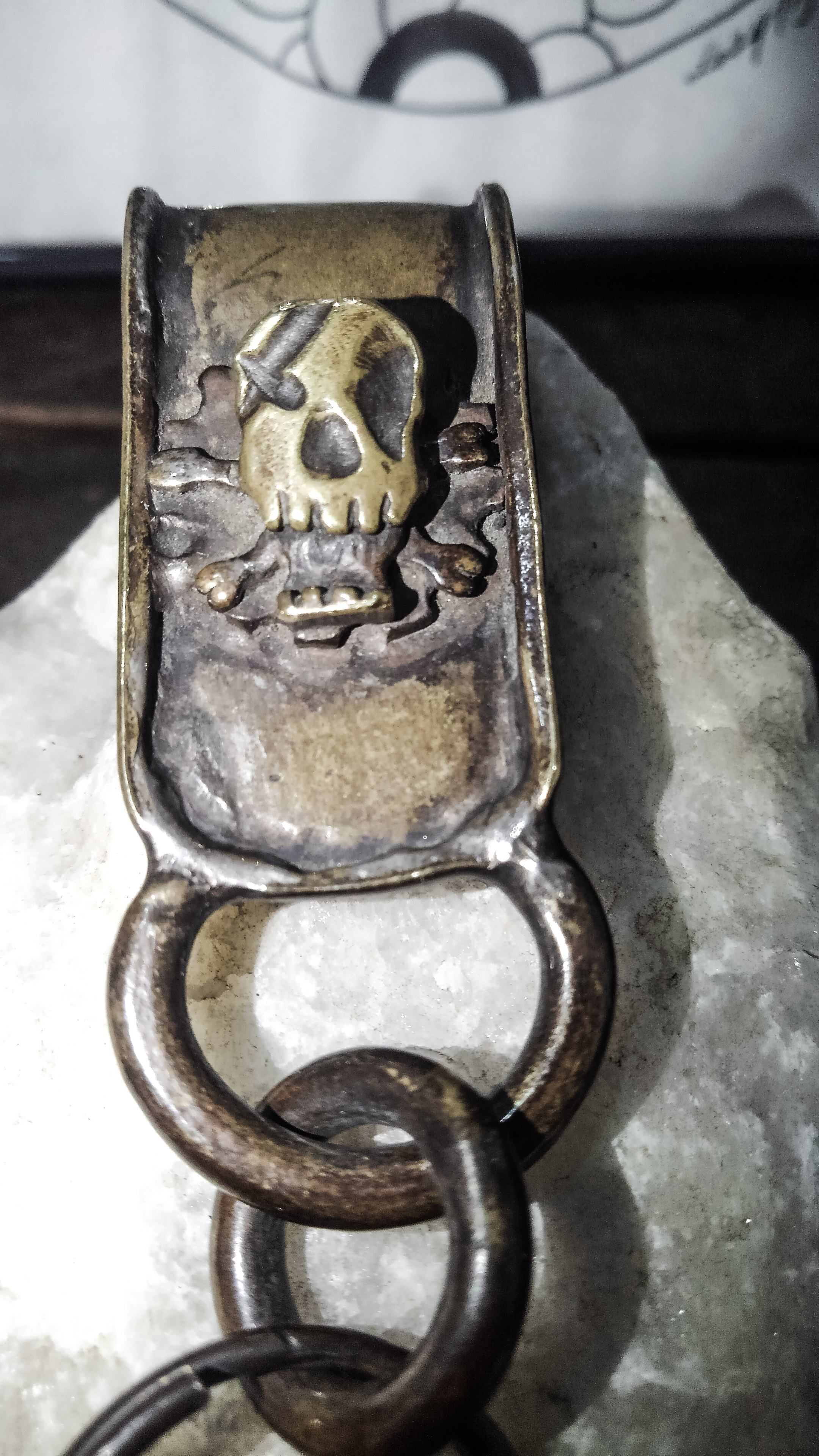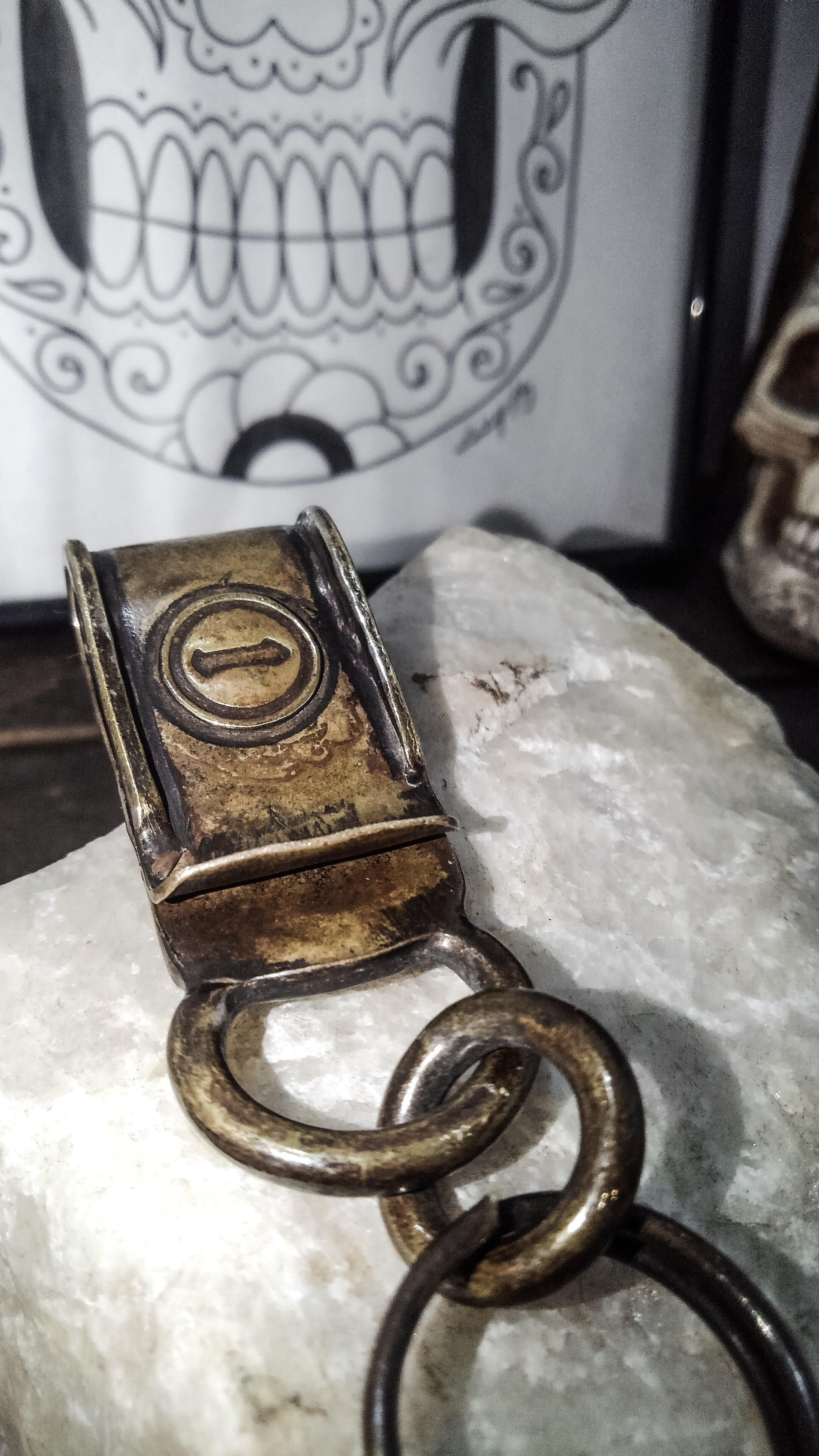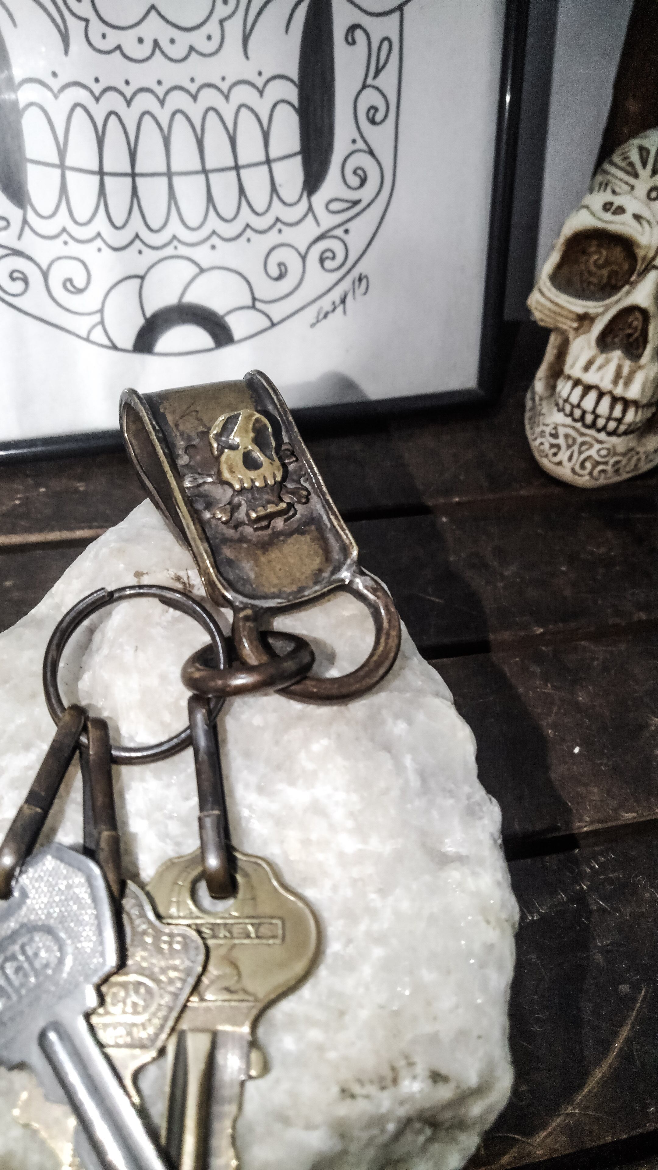 キャストや金型により整形された物ではなく真鍮生地をフリーハンドで削り出しスカルパイレーツをイメージした一点物のキークリップになります。ポケットやバッグの縁等に引っ掻けるタイプです。カギを内側に隠せばブランドロゴが、外側に晒せばスカルが見える仕様となっています。