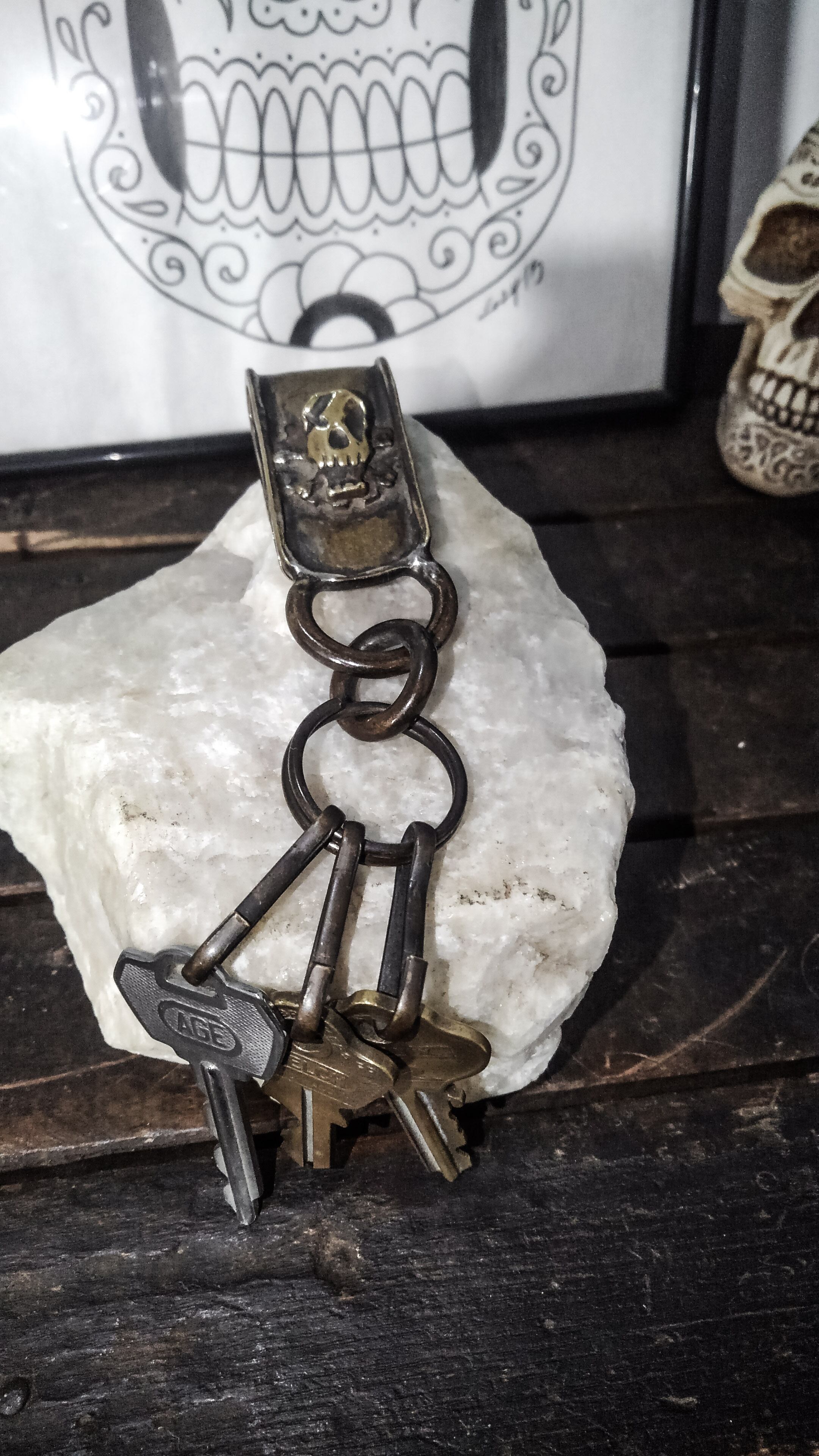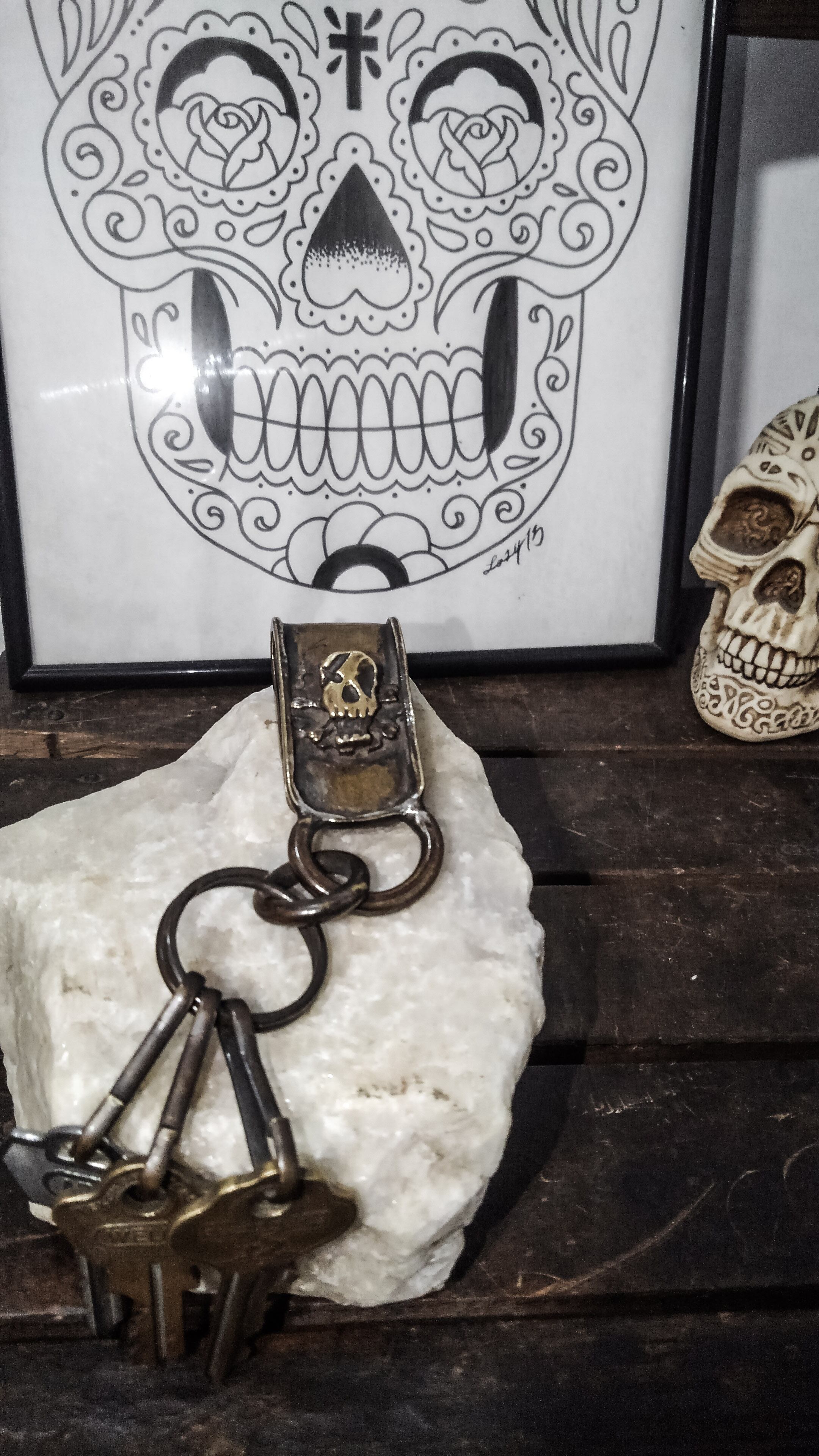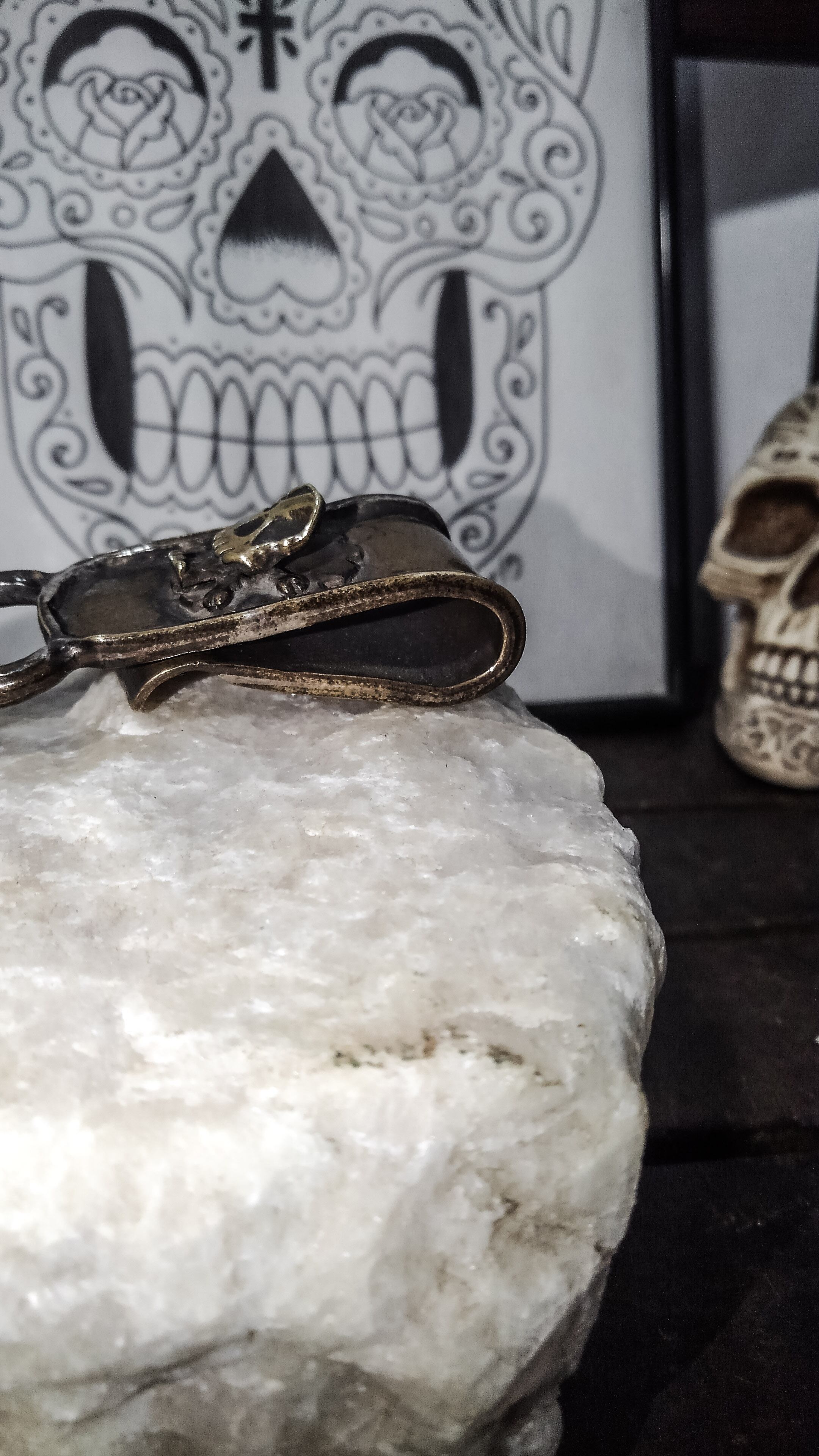 キャストや金型により整形された物ではなく真鍮生地をフリーハンドで削り出しスカルパイレーツをイメージした一点物のキークリップになります。ポケットやバッグの縁等に引っ掻けるタイプです。カギを内側に隠せばブランドロゴが、外側に晒せばスカルが見える仕様となっています。