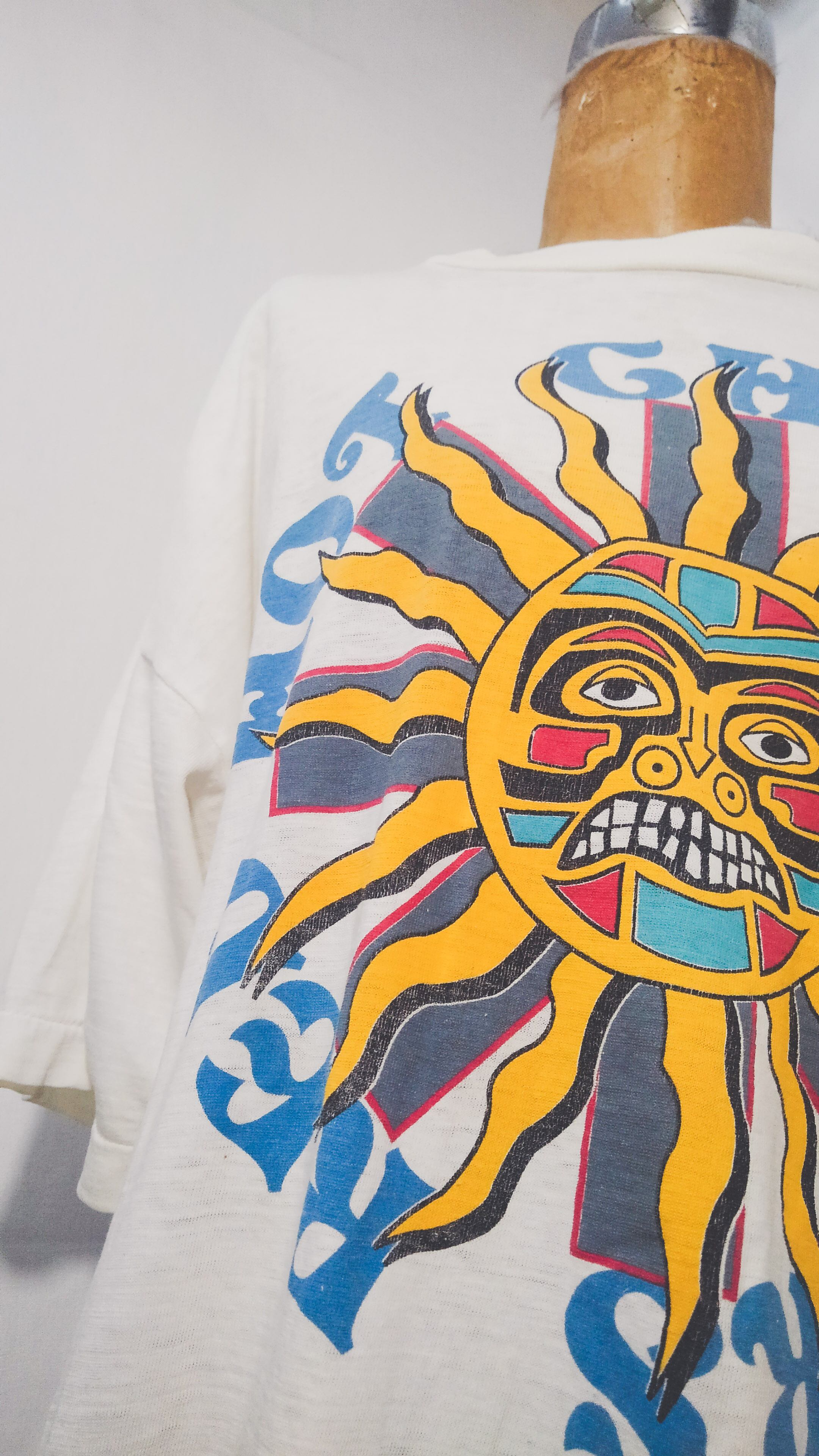 全体的に使用感があり、首回りの薄い黄ばみ等ありますが、この手のバンドTとしては丁度良いくらいのヘタレ具合。