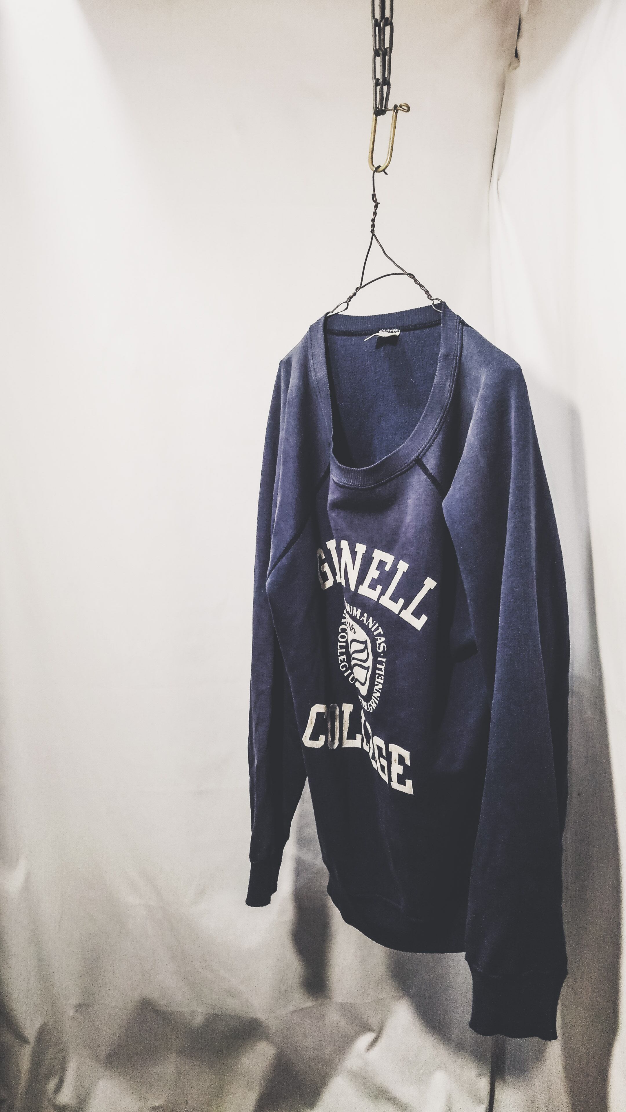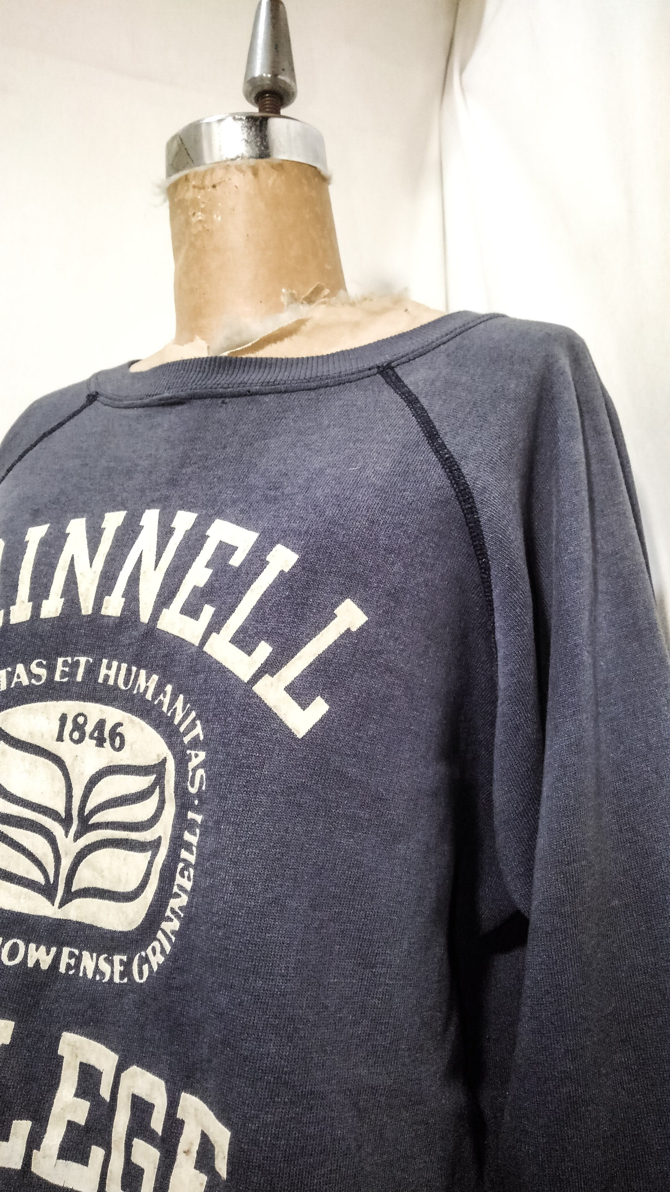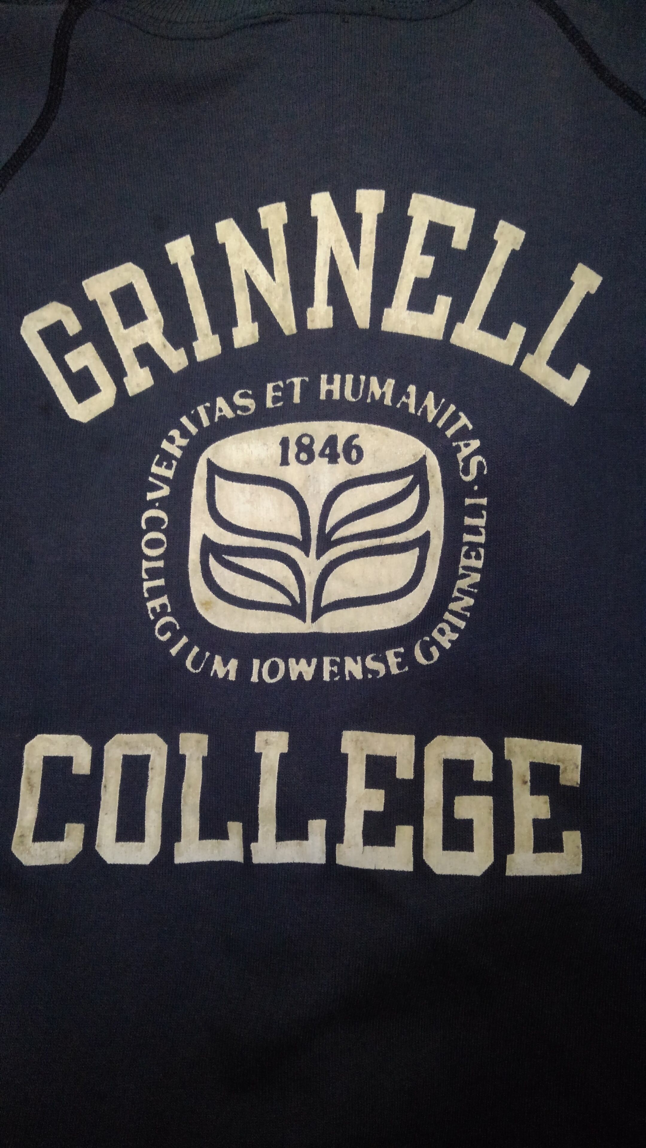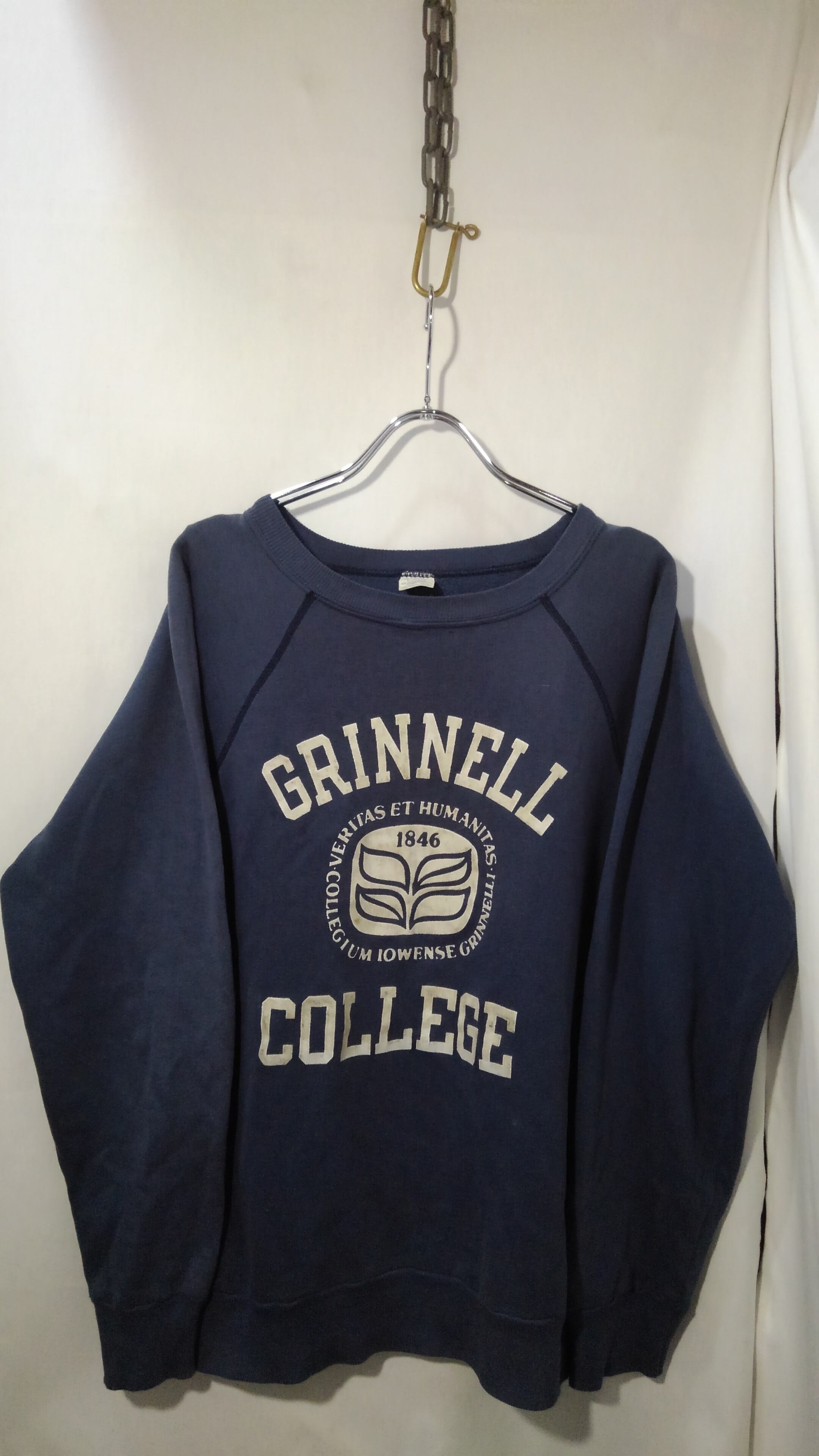 アメリカのアイオワ州にあるグリネル大学のスウェットで80年代中期~後期のトリコタグがついた濃紺のチャンピオンボディにフロッキーの三段プリント。
