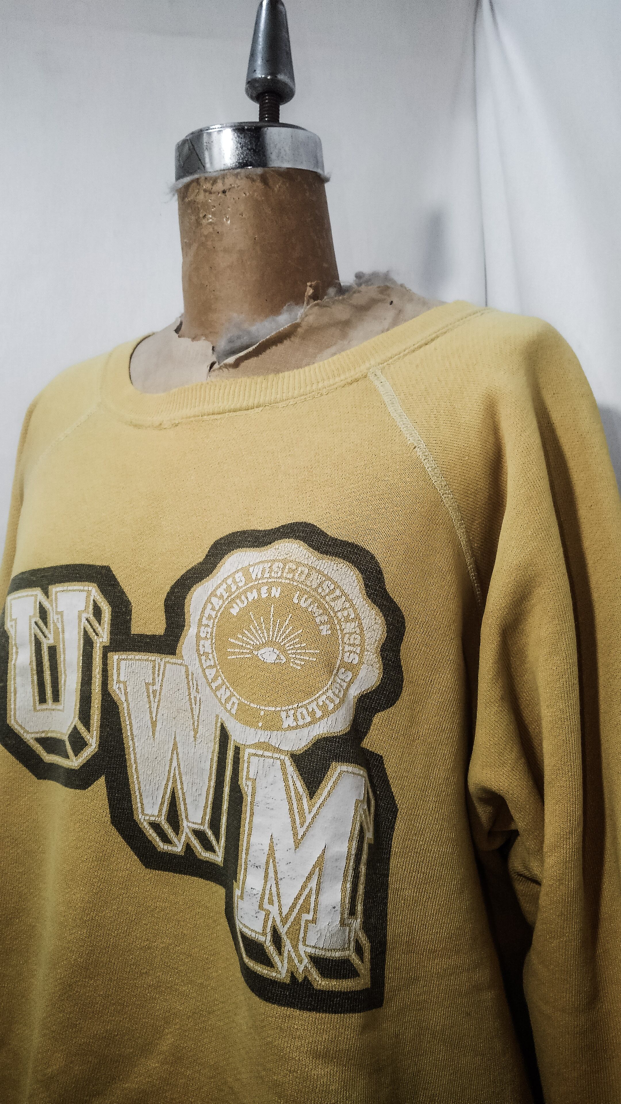 頭文字の「UWM」と校章のラバーと染み込みプリントのコンビで各州のカレッジスウェットでこのプリントデザインはときより見かけます。