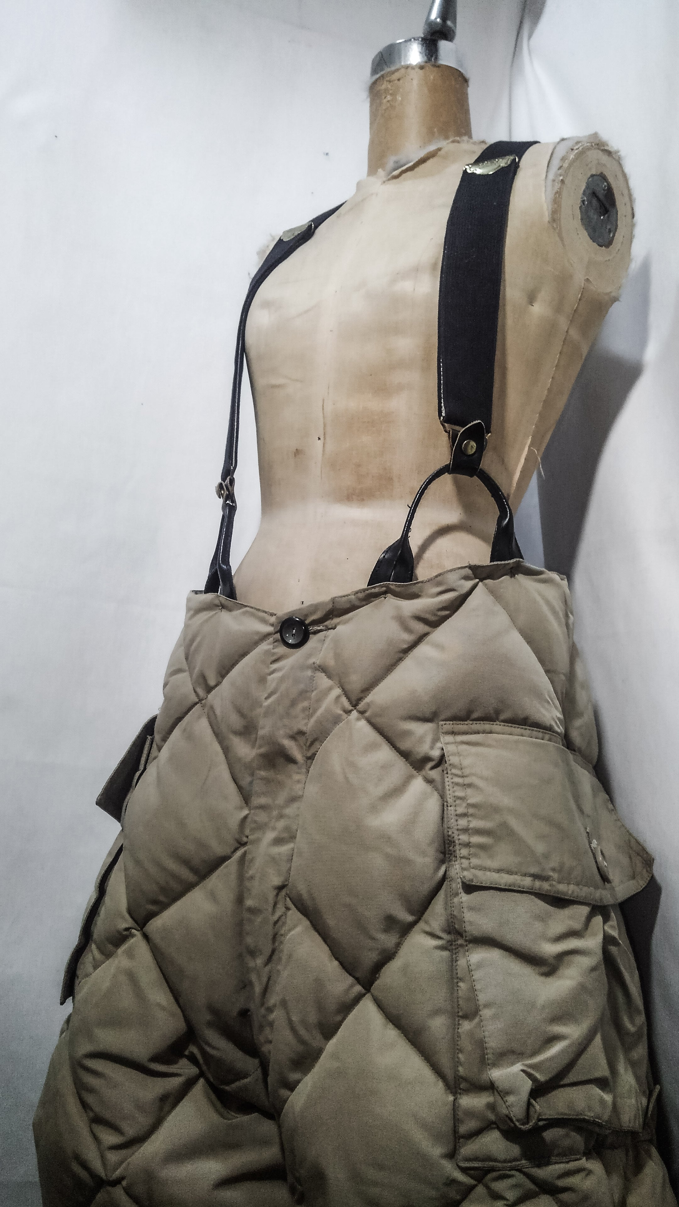 付属のサスペンダーのゴム部分、レザー部分共に良好。表面は60/40クロスで中にはグースダウンがパンパンに詰まっており、保温性はトップクラス。特徴的なダイヤカットのキルティング 。