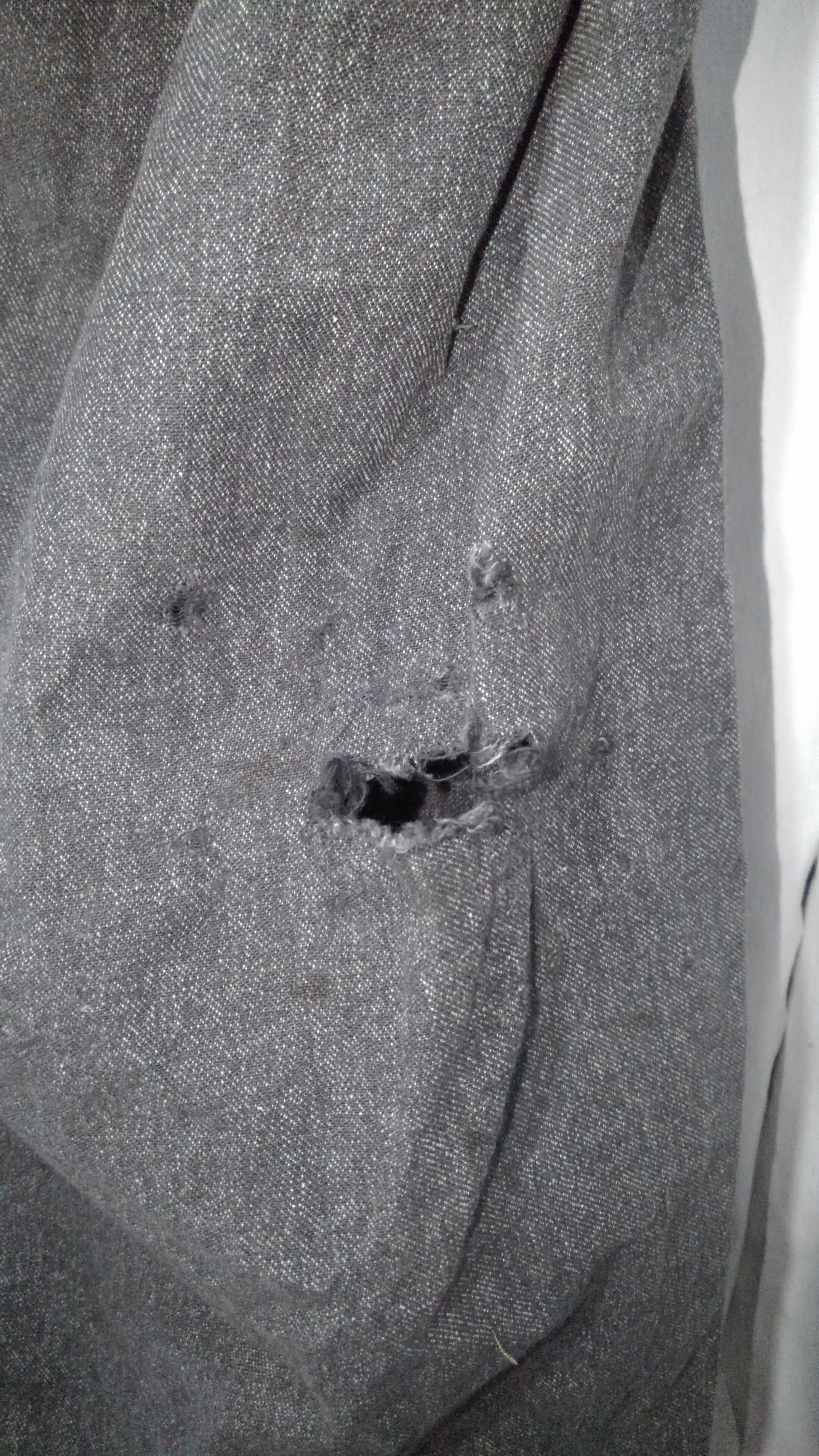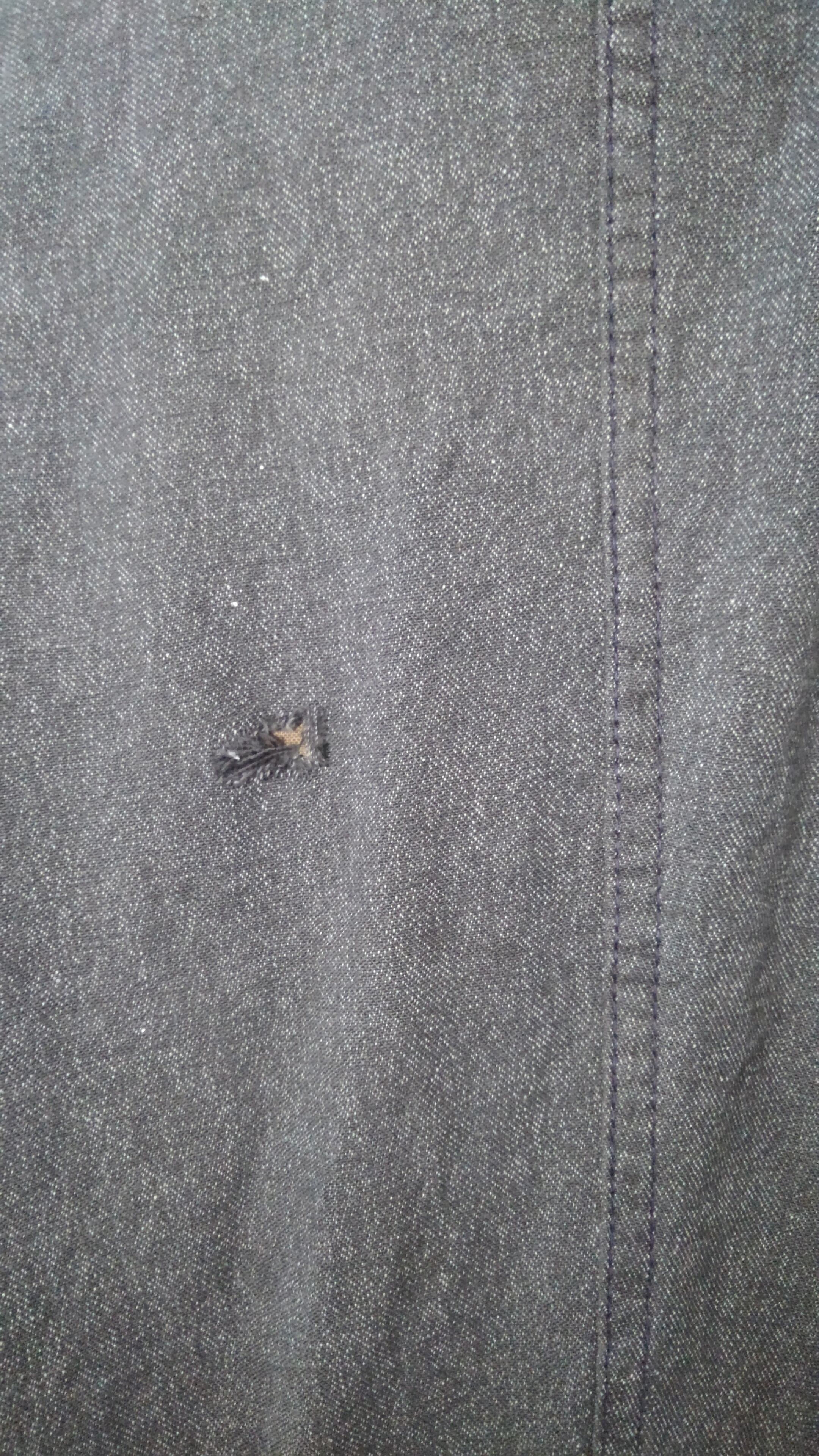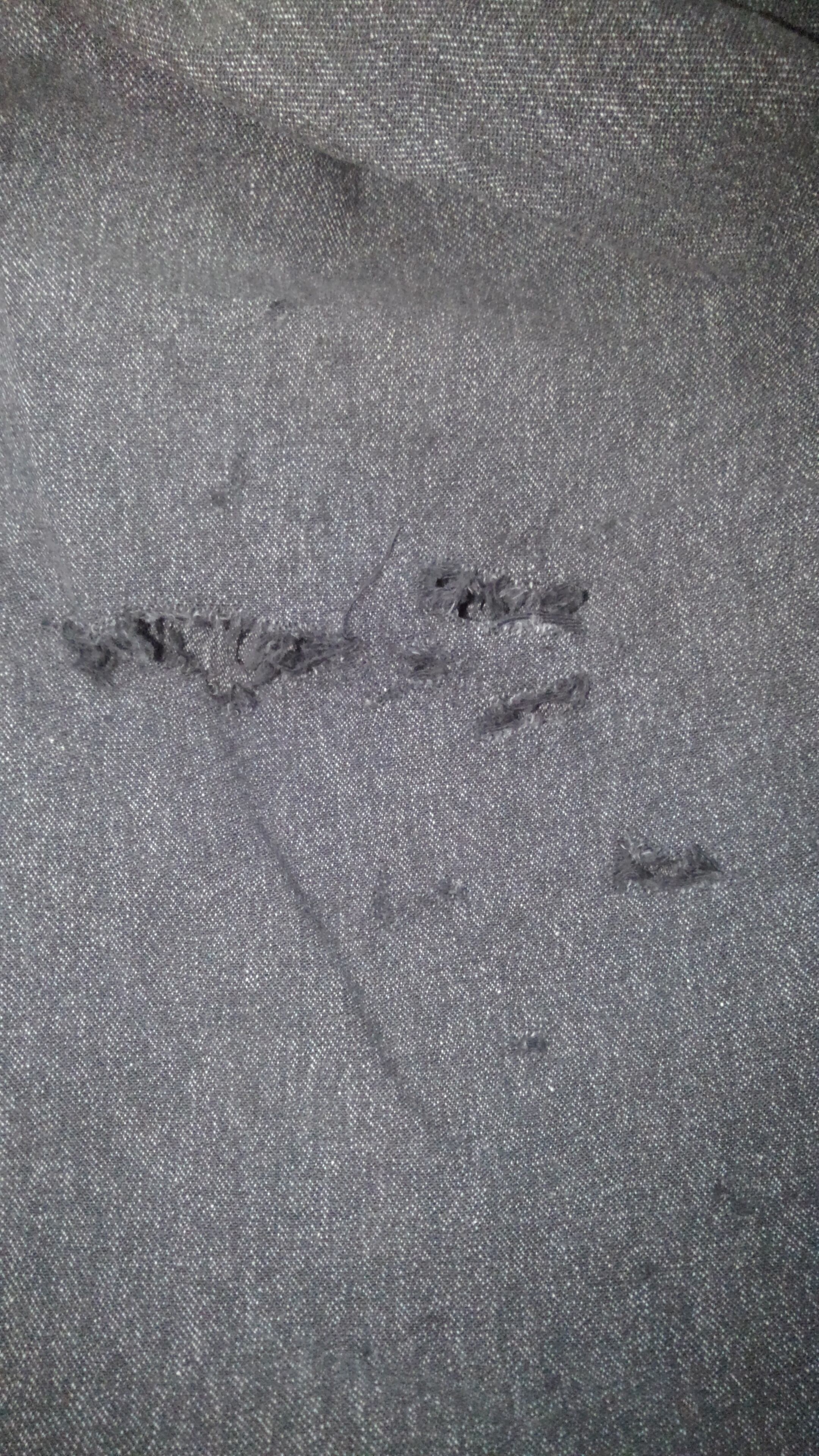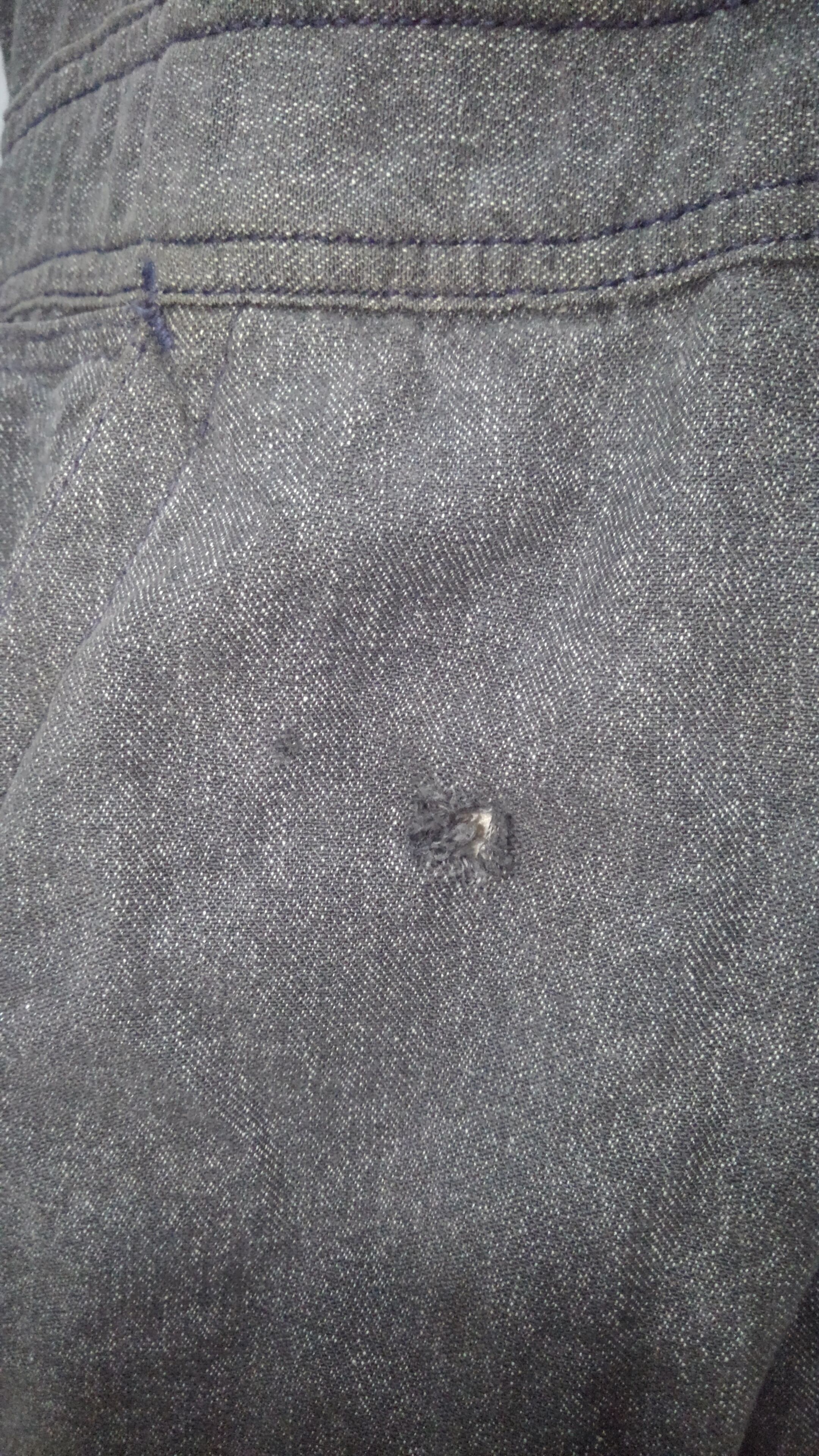 数ヶ所大きめな破れがあり、それほど目立つ箇所ではなく膝裏のダメージはロールアップしてしまえば隠れてしまうと思います。気になる方は簡単なステッチで補修出来そうです。