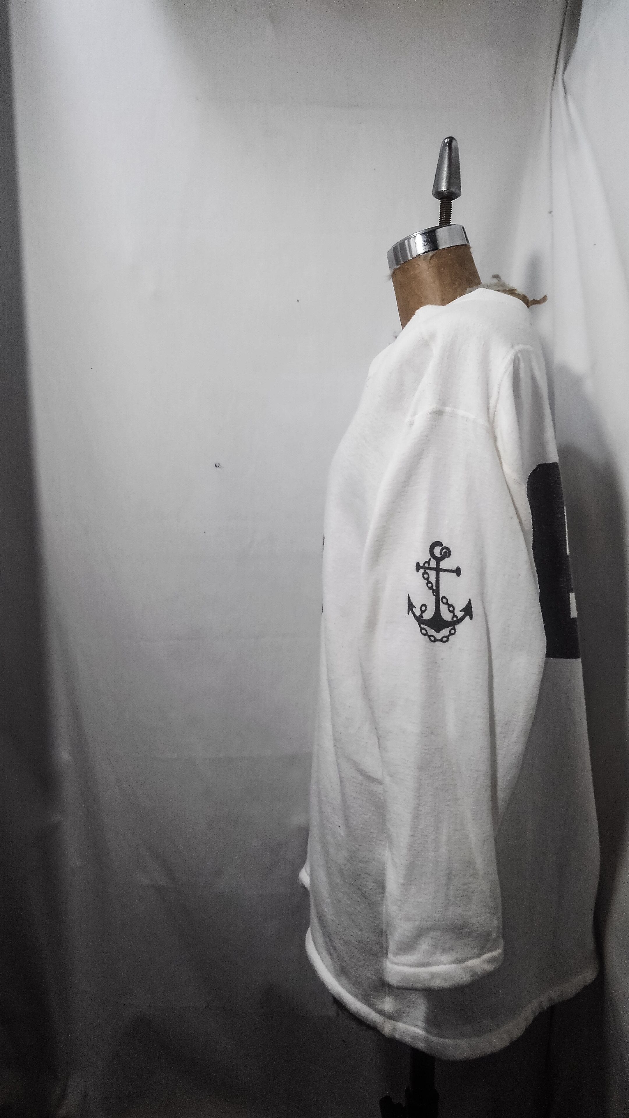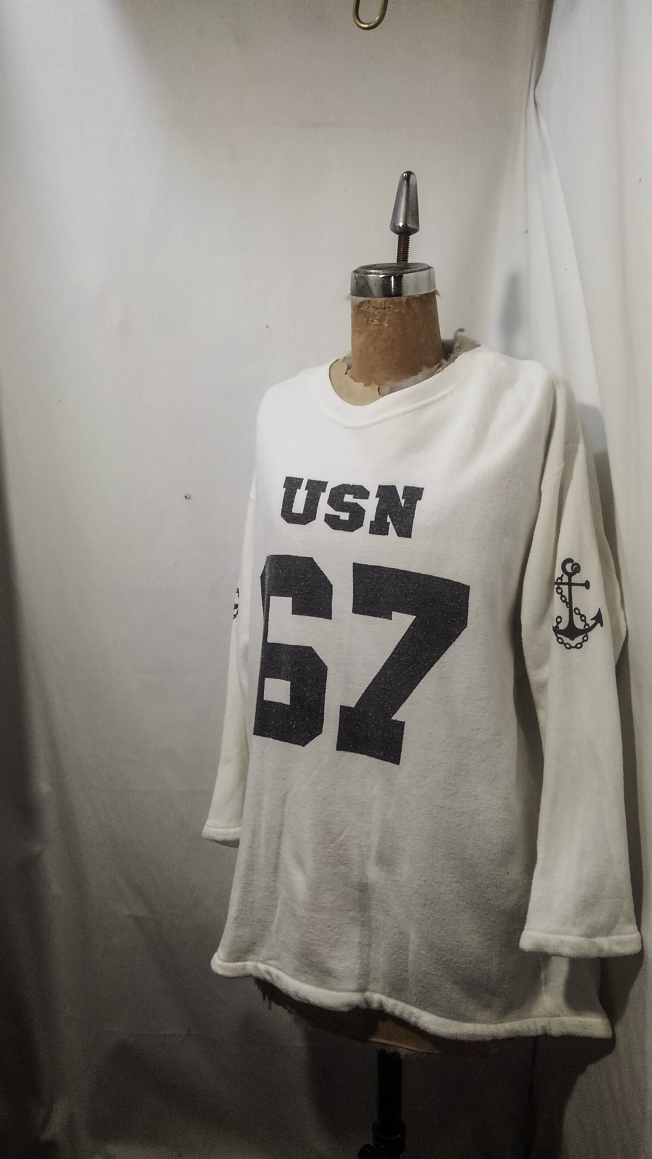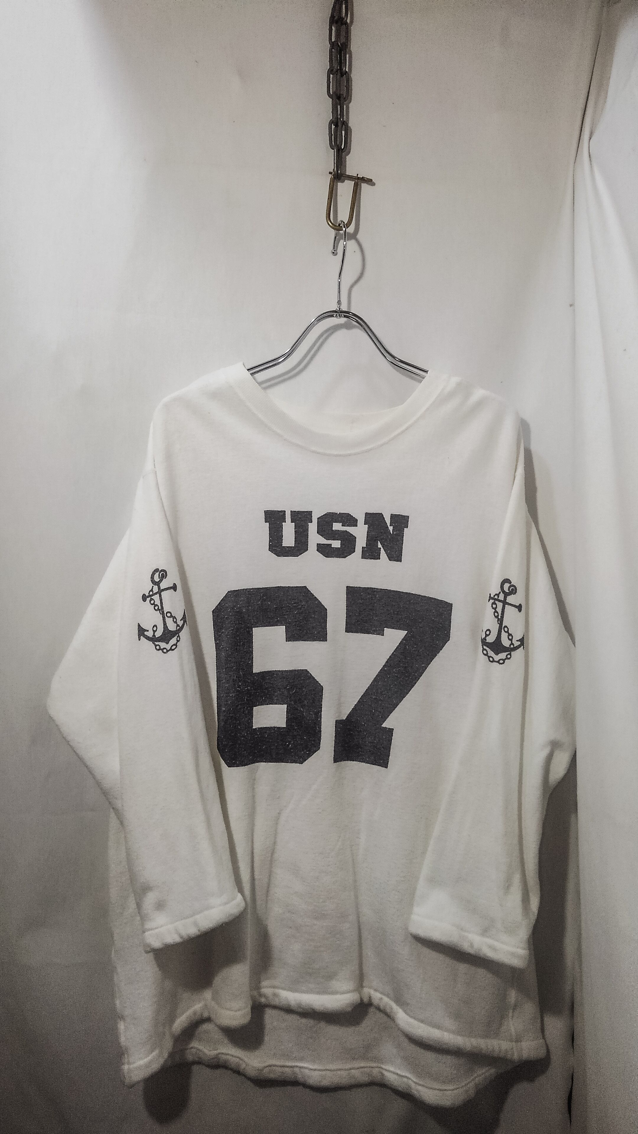 80~90年代頃のU.S.N.のロングスリーブTシャツです。元々着丈の長いロングワンピース(スリーピングシャツ?)だった物を着丈袖をカットしたリメイク物だと思われます。