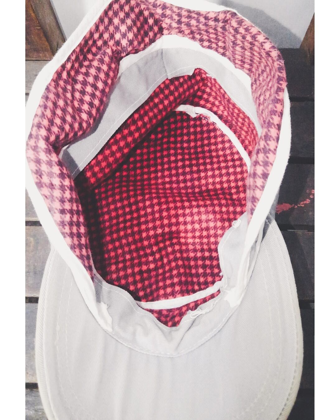 フロントにストラップが備わっているのが特徴的で、内側には千鳥格子の赤黒の質感の良いフランネルの生地が張られ、イヤーガード付きの贅沢な作りです。