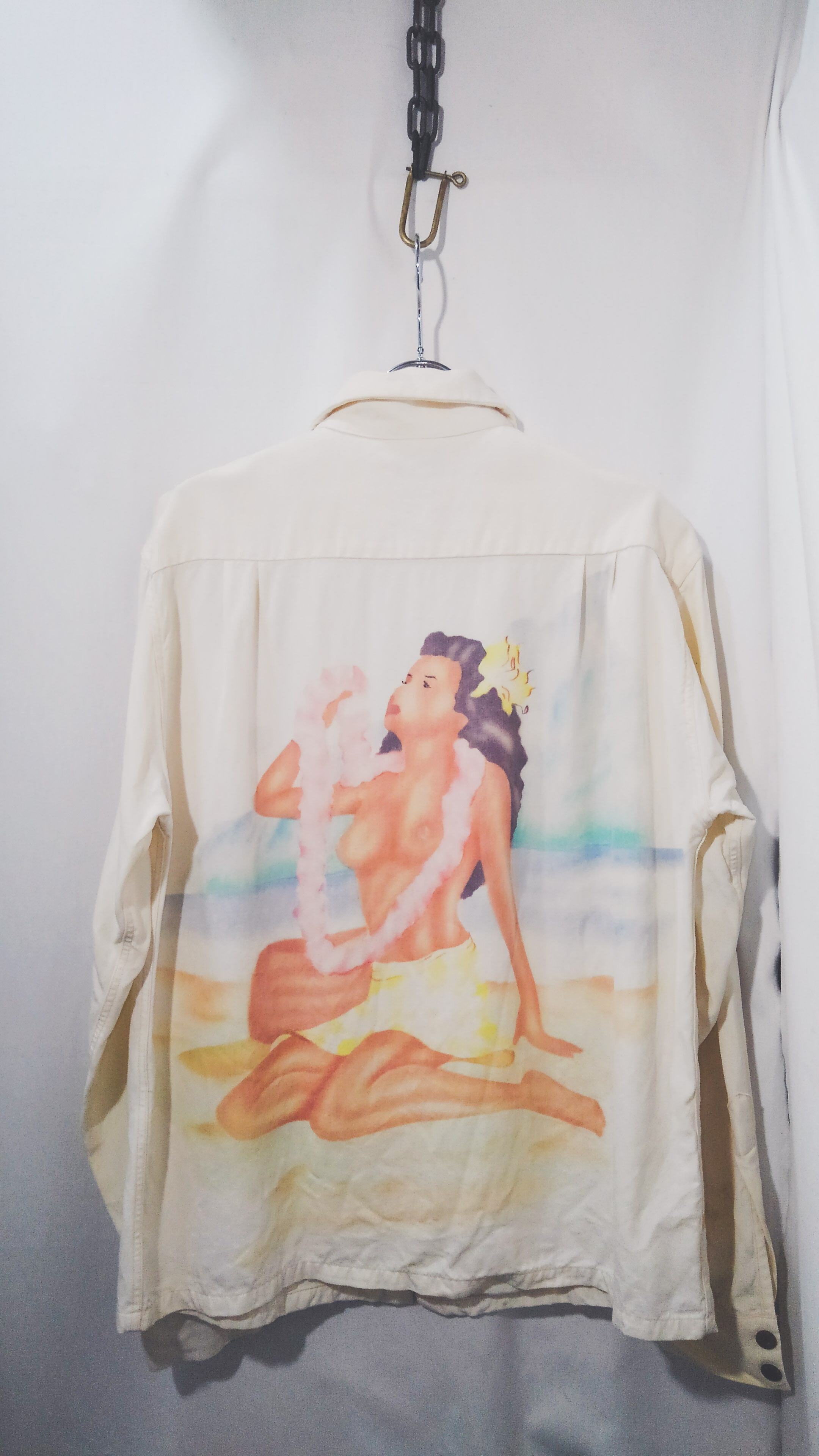 ヴィンテージハワイアンシャツのジャンルの中では珍品として扱われ、いわゆるテキスタイルデザインとしてのプリントデザインではなく、エアーブラシによって手描きされた一点もので、希少価値の高い手作りのハワイアンシャツ。このようなシャツは50年代終わり頃から60年代の初め、ワイキキの表通り近辺で道行く観光客を捕まえ大道芸さながらにエアー・ブラシで描かれたもので、パフォーマンスとしても人気があったそう。モチーフは一番人気のフラガールがピンナップのように描かれています。