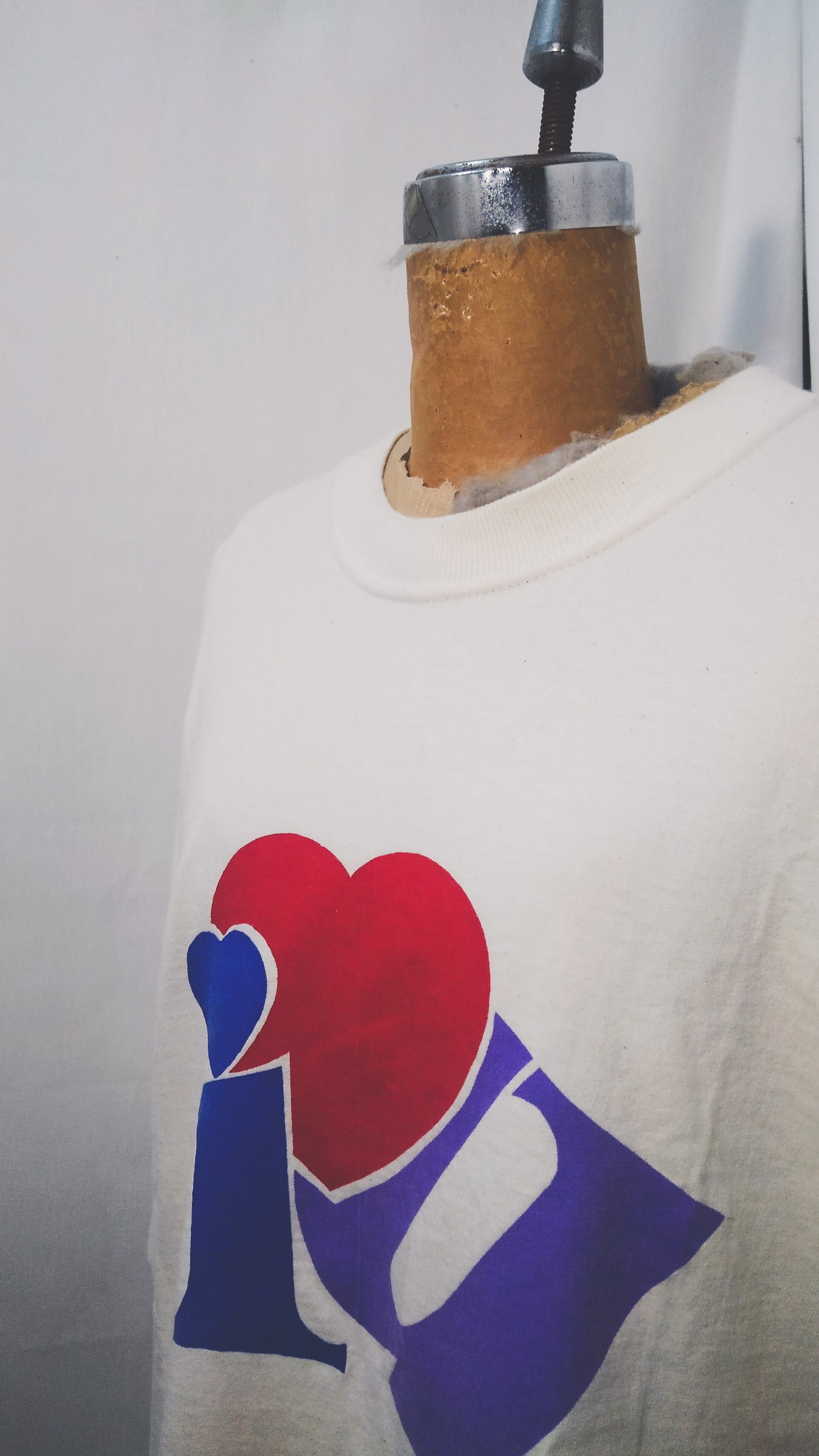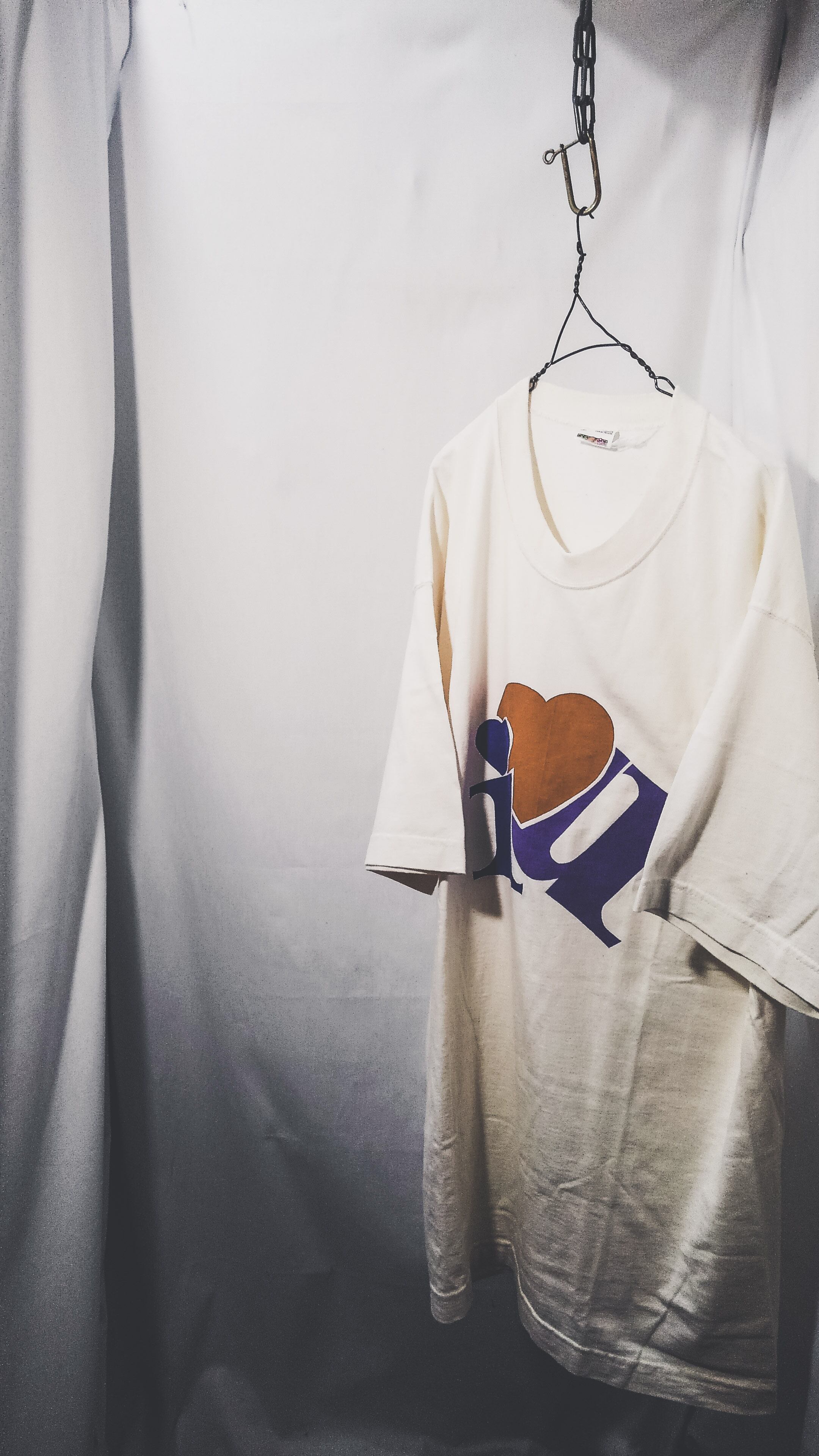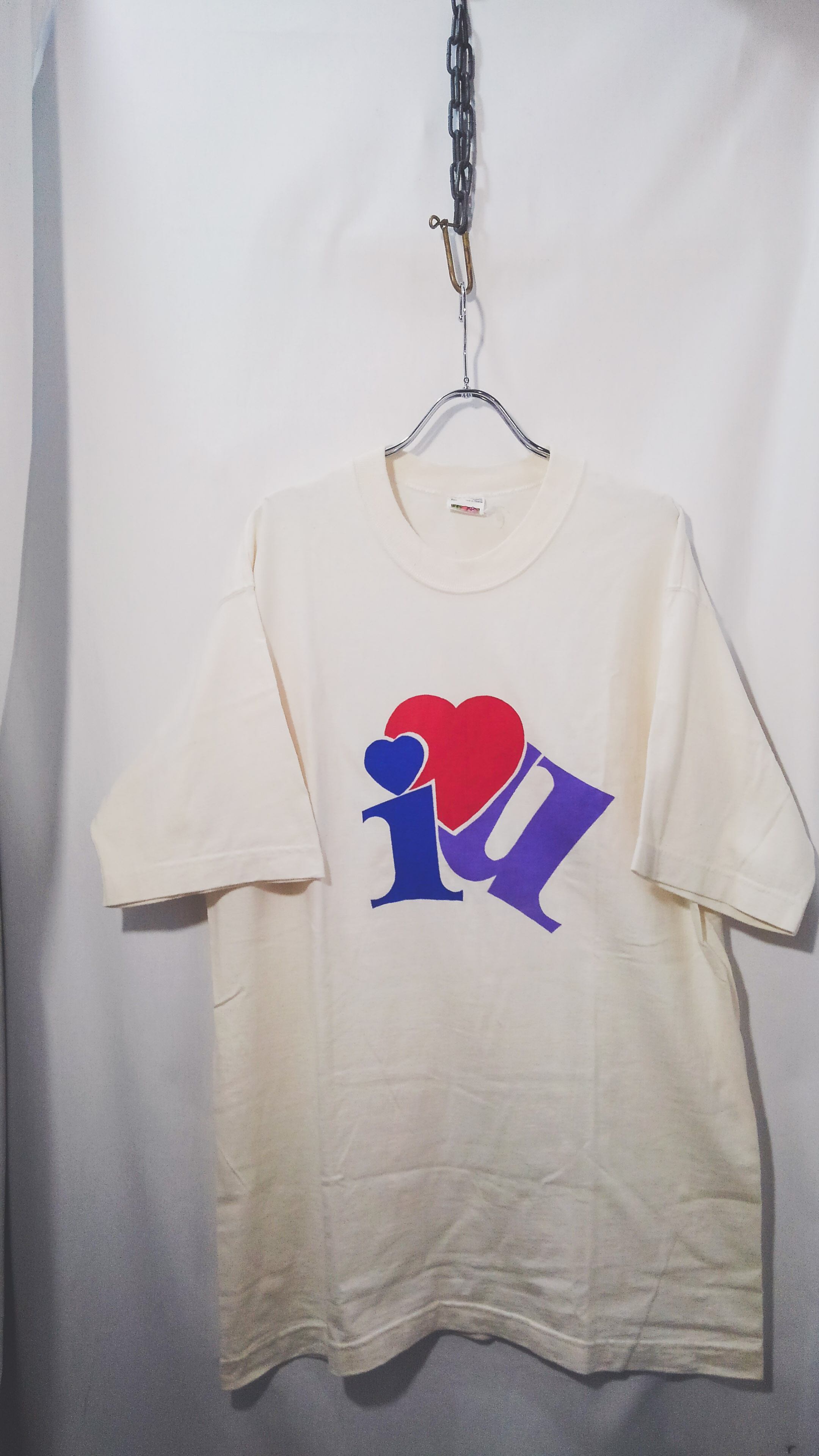 90年代前半頃のアメリカ製フルーツオブザルームの肉厚な丸胴コットンボディに「i love u」のかわいいプリントデザイン。