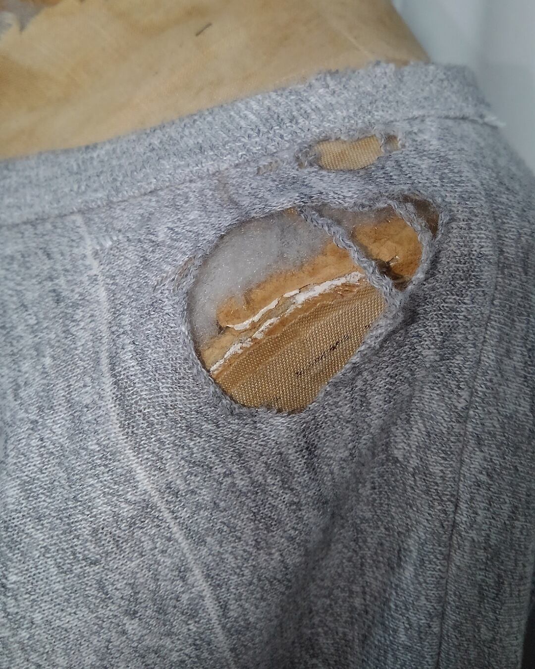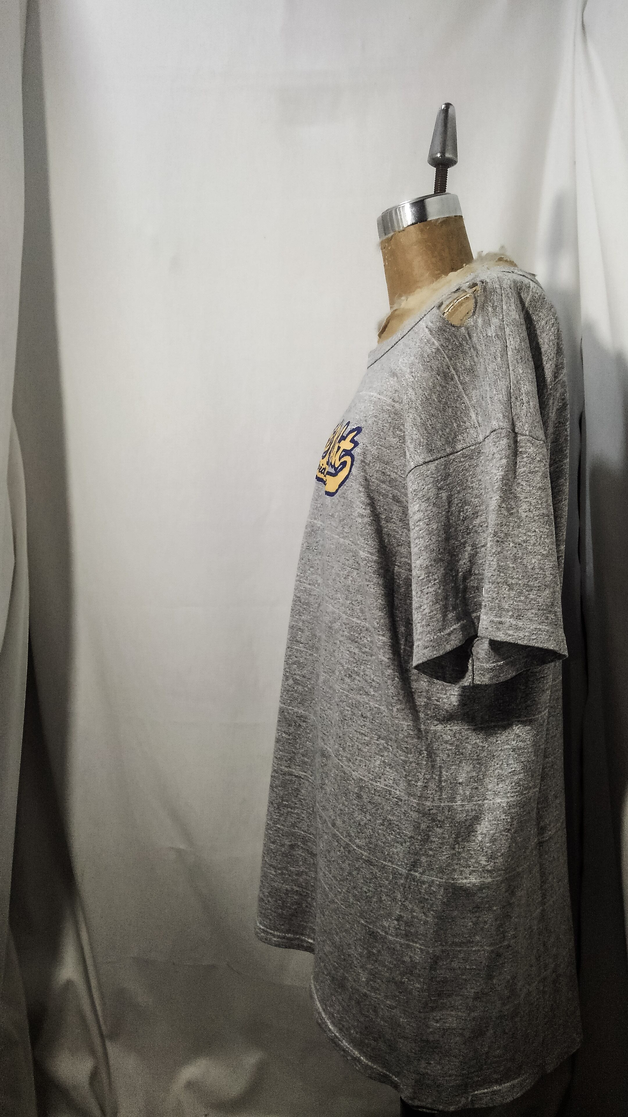 左肩に大きなダメージがありますが、オーバーサイズで肩を落としたり、着こなしのアレンジなどでお楽しみいただけるデザイン性の強いポジティブダメージです。