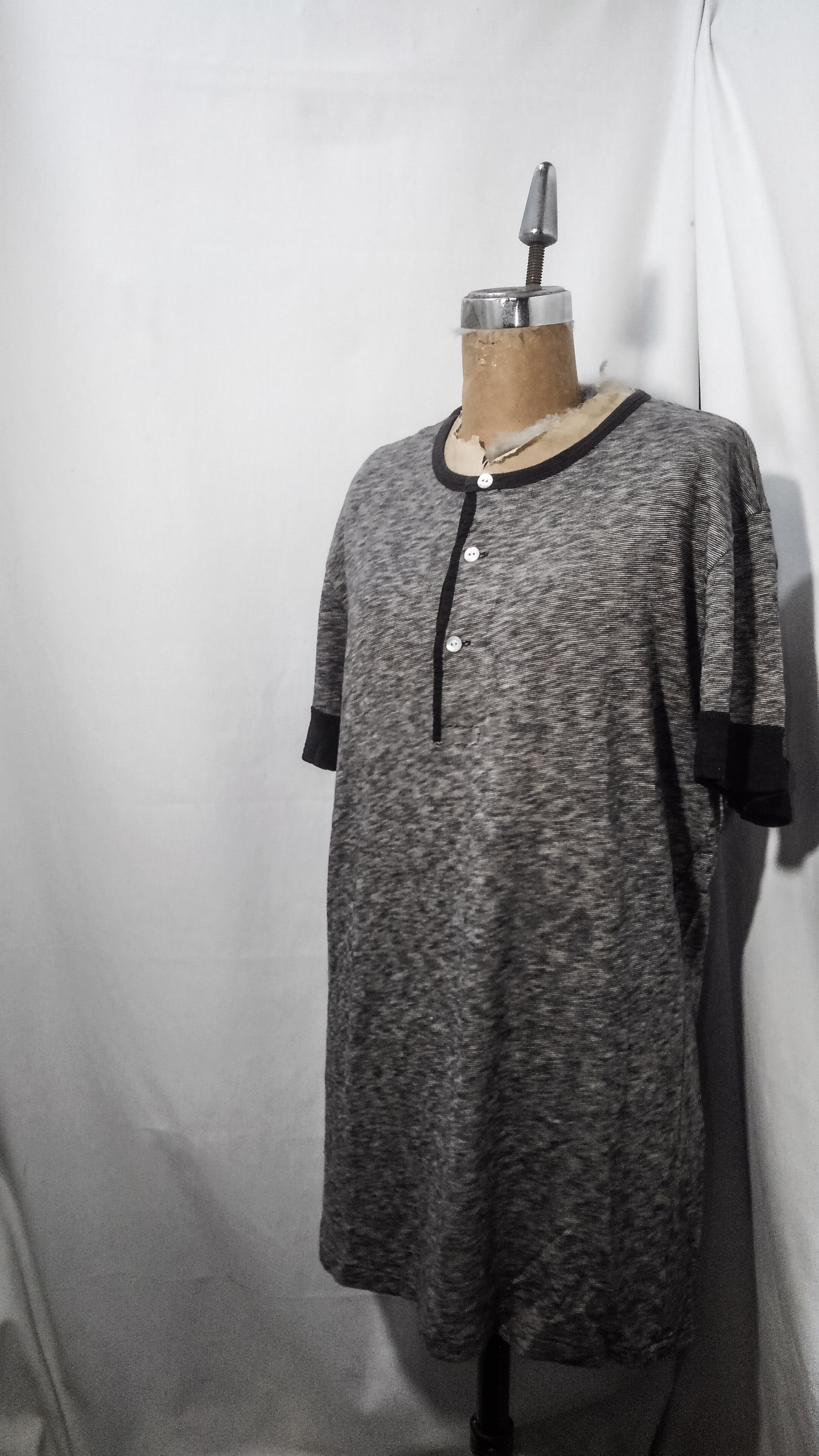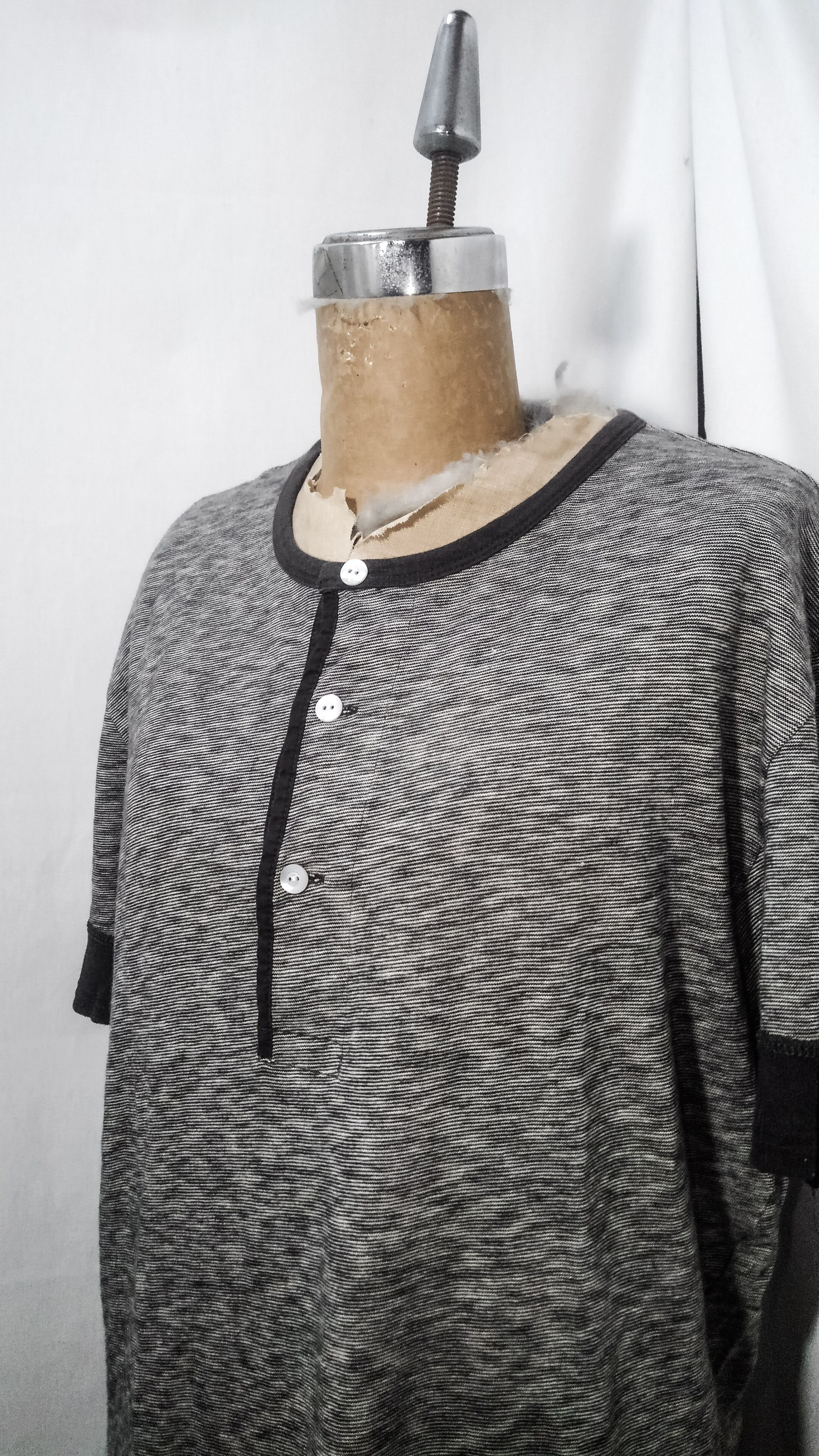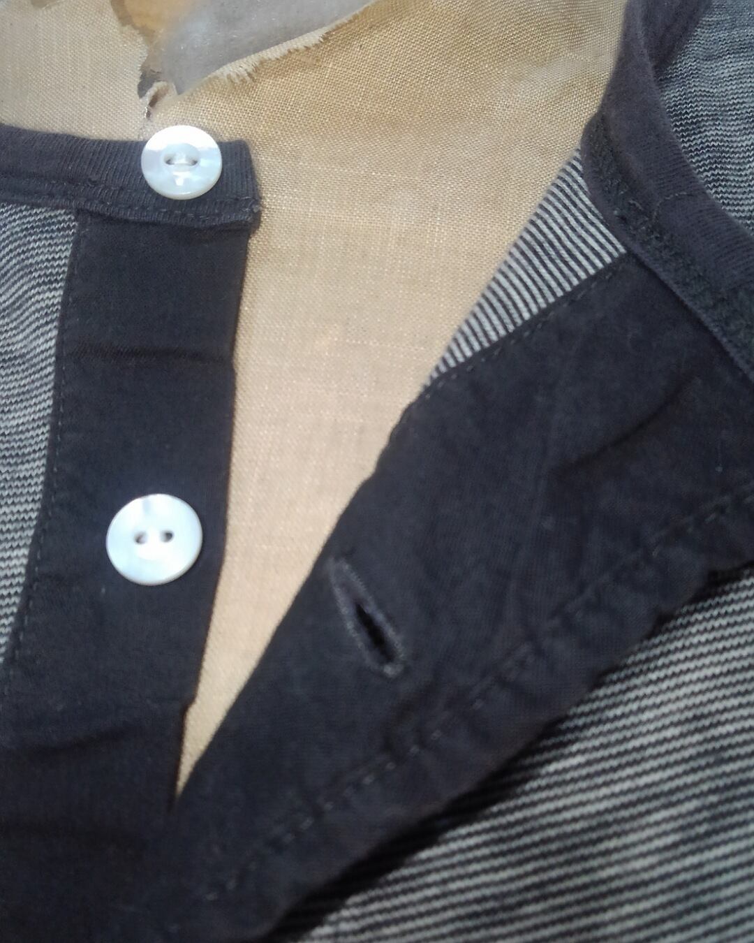 杢グレーのボディにダークブラウンのパイピングのヘンリーネックTシャツ。