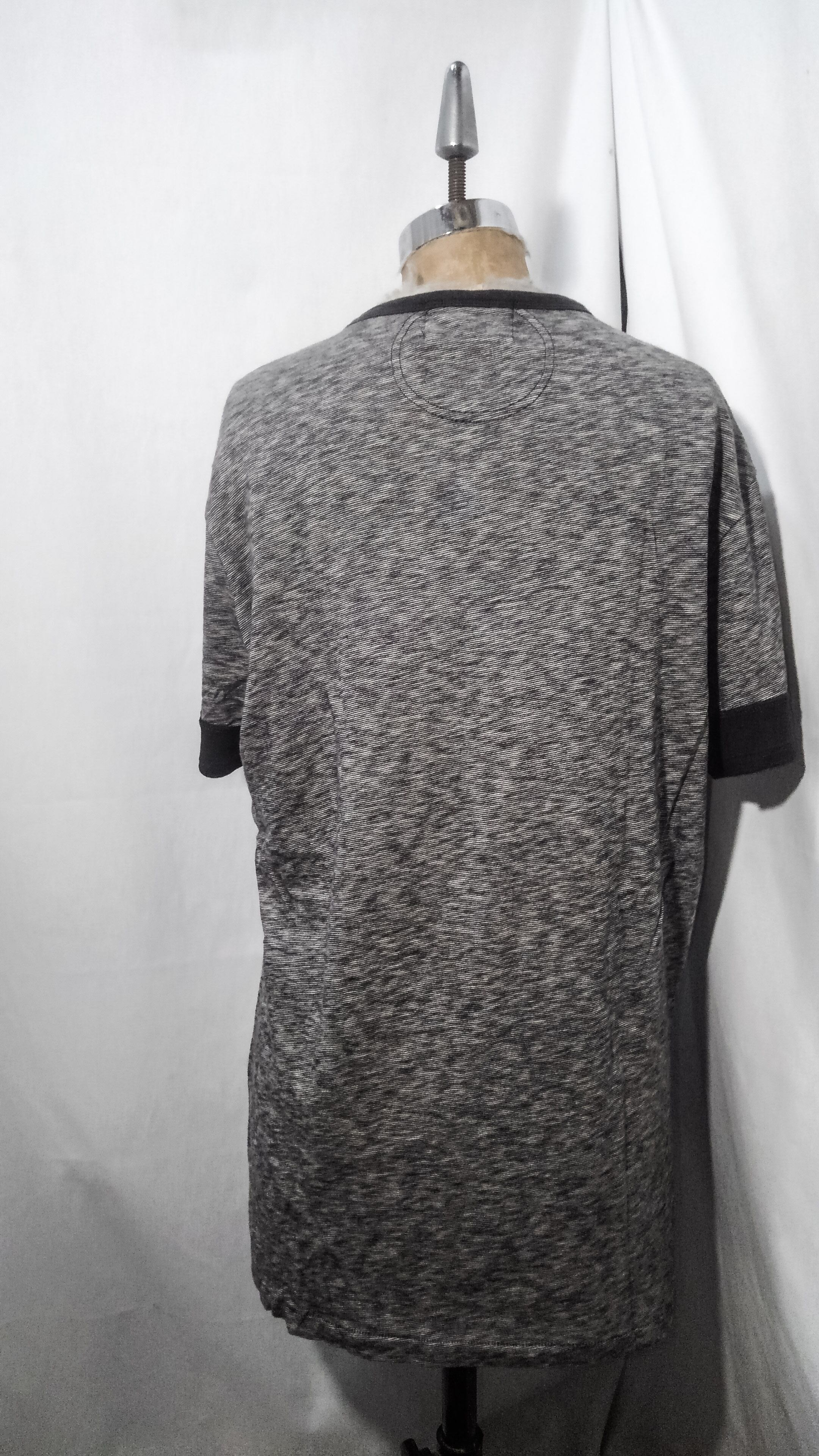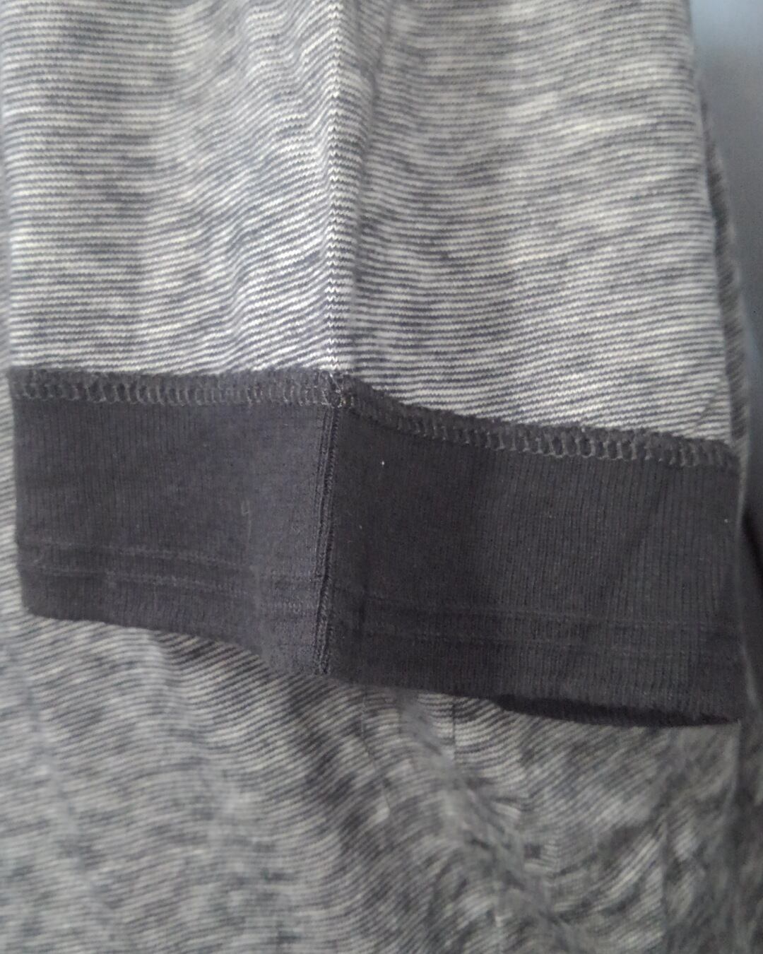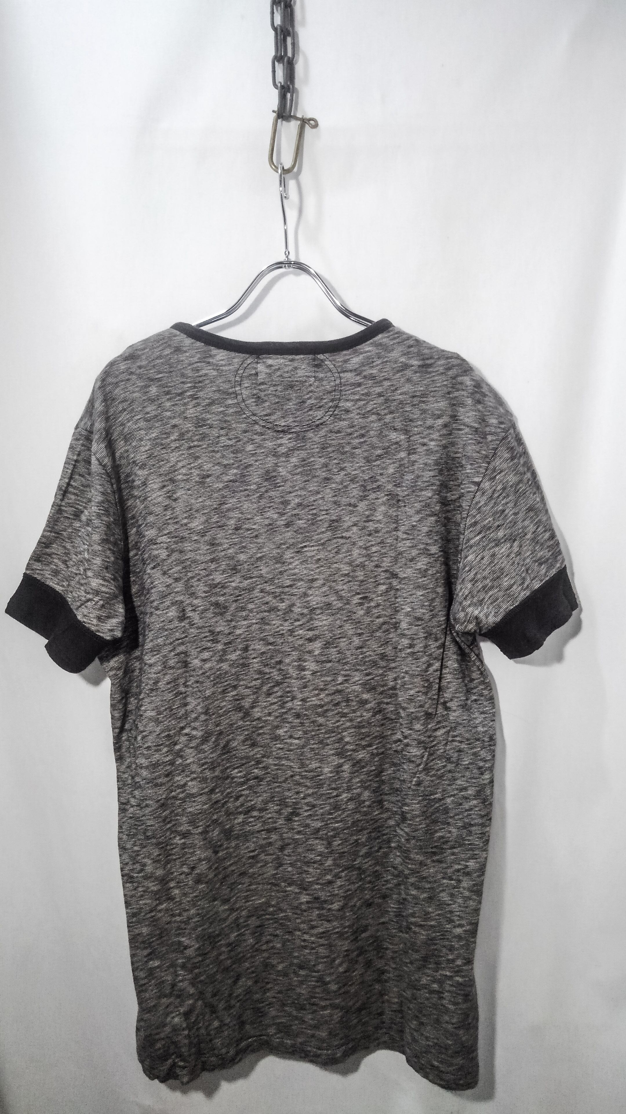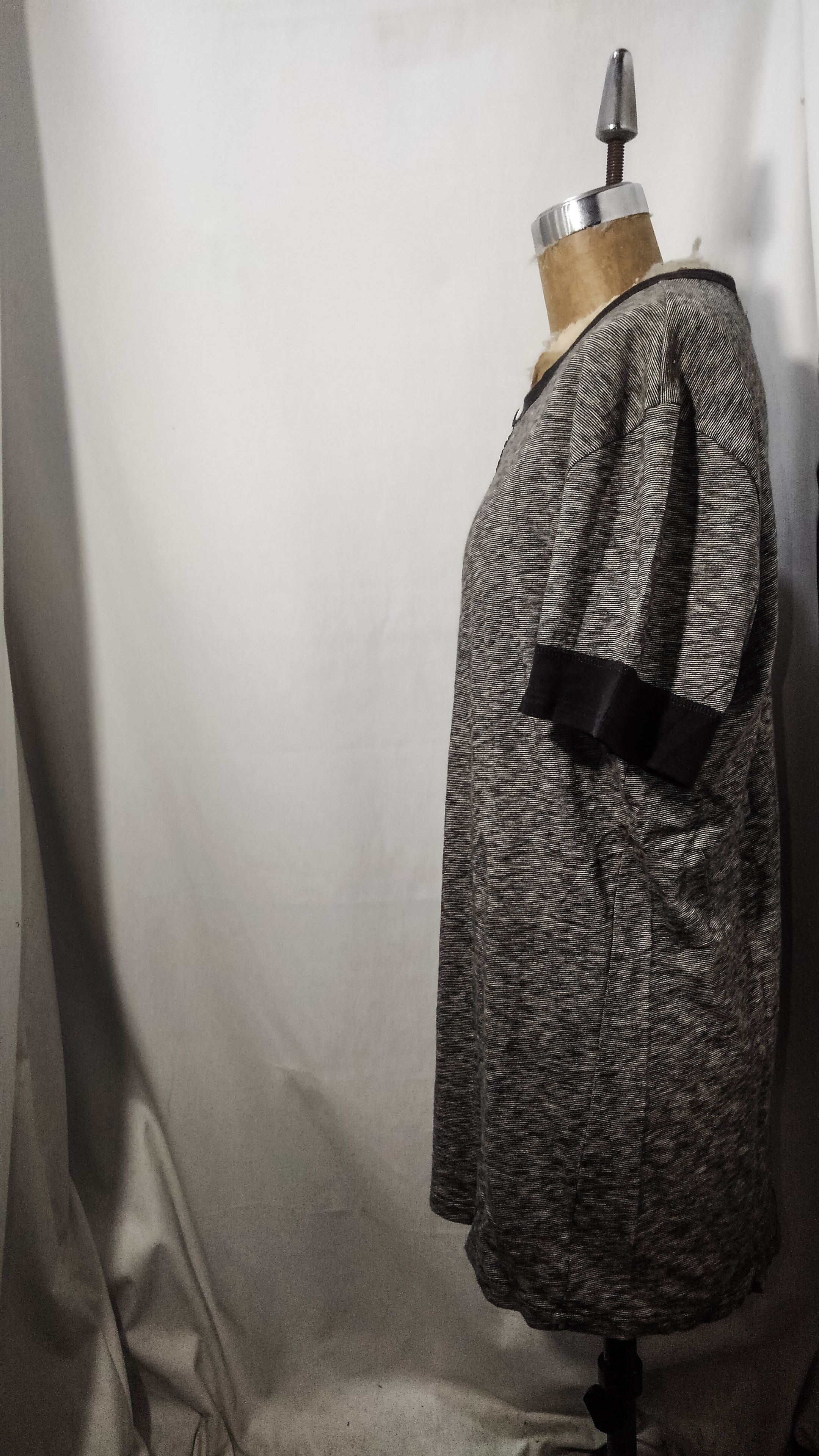 杢グレーのボディにダークブラウンのパイピングのヘンリーネックTシャツ。