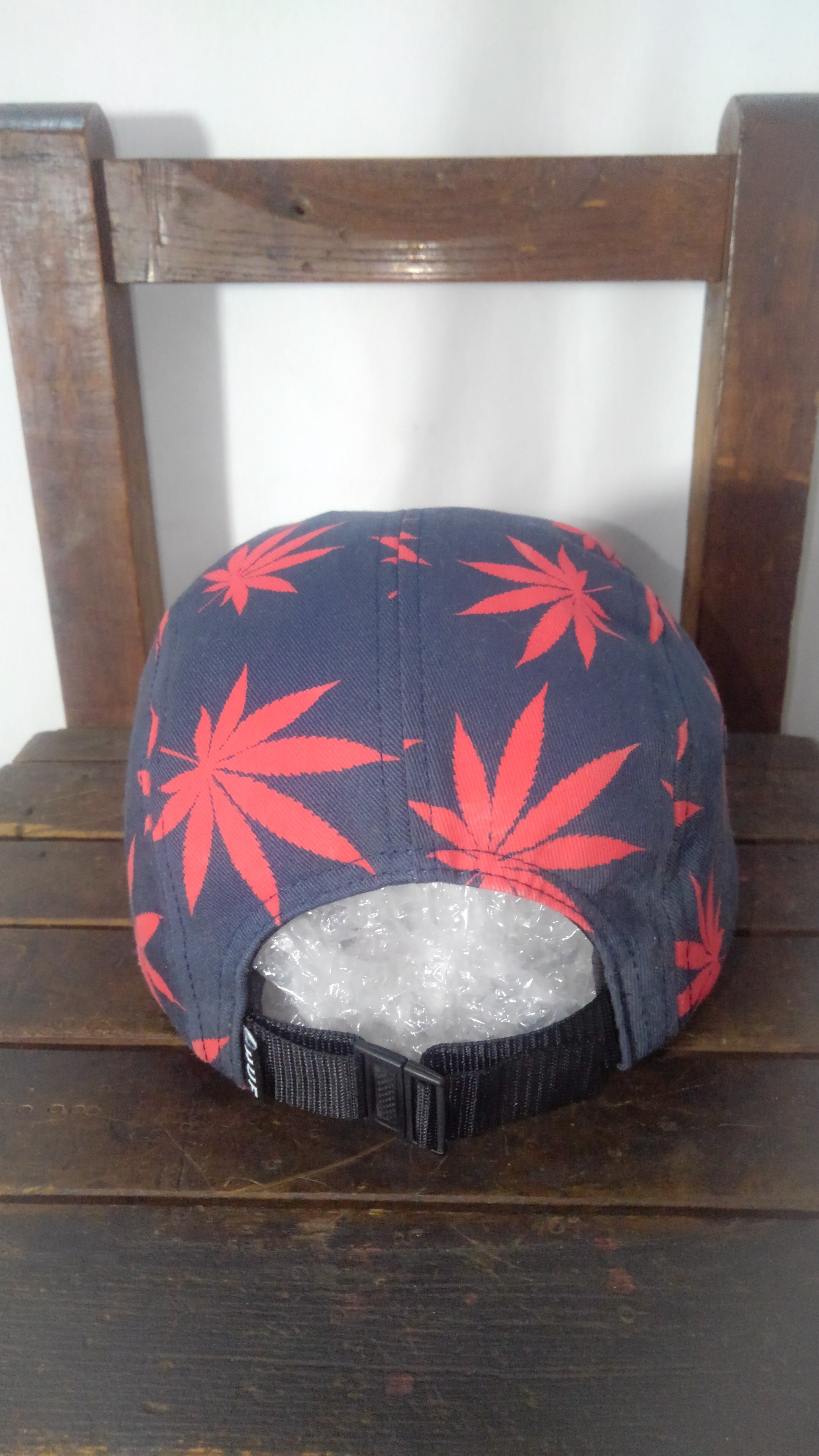 ネイビーベースの5パネルにレッドリーフが全体に施されたアメリカ製のジェットキャップ。