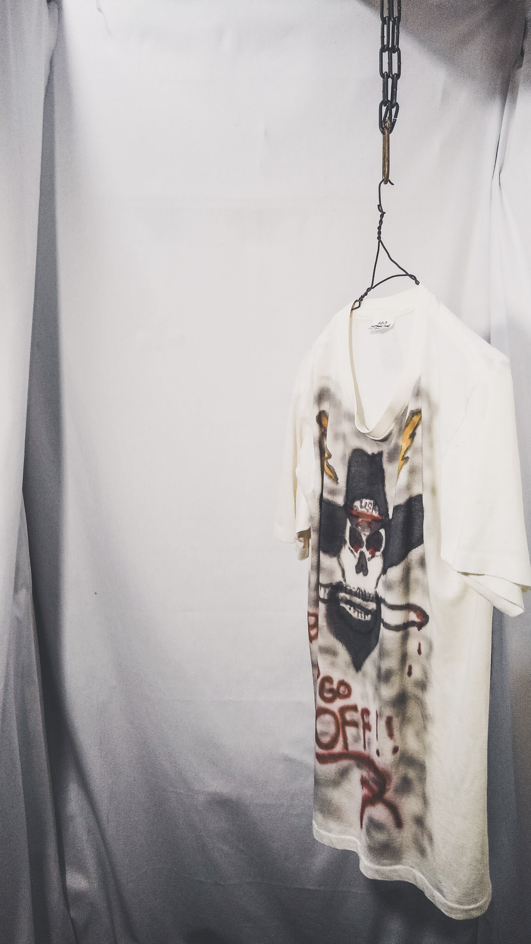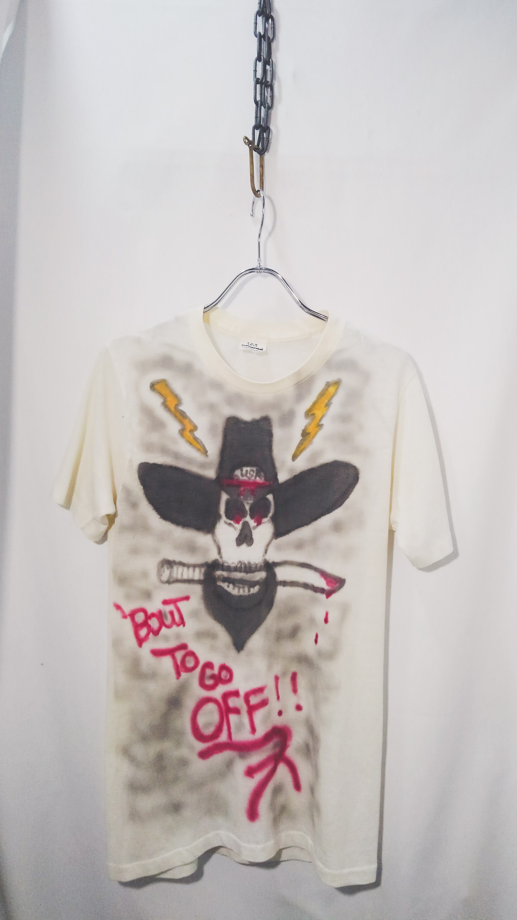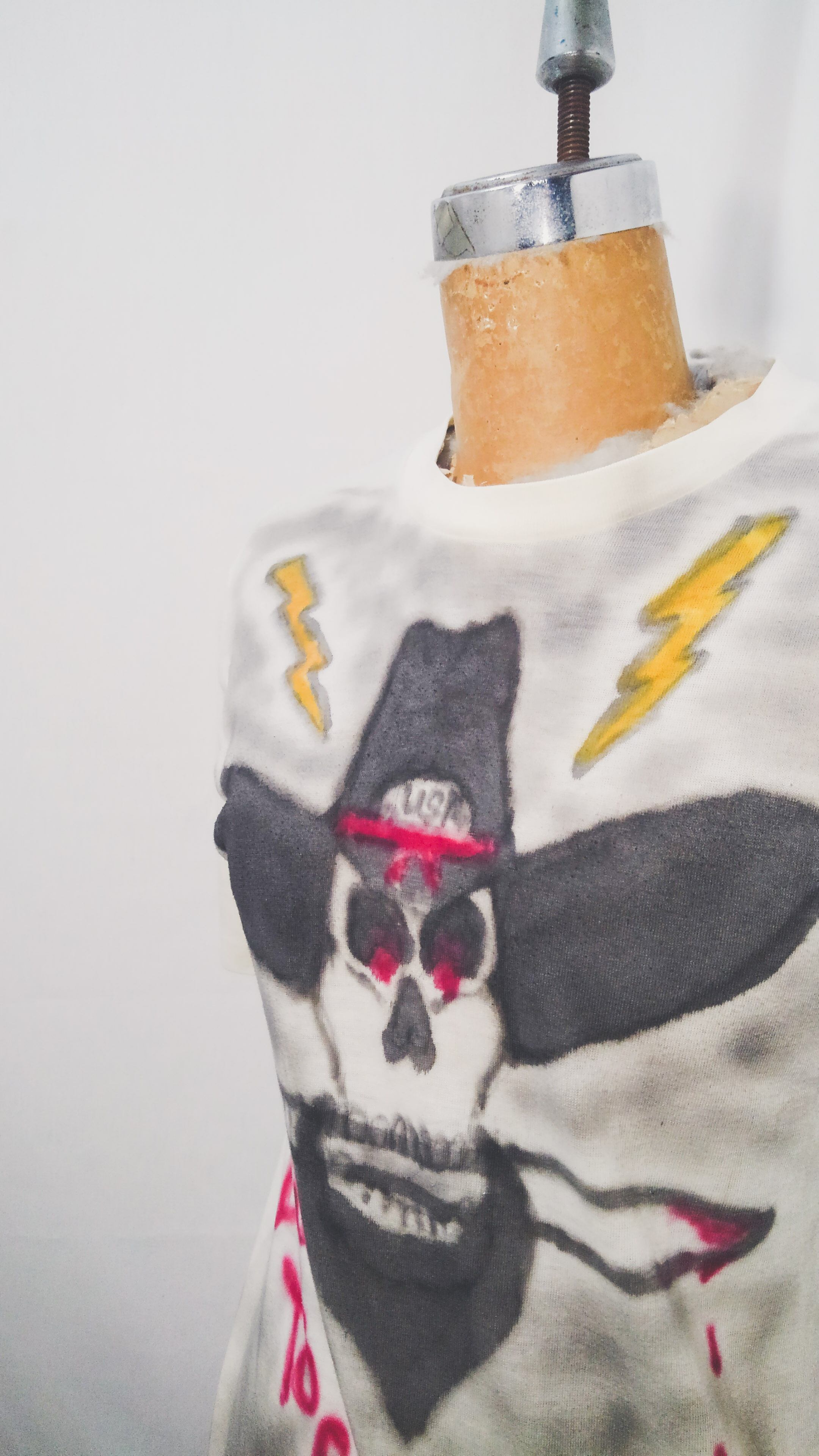 アメリカ製の丸胴シングルステッチのボディにハンドペイントで下手ウマなスカルペイントに