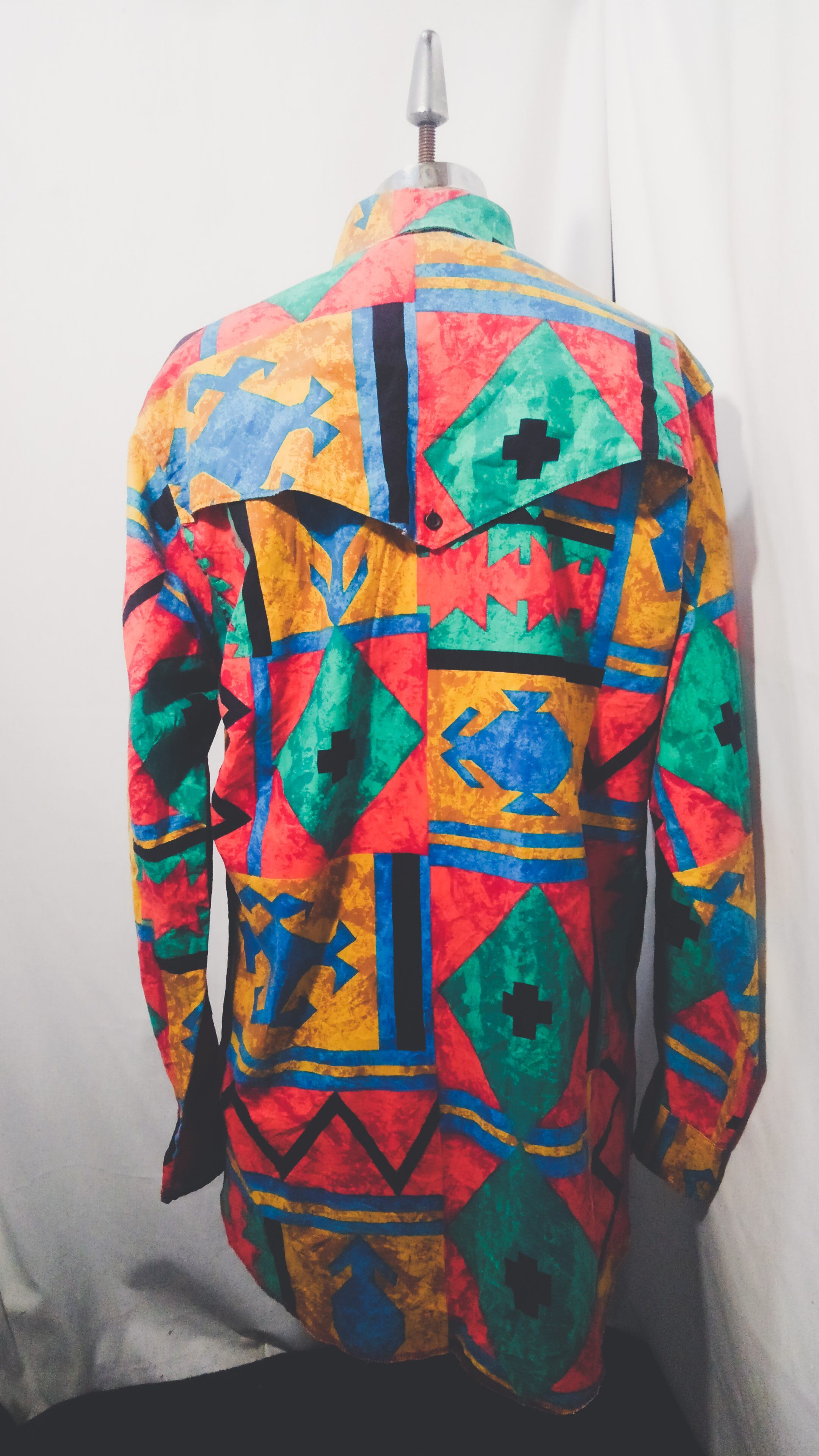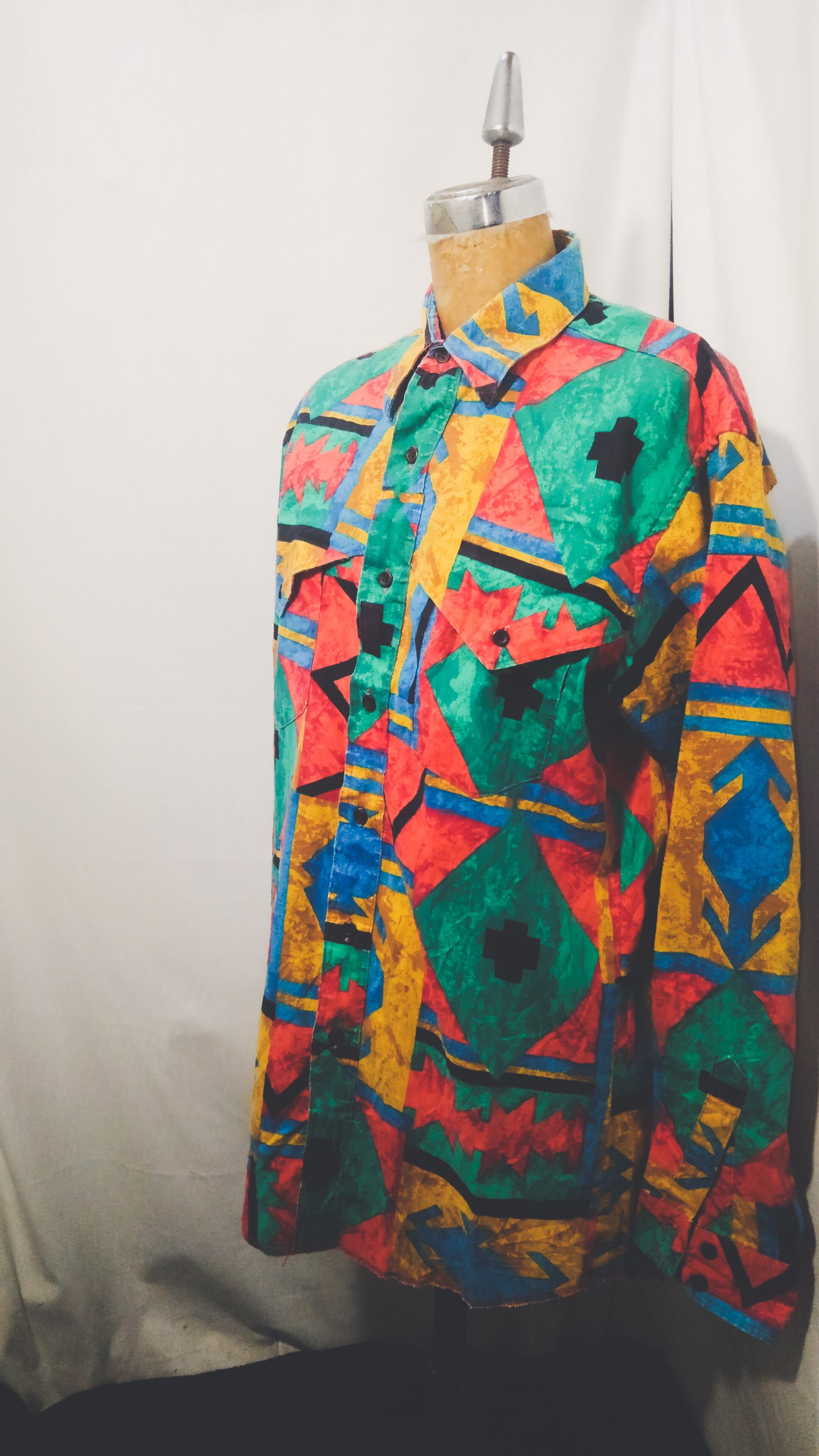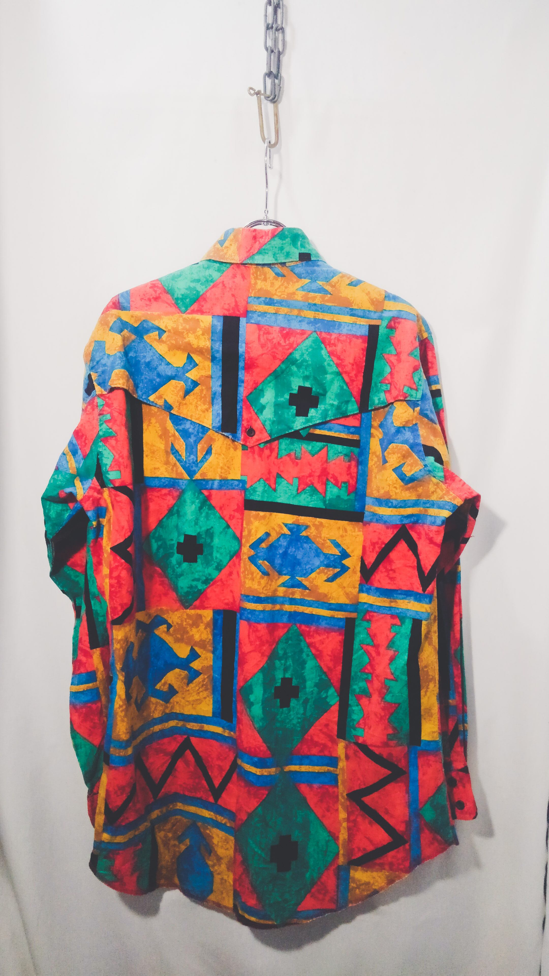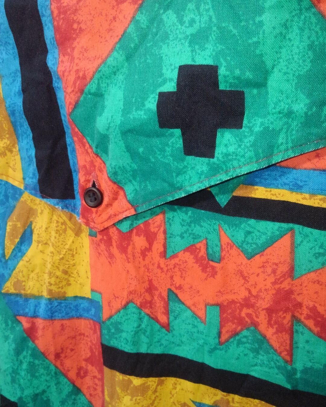 マルチカラー幾何学的なチマヨ柄が総柄で描かれアメリカ製コットンのラウンドカットタイプで一般的なウエスタンシャツと違い、スナップボタンではなく通常のボタンが使用されています。