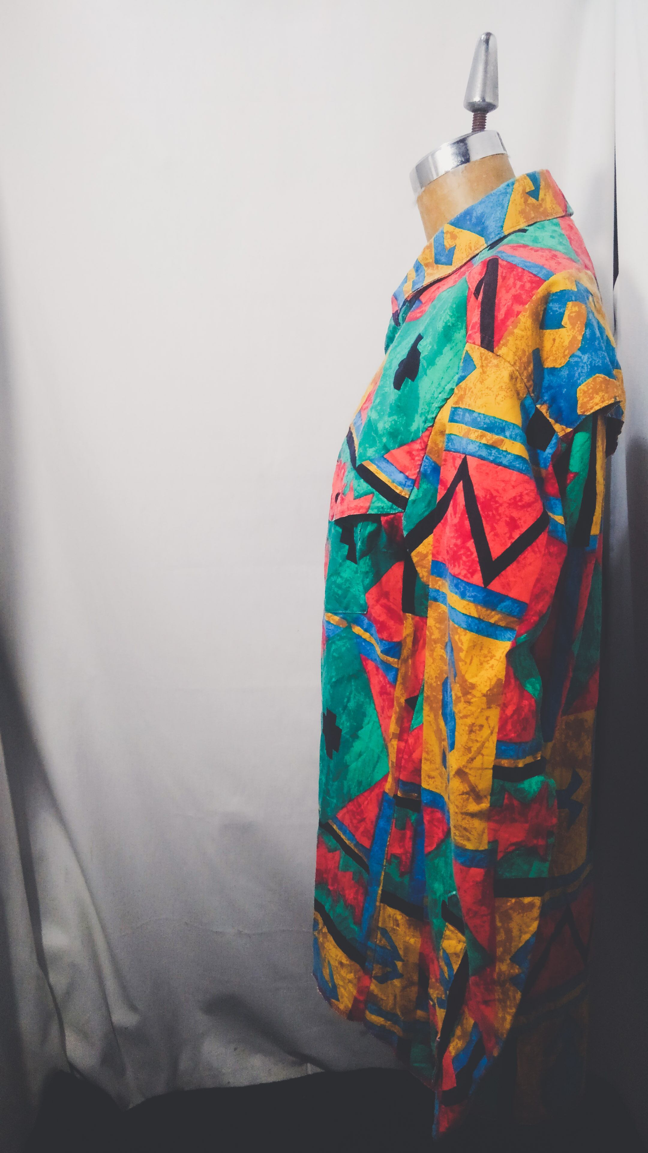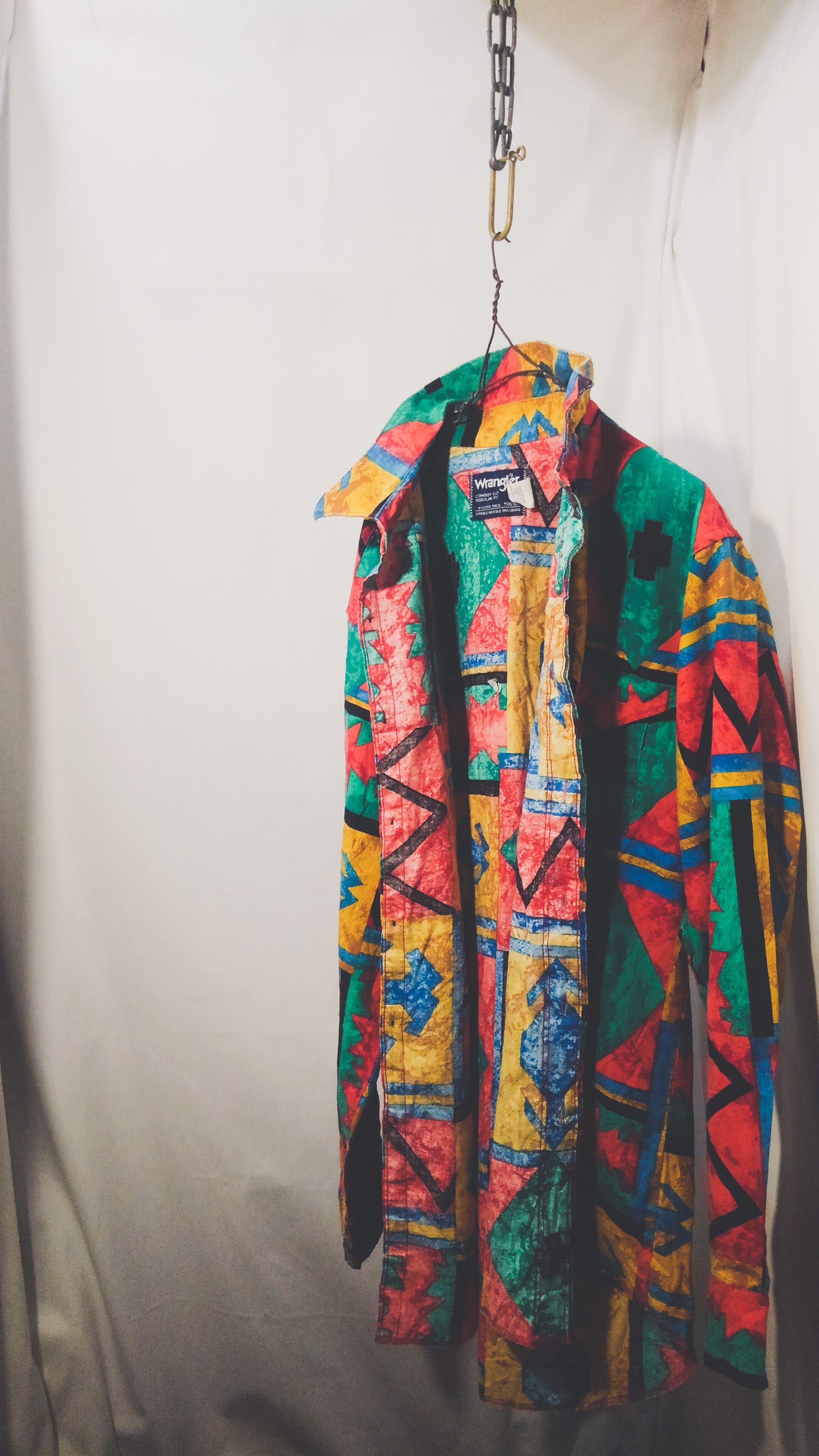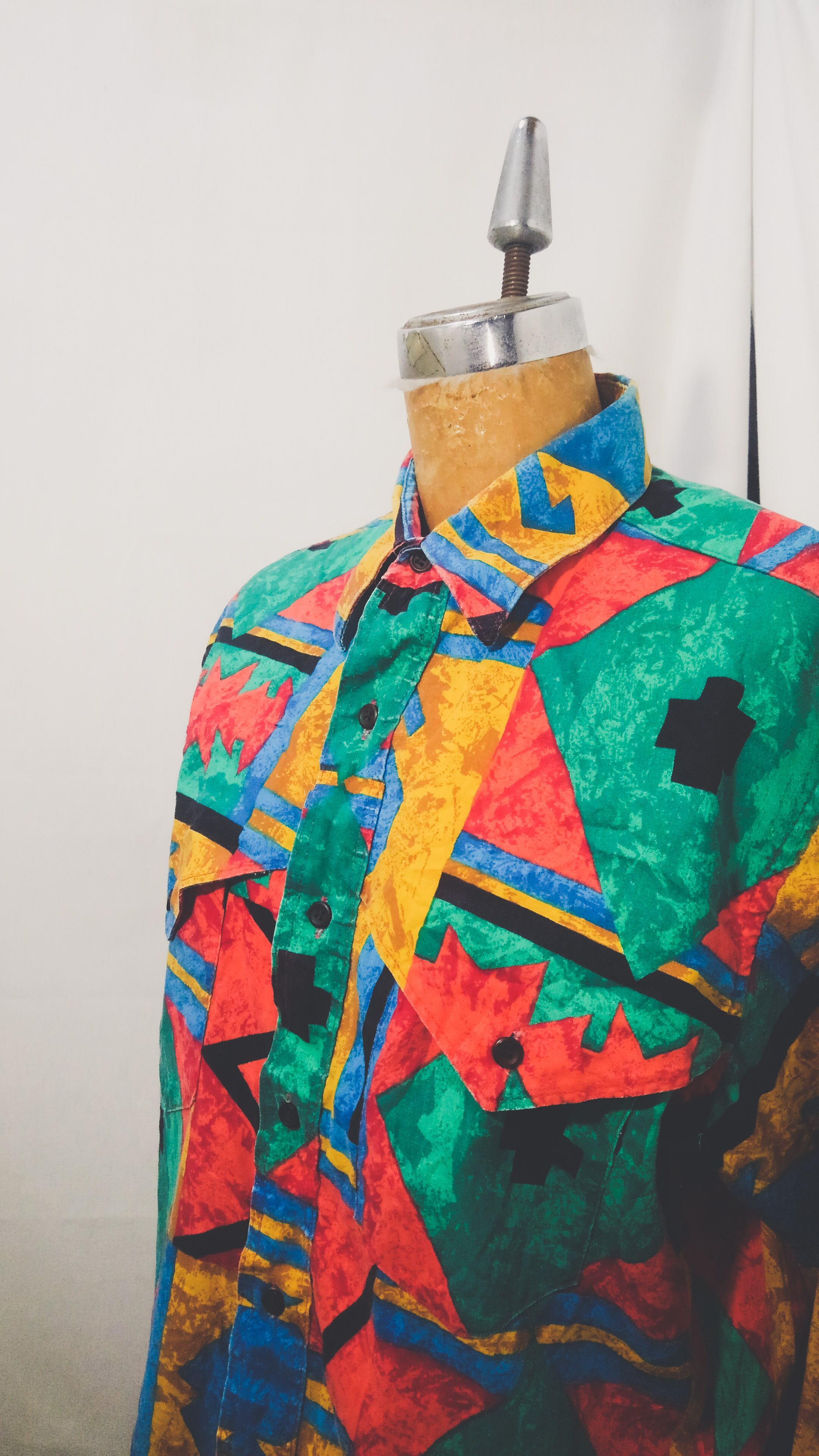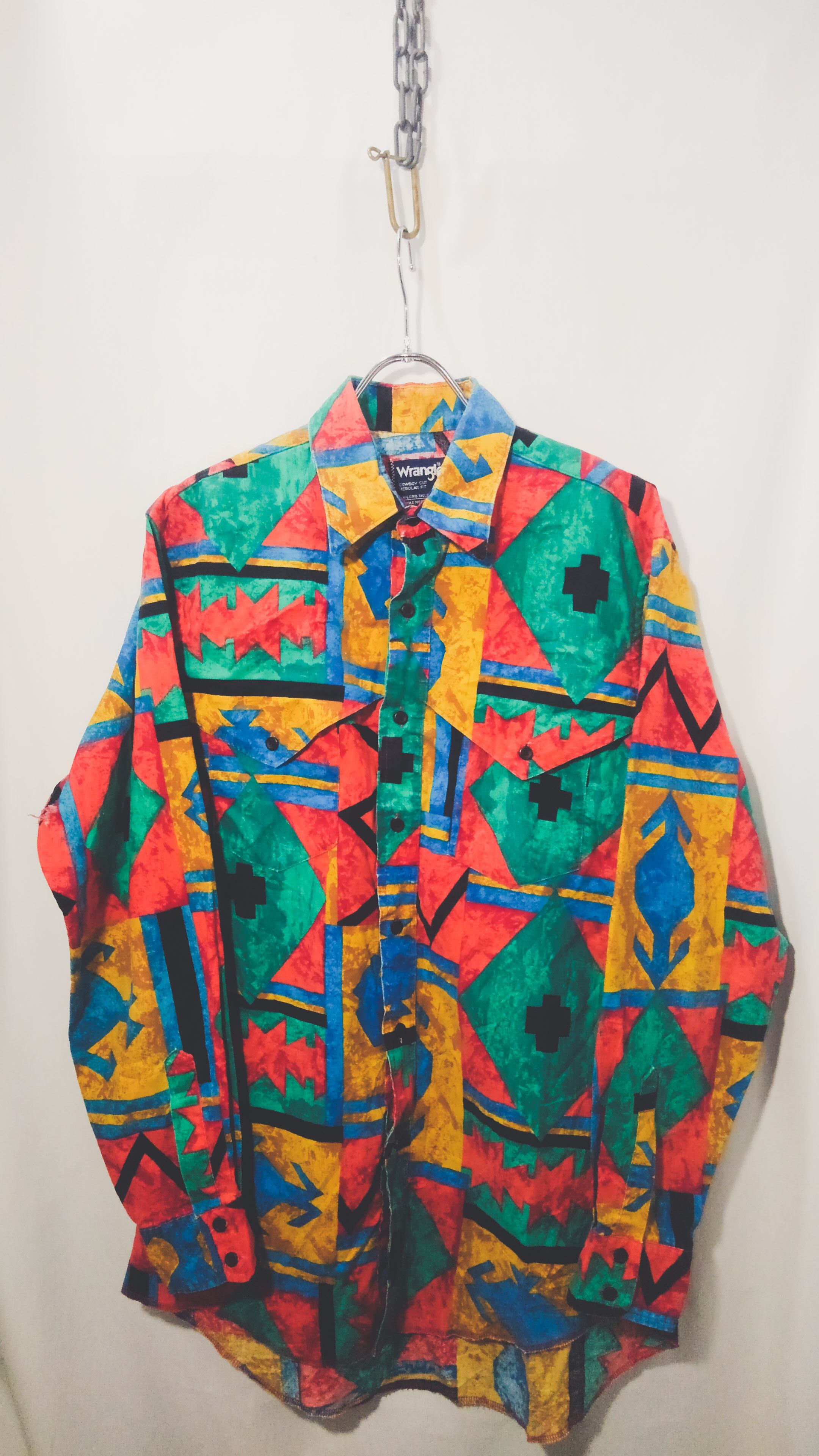 マルチカラー幾何学的なチマヨ柄が総柄で描かれアメリカ製コットンのラウンドカットタイプで一般的なウエスタンシャツと違い、スナップボタンではなく通常のボタンが使用されています。