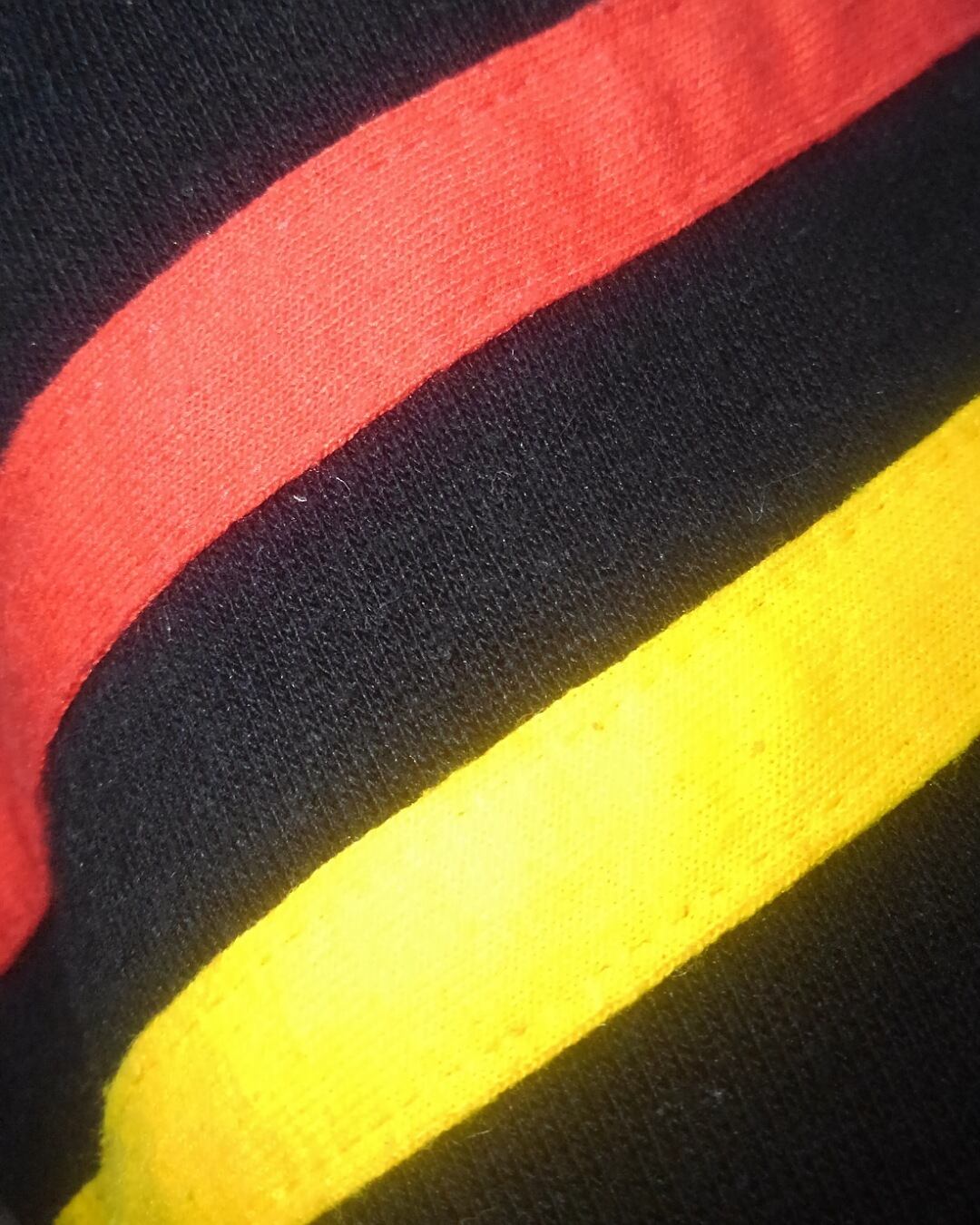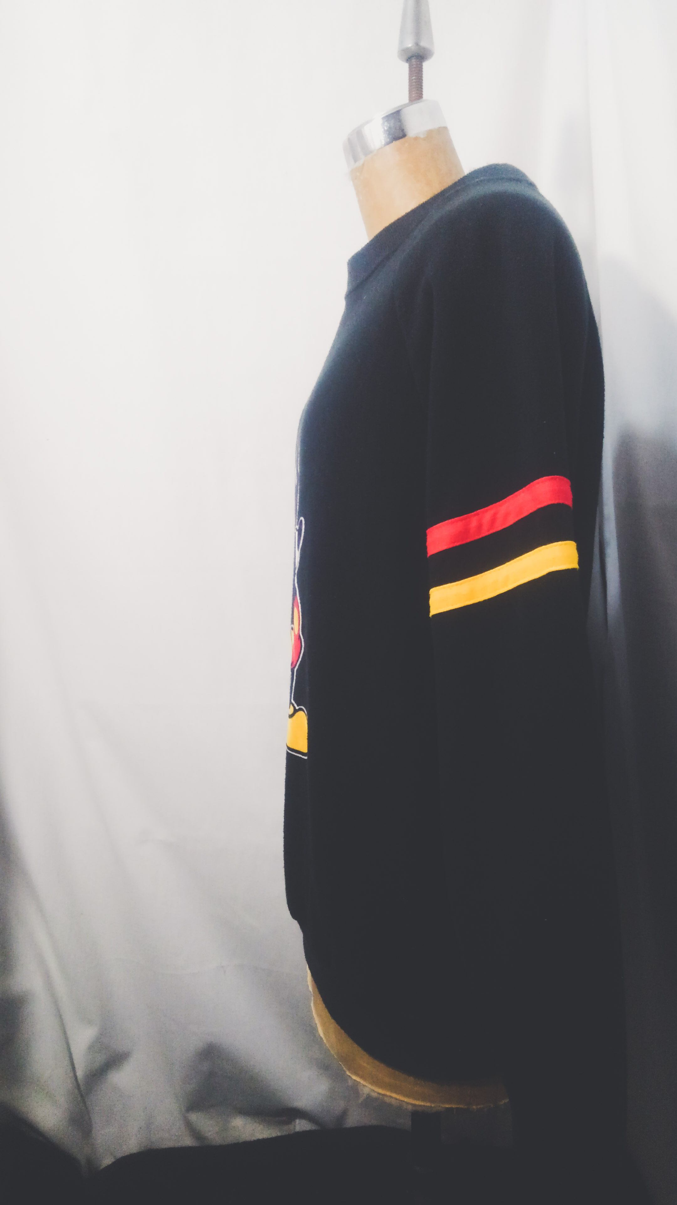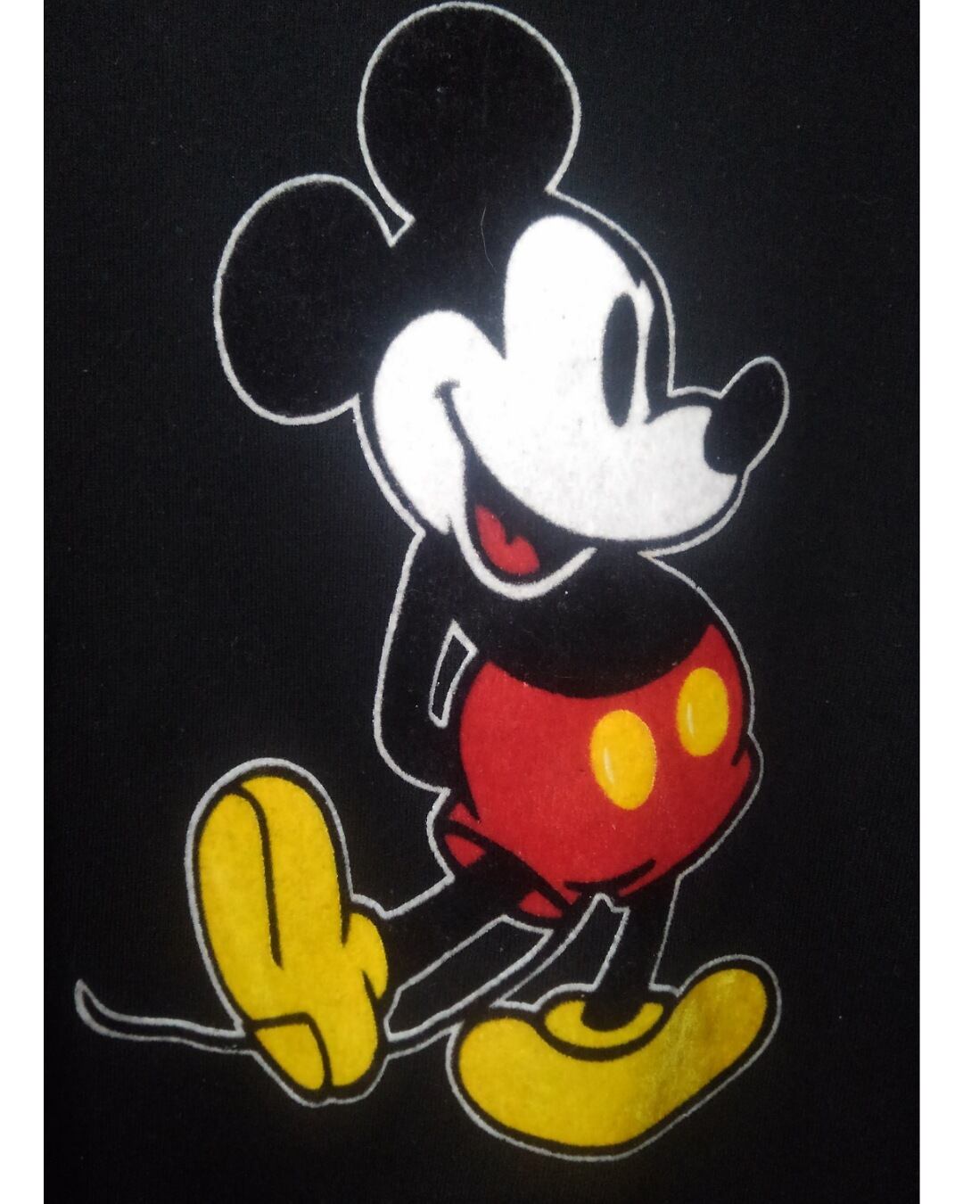 アメリカ製、丸胴のブラックボディのフロントにはフロッキープリントのオールドミッキー、両腕に赤×黄のテープラインがアクセントとして入っています。