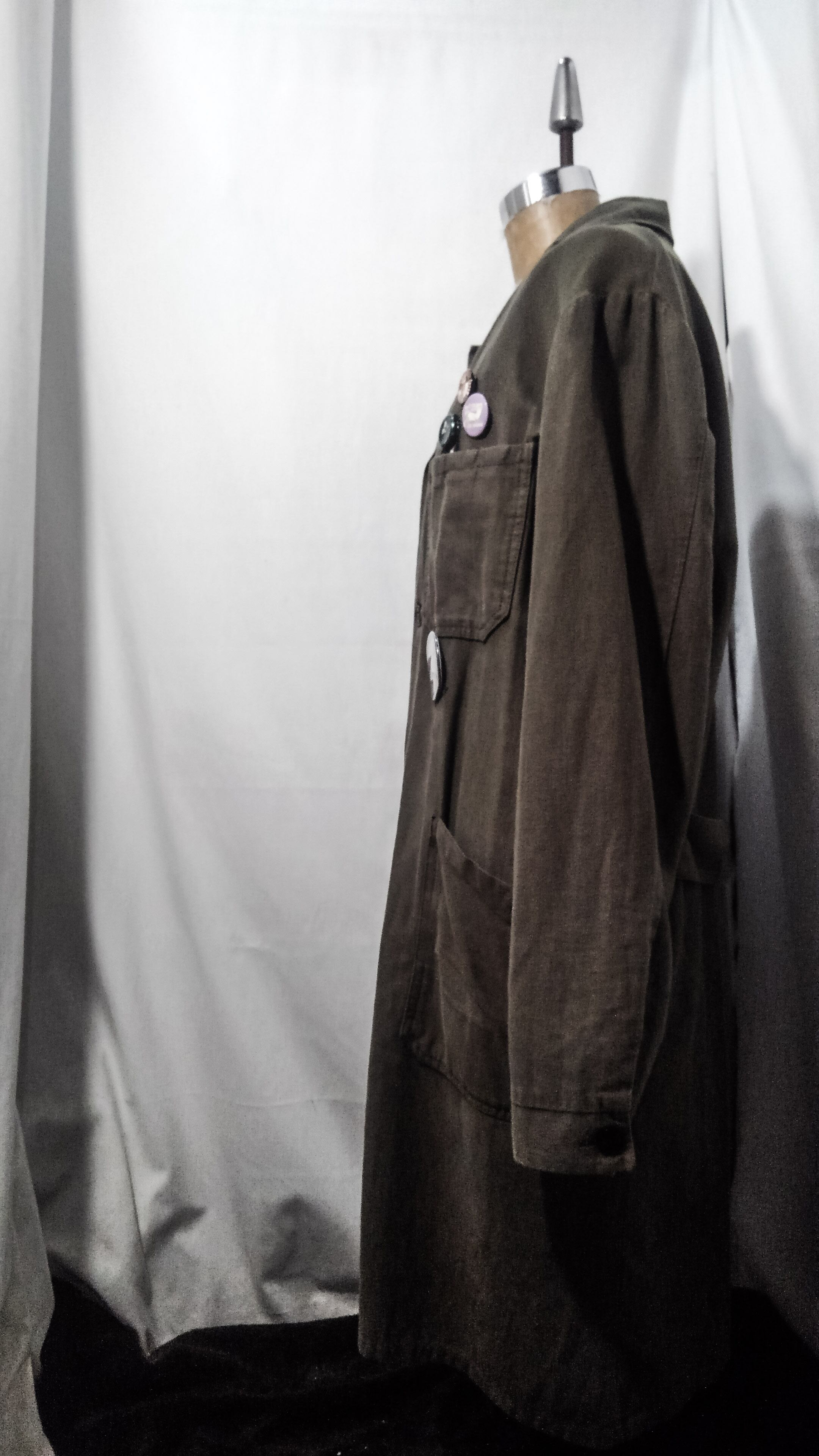 オリーブに近いダークブラウンの生地にブラウン系の艶のある飴色ボタンがアクセントになっていて、厚過ぎず薄過ぎずの素材なので年間を通して愛用いただけ、程よい着丈はさらっと羽織るだけで様になります。