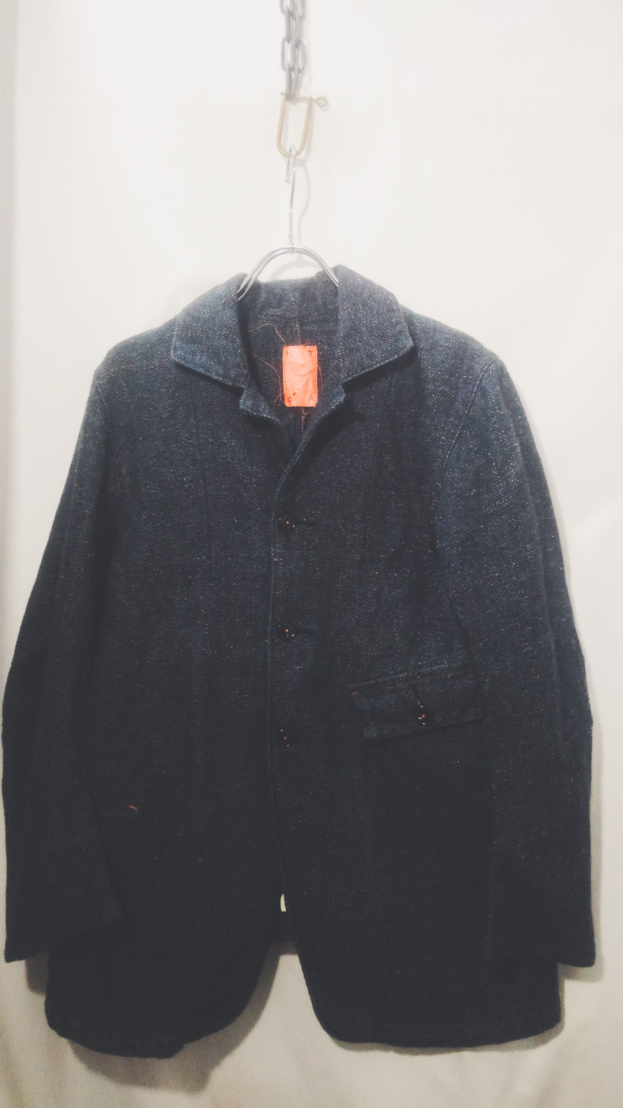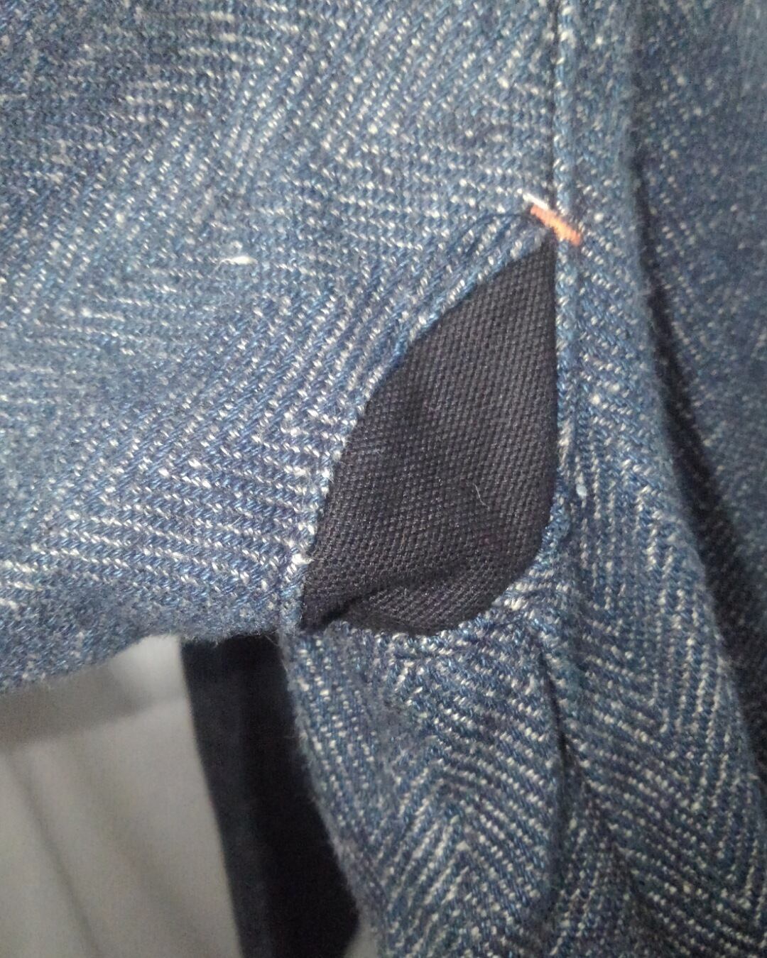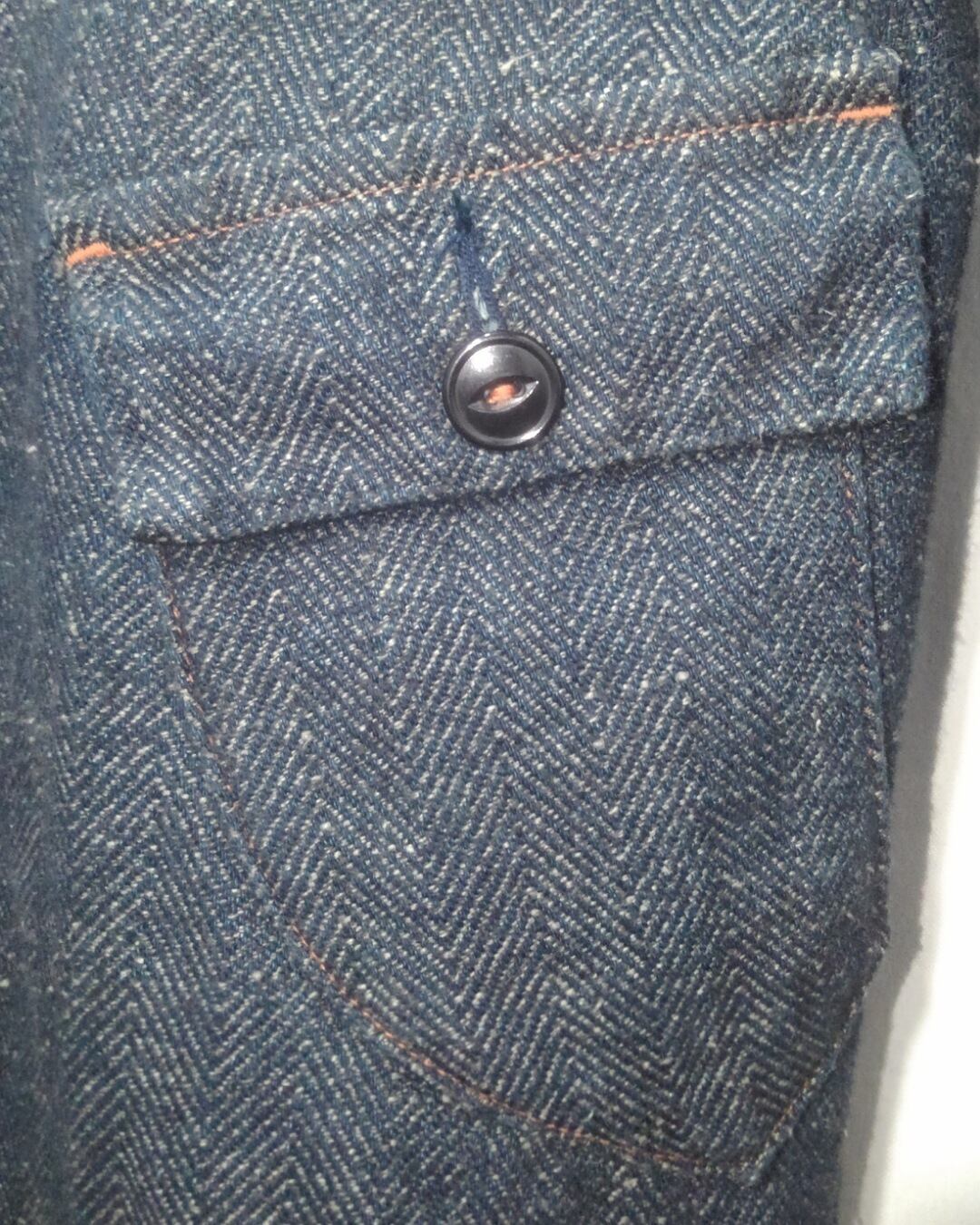脇下にはマチが付いていて、腕の可動域を広げる工夫が施され、他ディテールとしてはフロントの猫目ボタンとインディゴ生地にオレンジステッチがアクセントになっています。