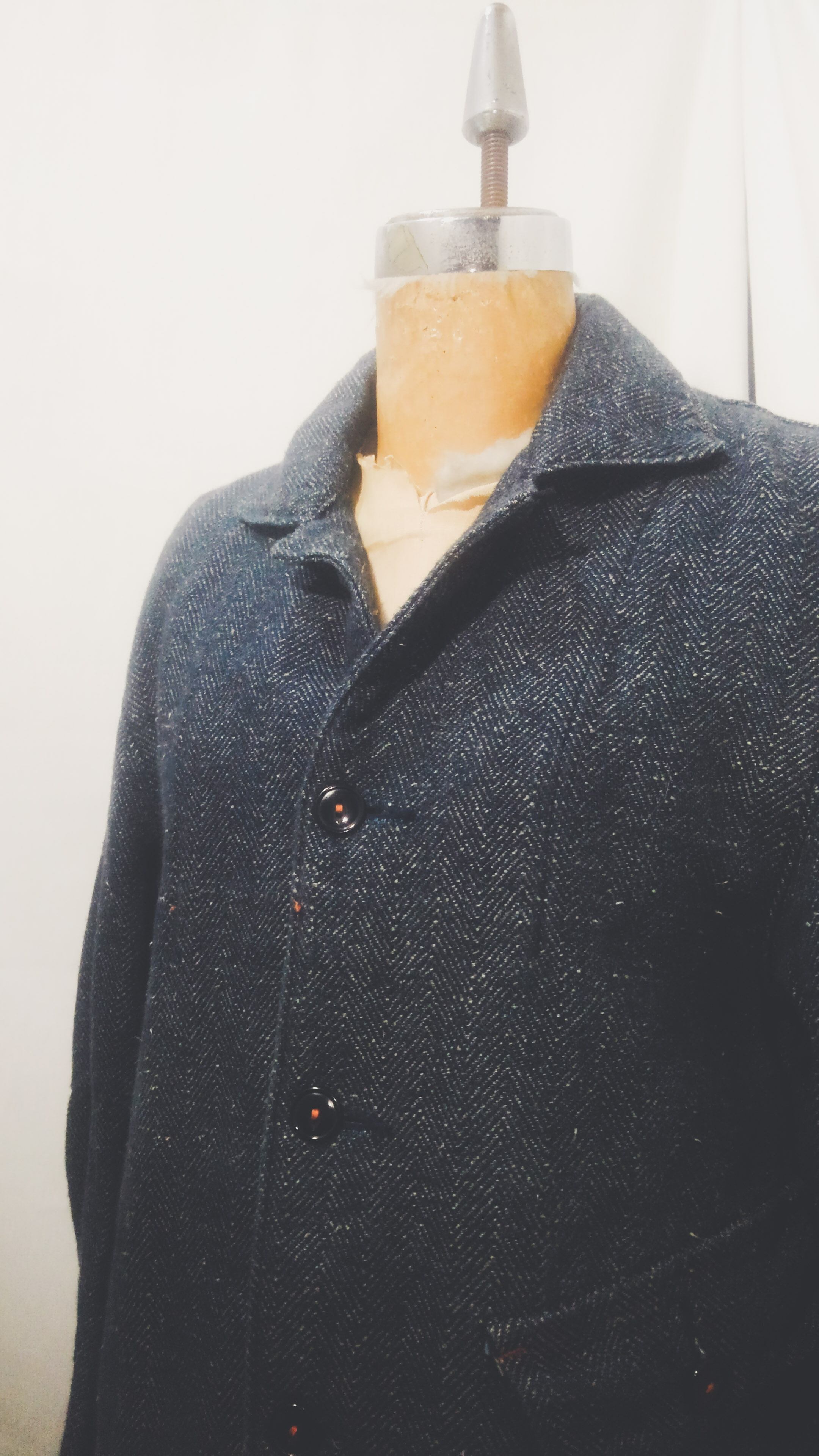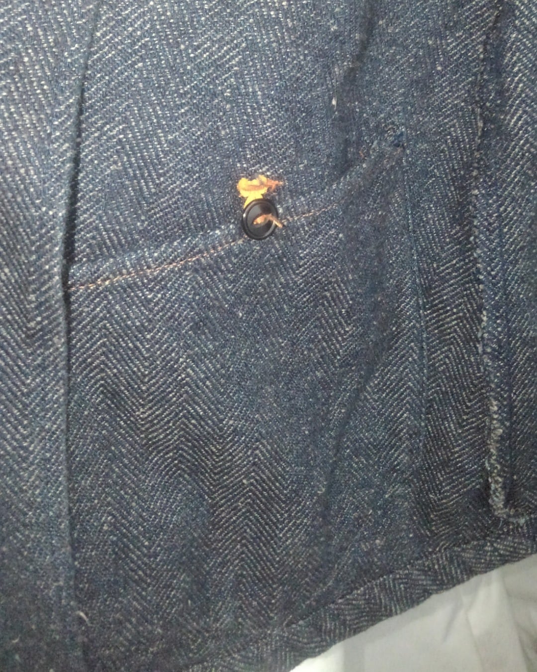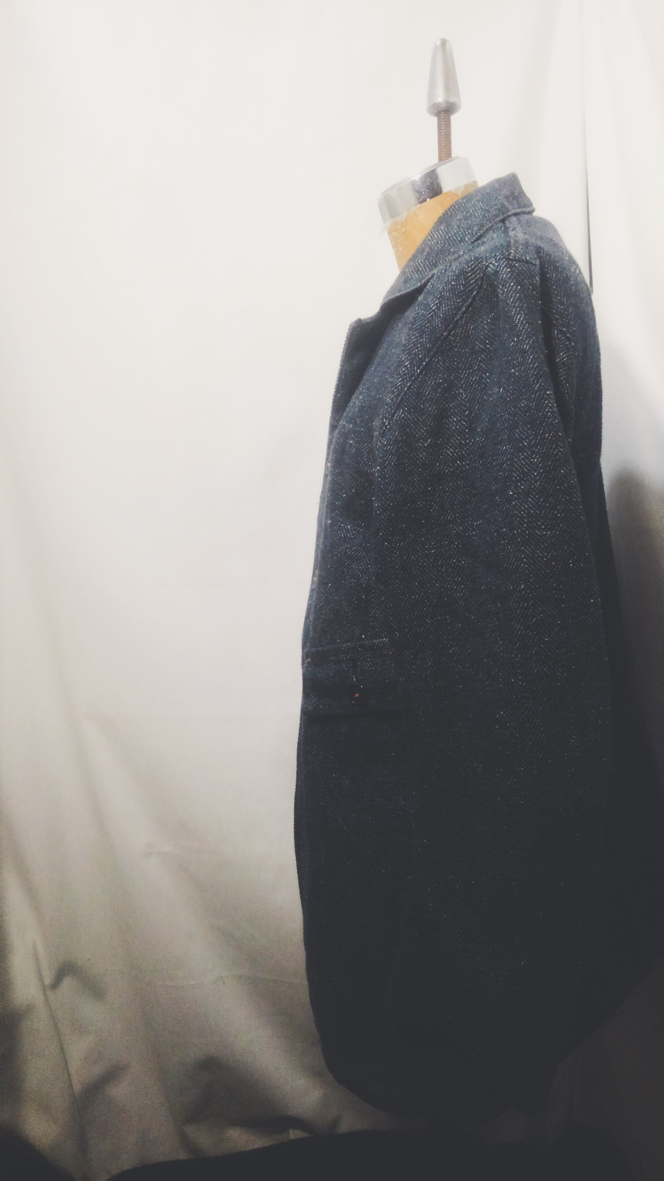脇下にはマチが付いていて、腕の可動域を広げる工夫が施され、他ディテールとしてはフロントの猫目ボタンとインディゴ生地にオレンジステッチがアクセントになっています。