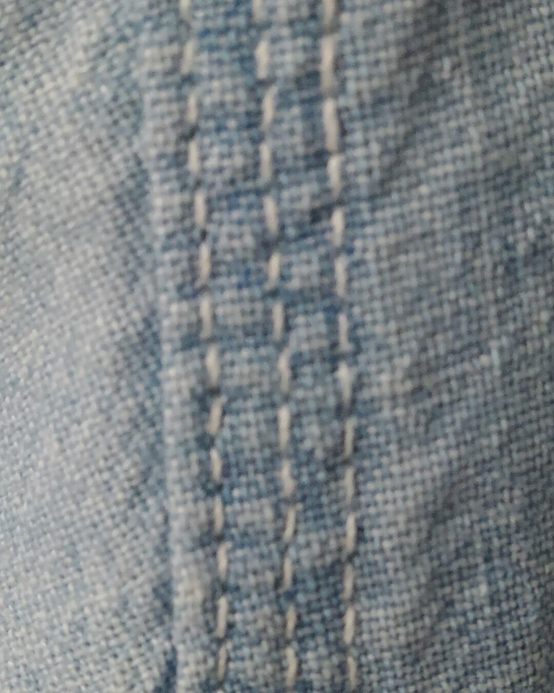 ポケットはフラップ無し、トリプルステッチの縫製でプラスチック製の黒ボタン、裾のマチなど当時のワークシャツのデイテールは押さえてあります。