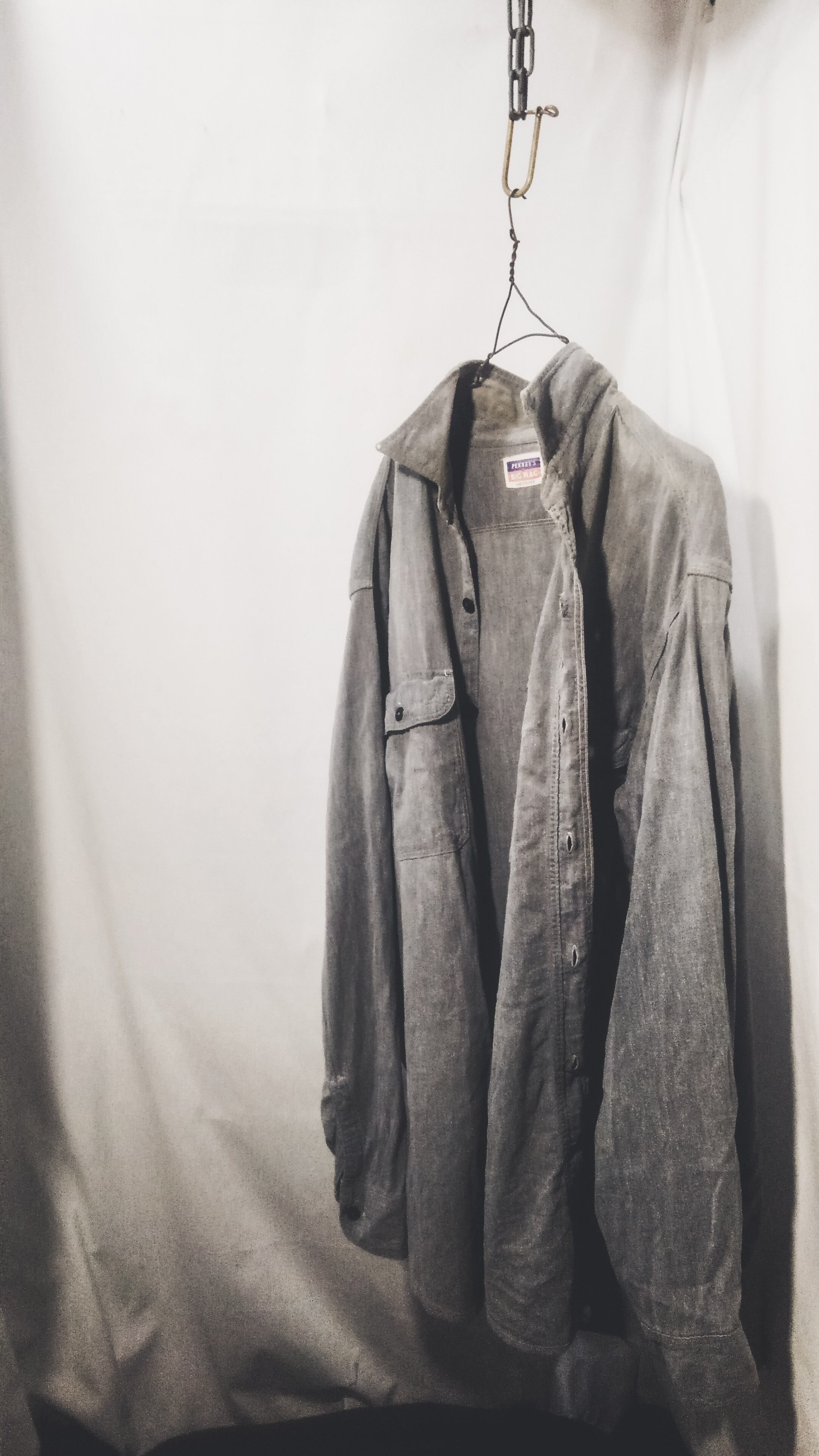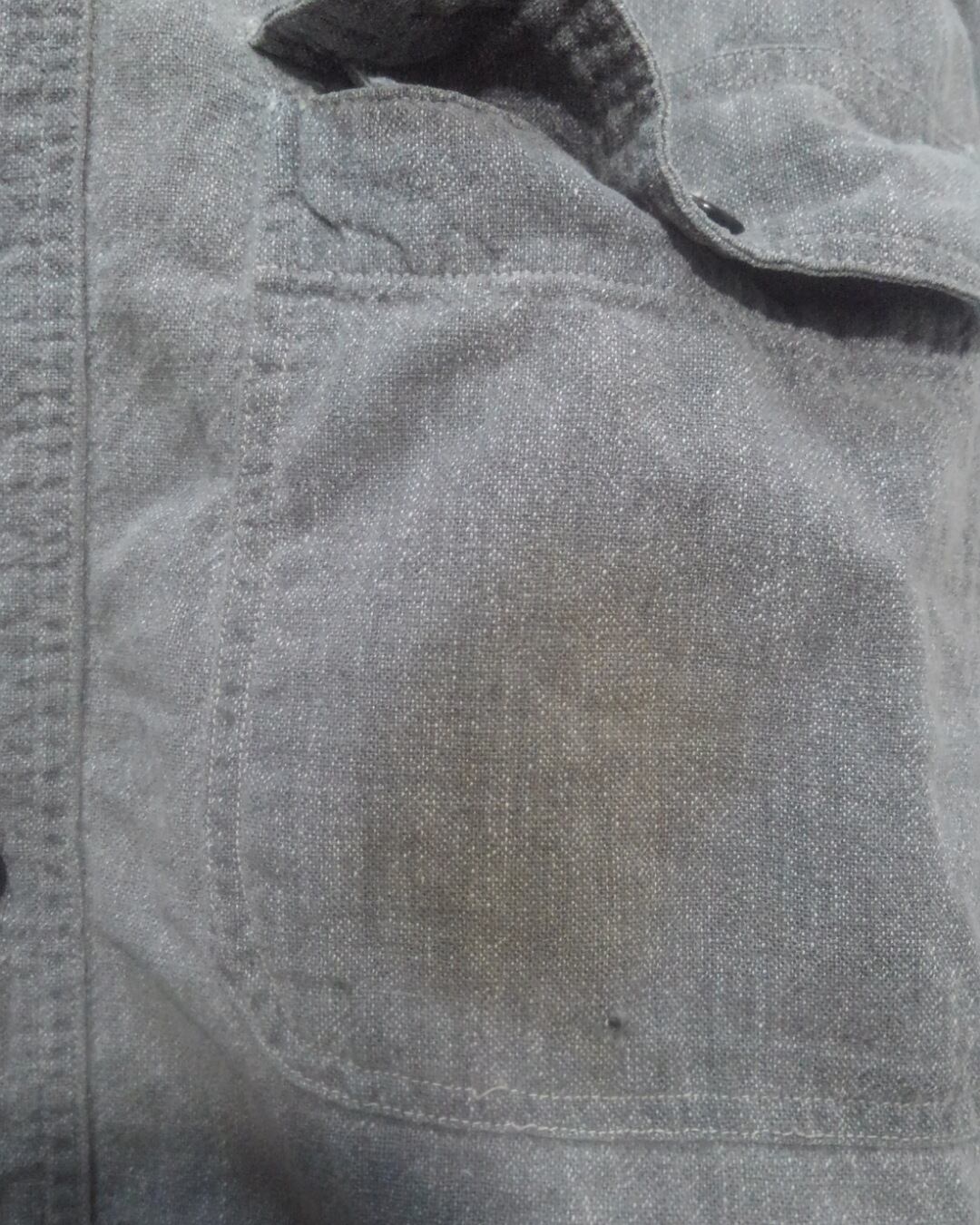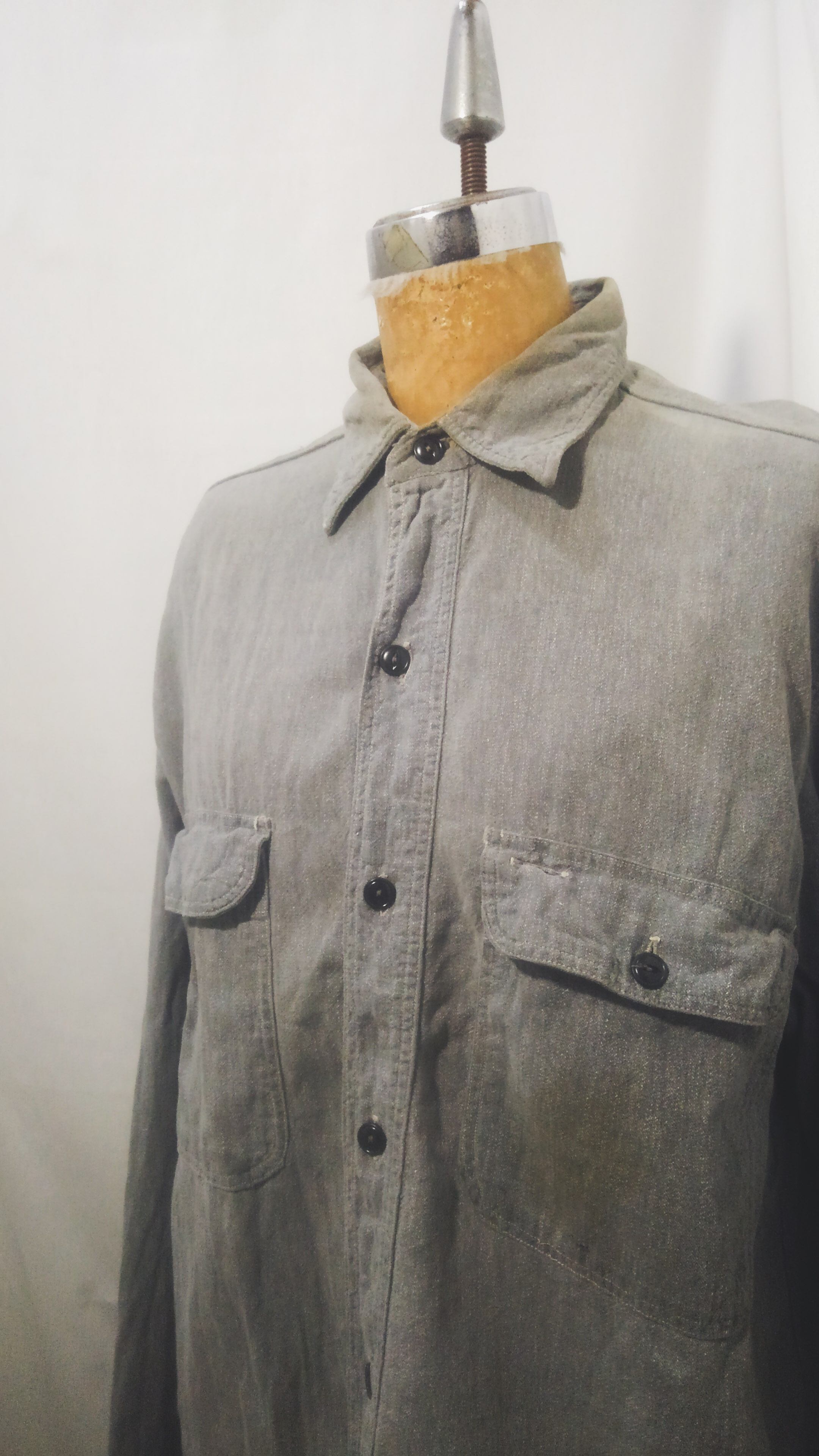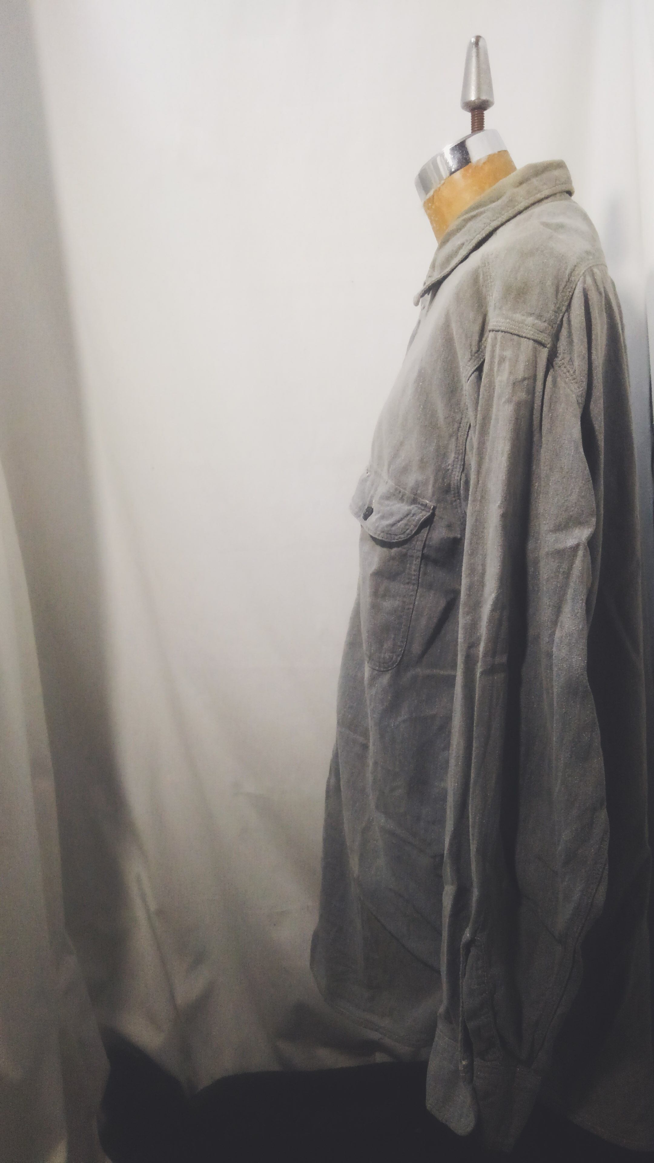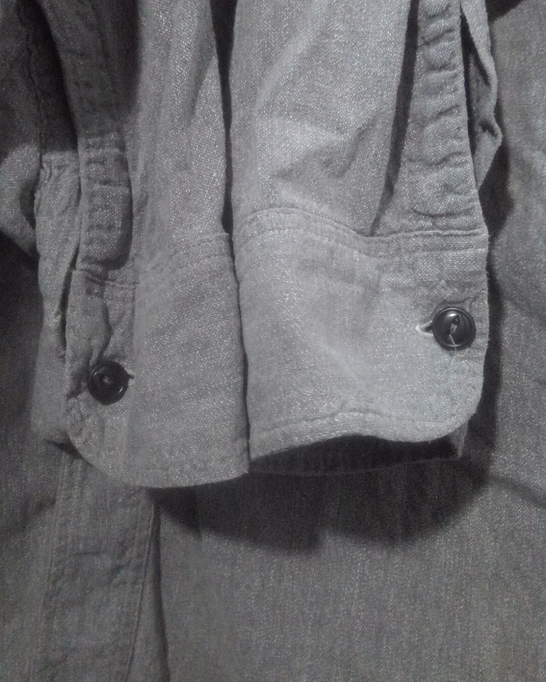 マチ付きの着丈の長い綺麗なシルエットでワークウェア特有のトリプルステッチ、ラウンドフラップの胸ポケ、猫目ボタン、形の良い小ぶりな襟とビンテージならではのディテール。