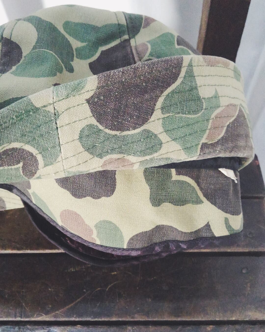 迷彩柄の中でも定番のダックハンターカモがプリントされ、裏地はキルティング加工、ブリムのフロント部分にベースボールキャップの様な芯で補強がされ、ブリムを折り返してもフロント部分は固定される丈夫な作りになっています。